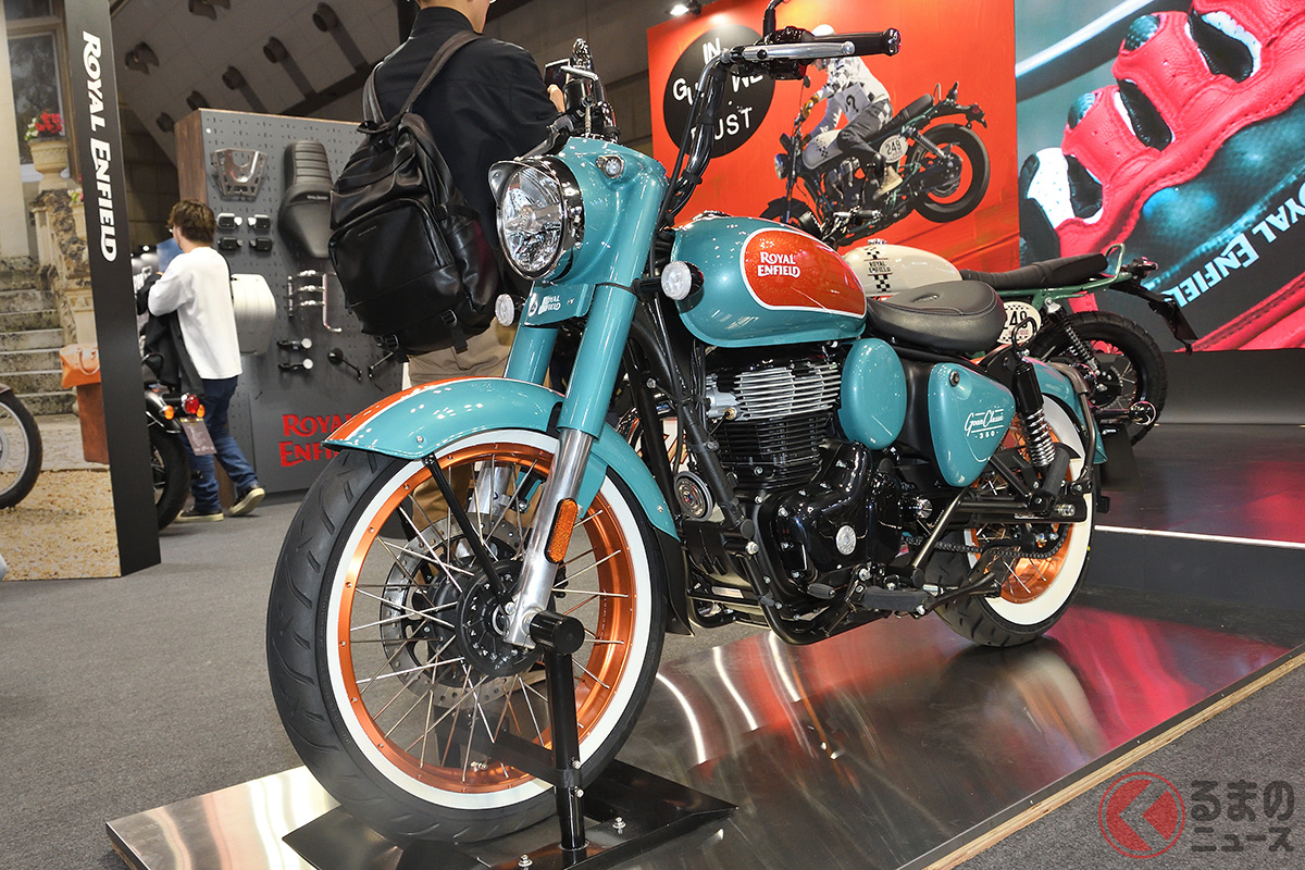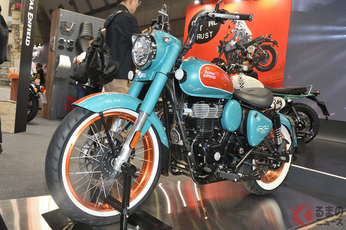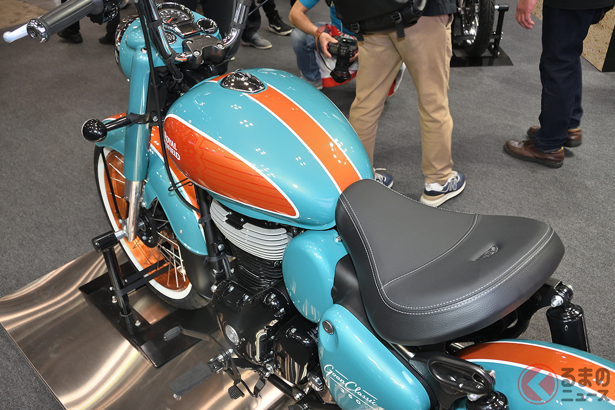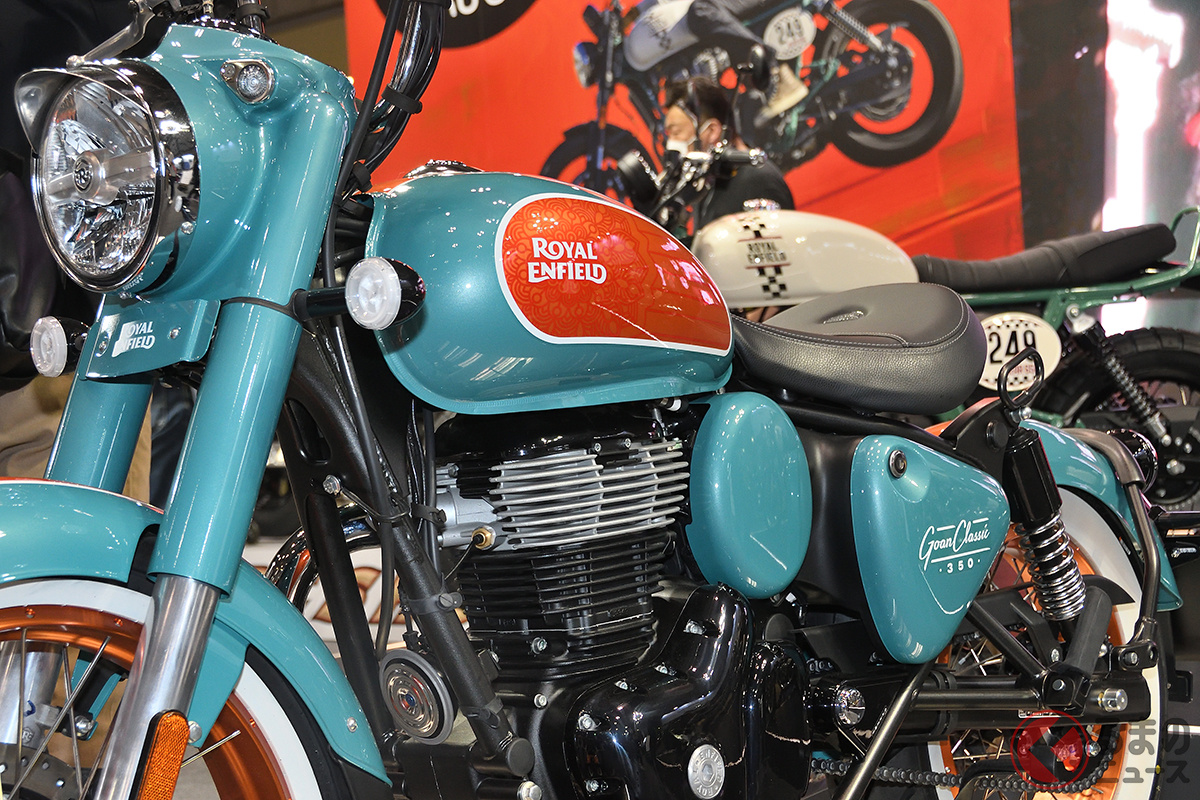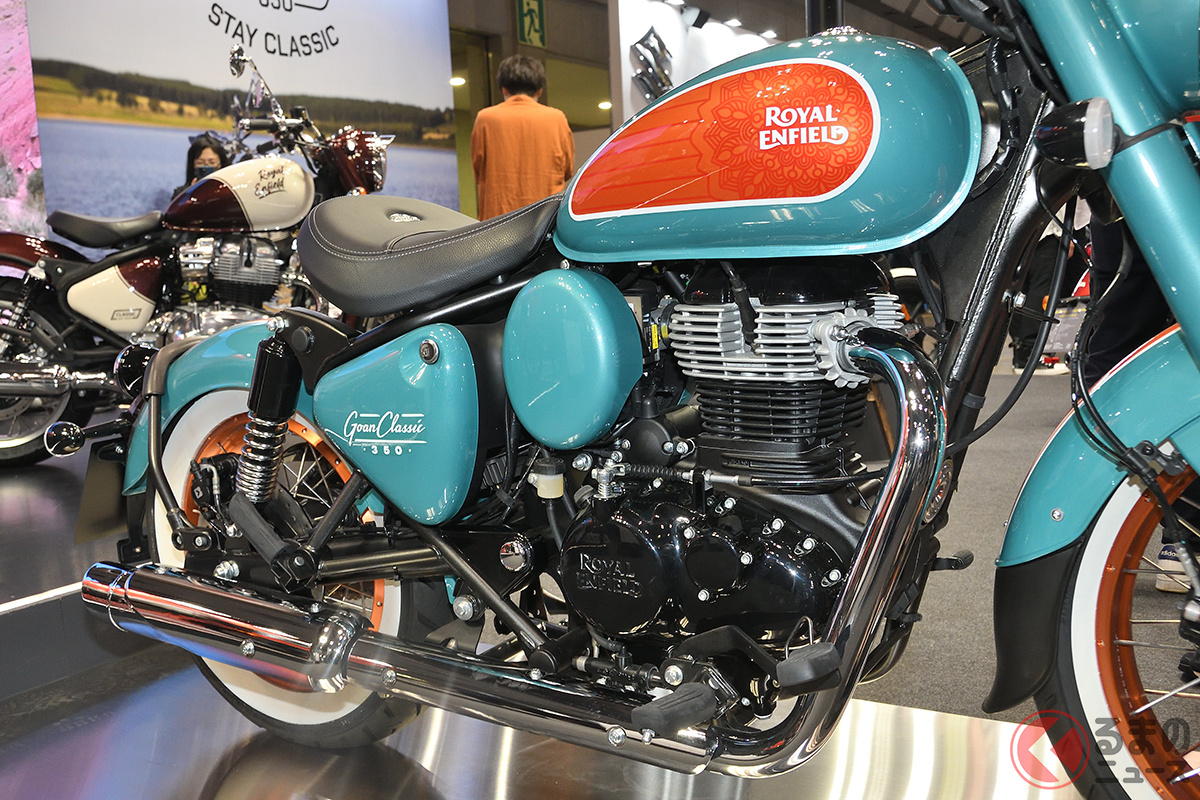 ロイヤルエンフィールド新型「ネオクラシックバイク」実車展示! 斬新カラー&ローシートがチルい! ボバースタイルの「ゴアンクラシック350」登場!