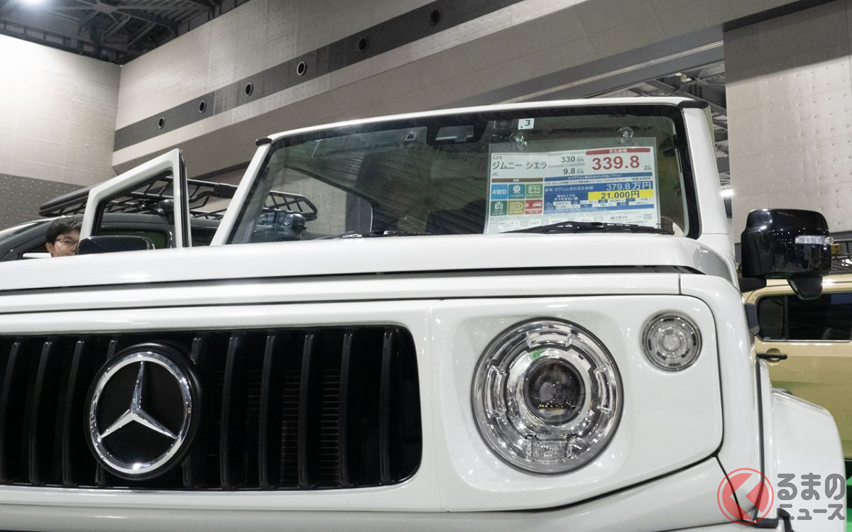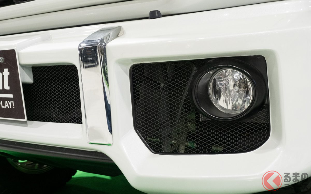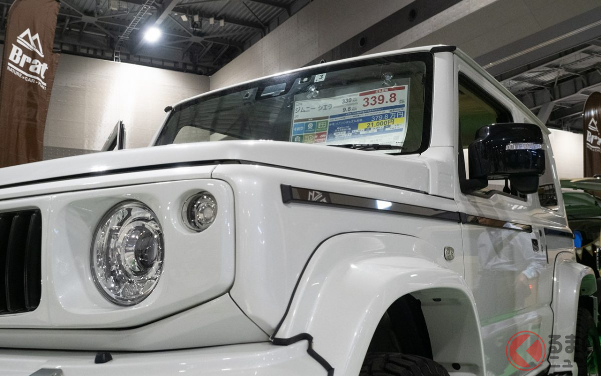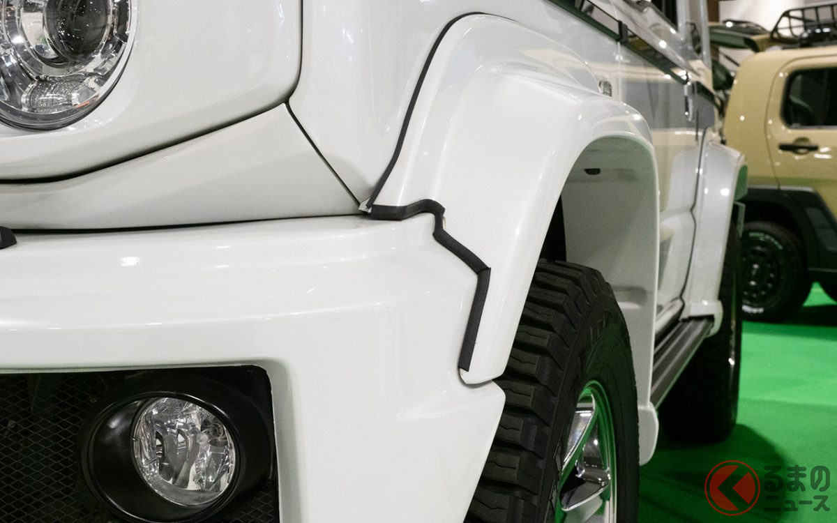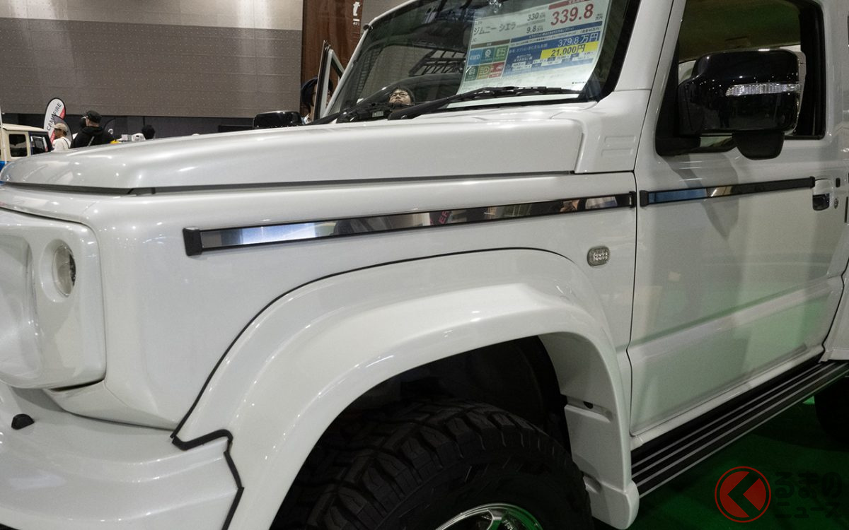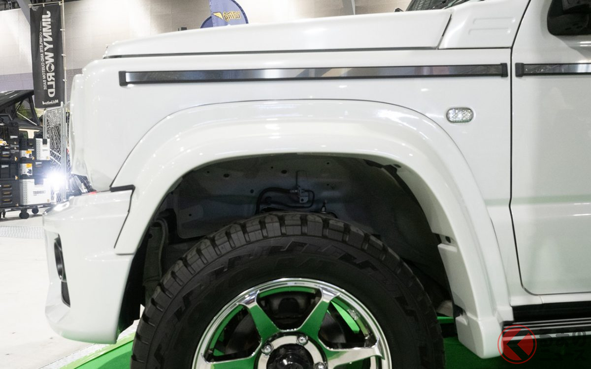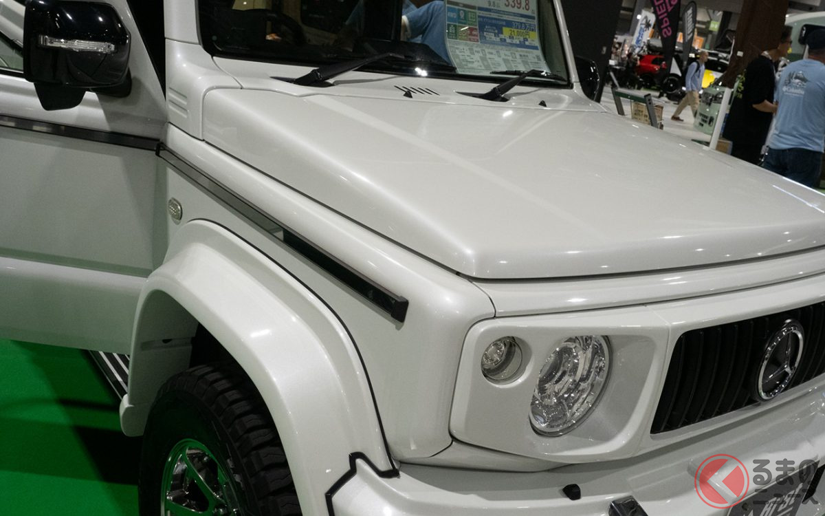 “Gクラス顔”のスズキ「ジムニーシエラ」登場! 精悍カクカクボディ&オバフェン仕様がカッコイイ! 小さな「ゲレンデ風カスタムカー」が「FIELDSTYLE JAPAN」で展示!