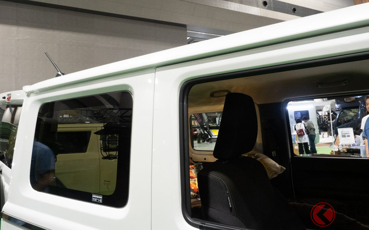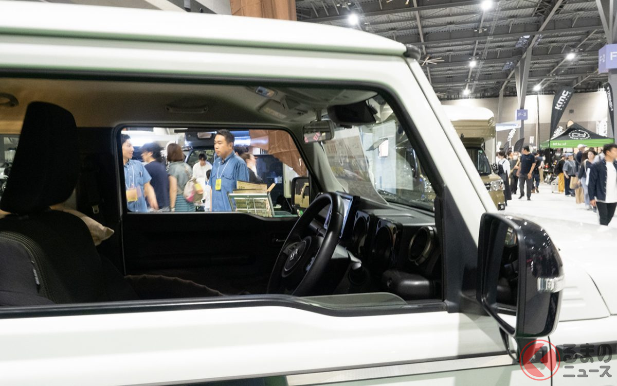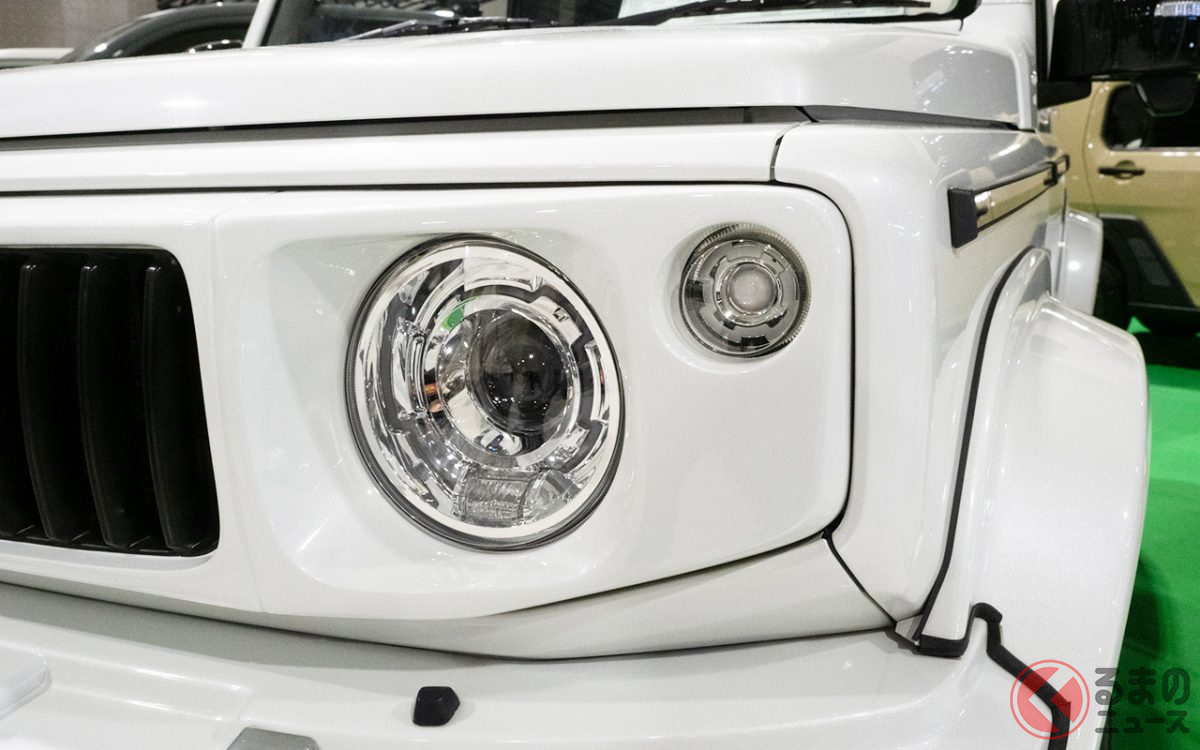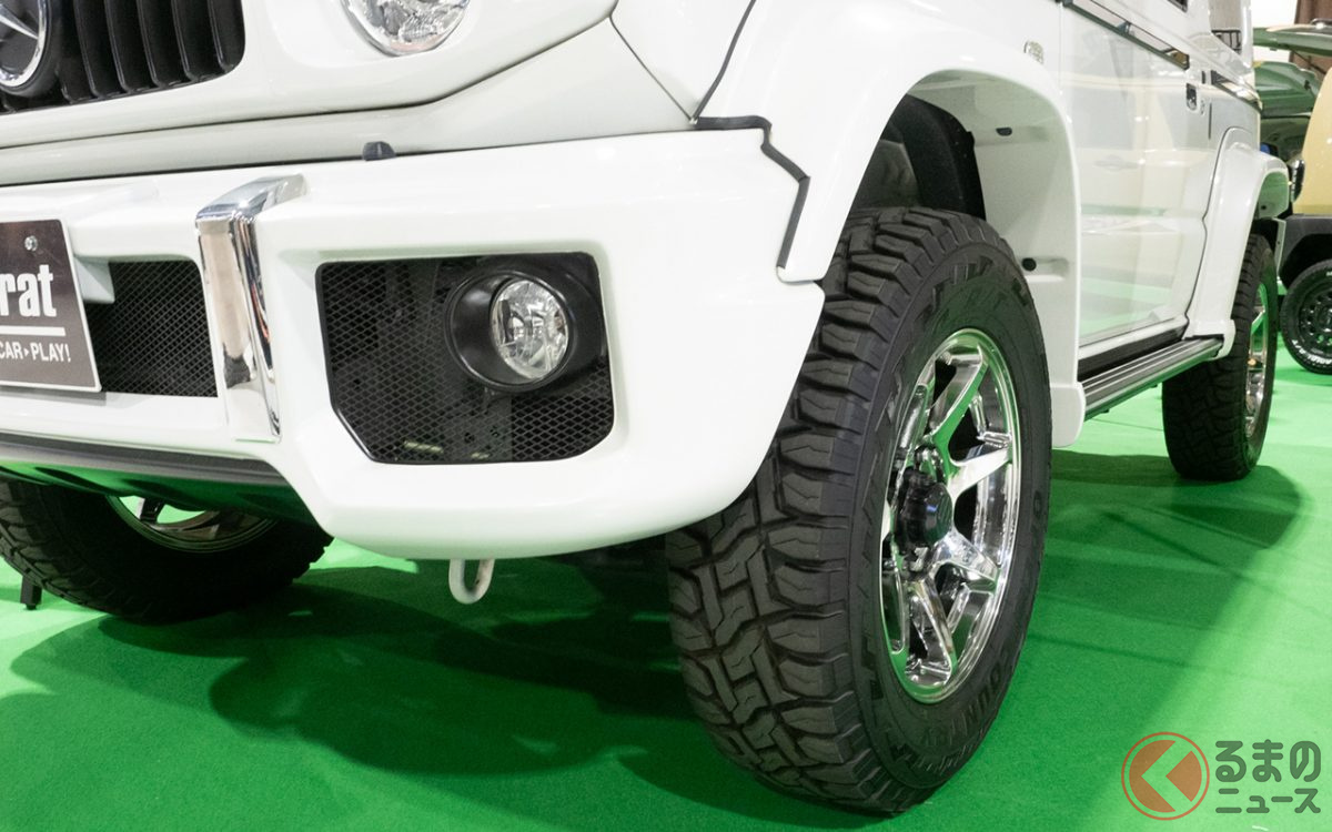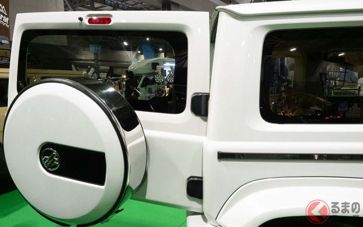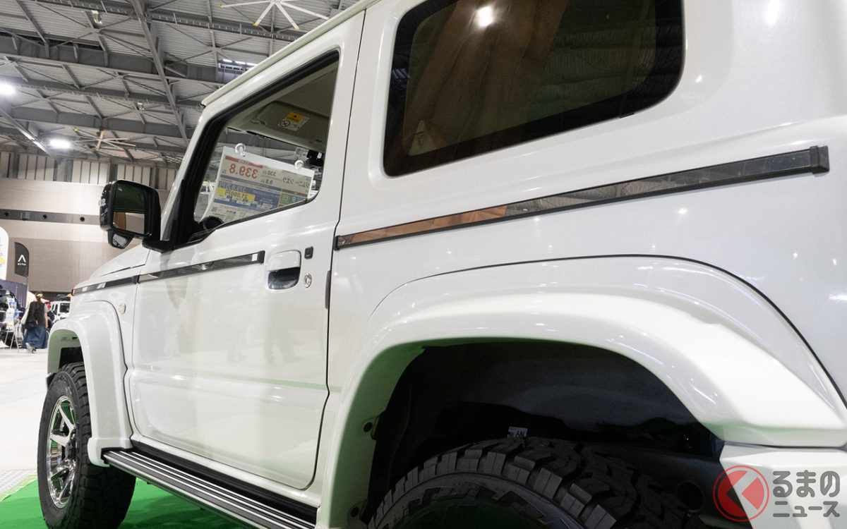 “Gクラス顔”のスズキ「ジムニーシエラ」登場! 精悍カクカクボディ&オバフェン仕様がカッコイイ! 小さな「ゲレンデ風カスタムカー」が「FIELDSTYLE JAPAN」で展示!