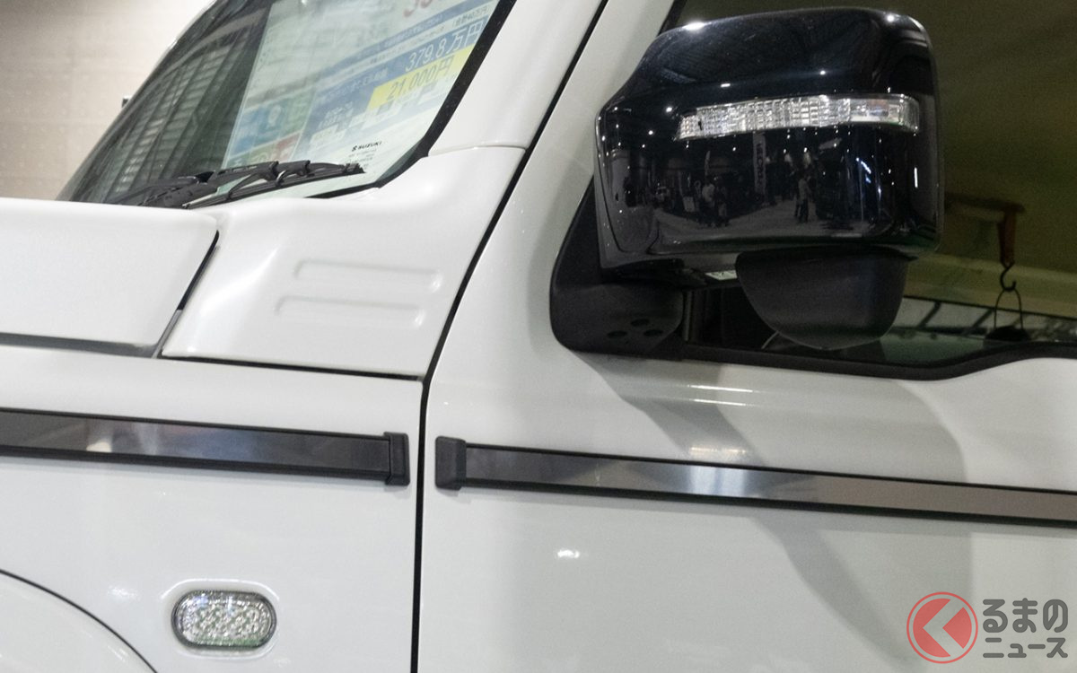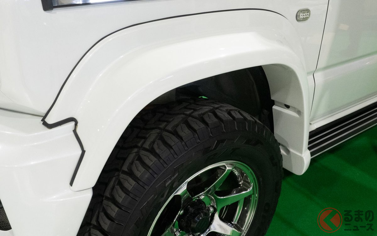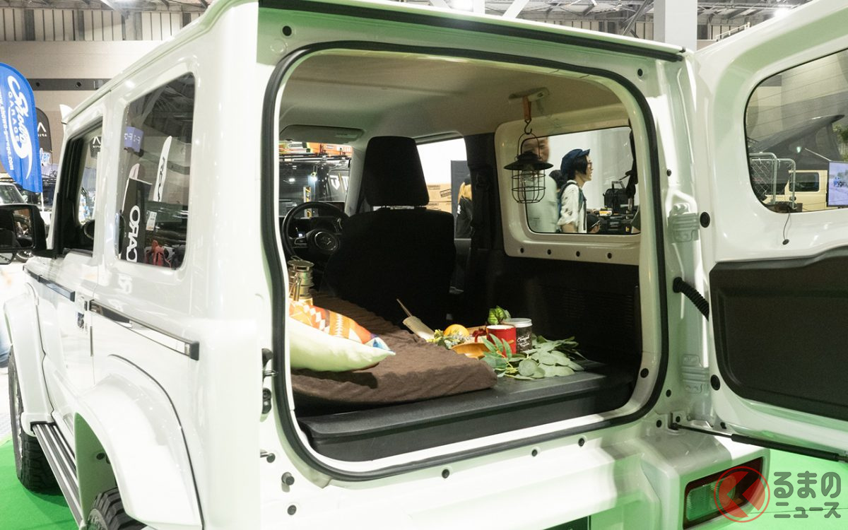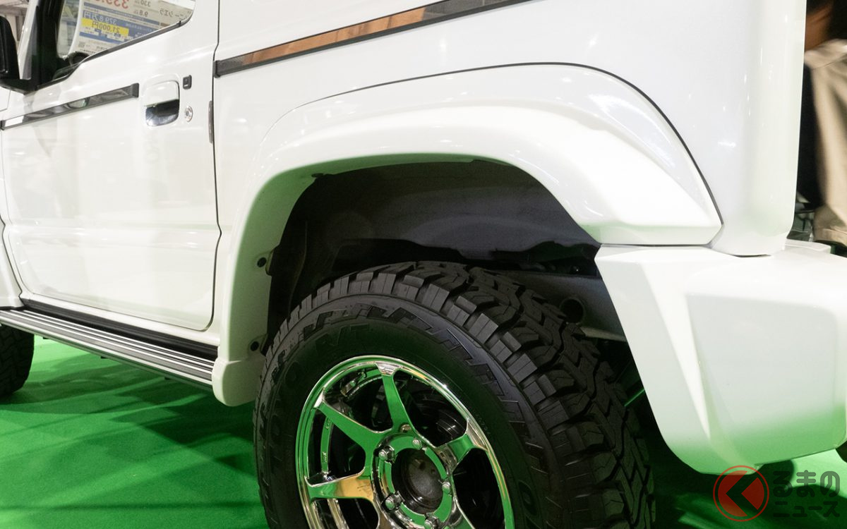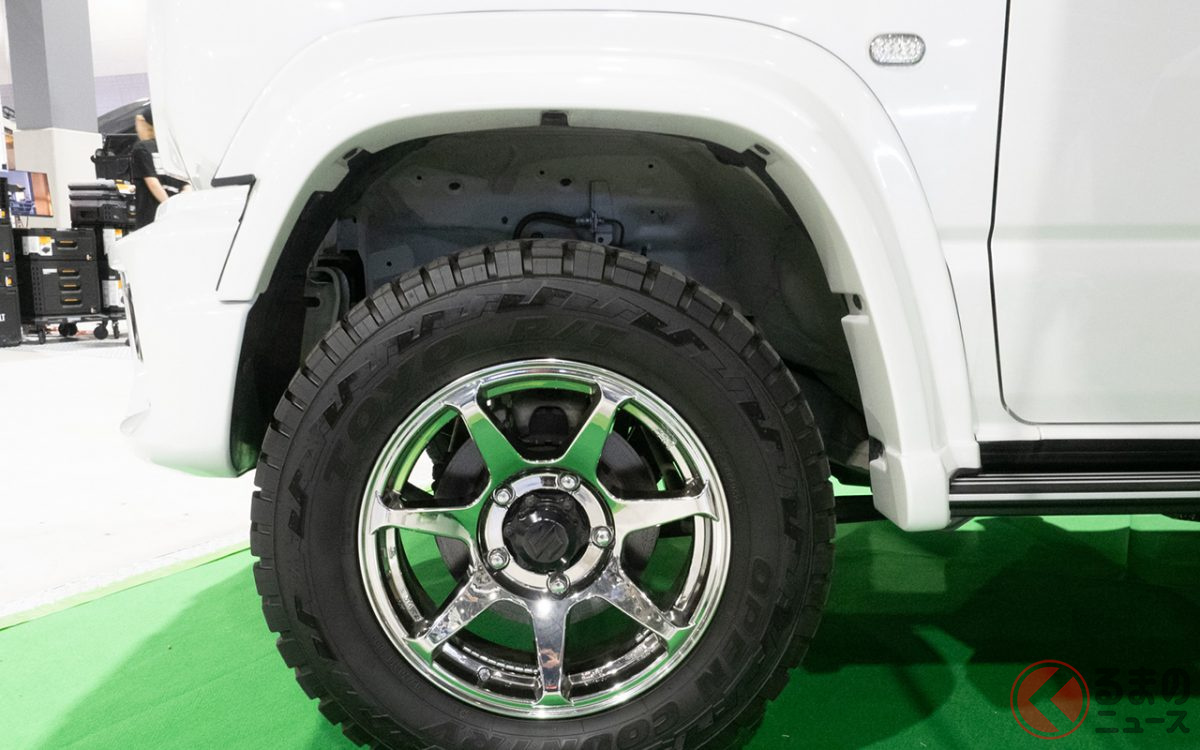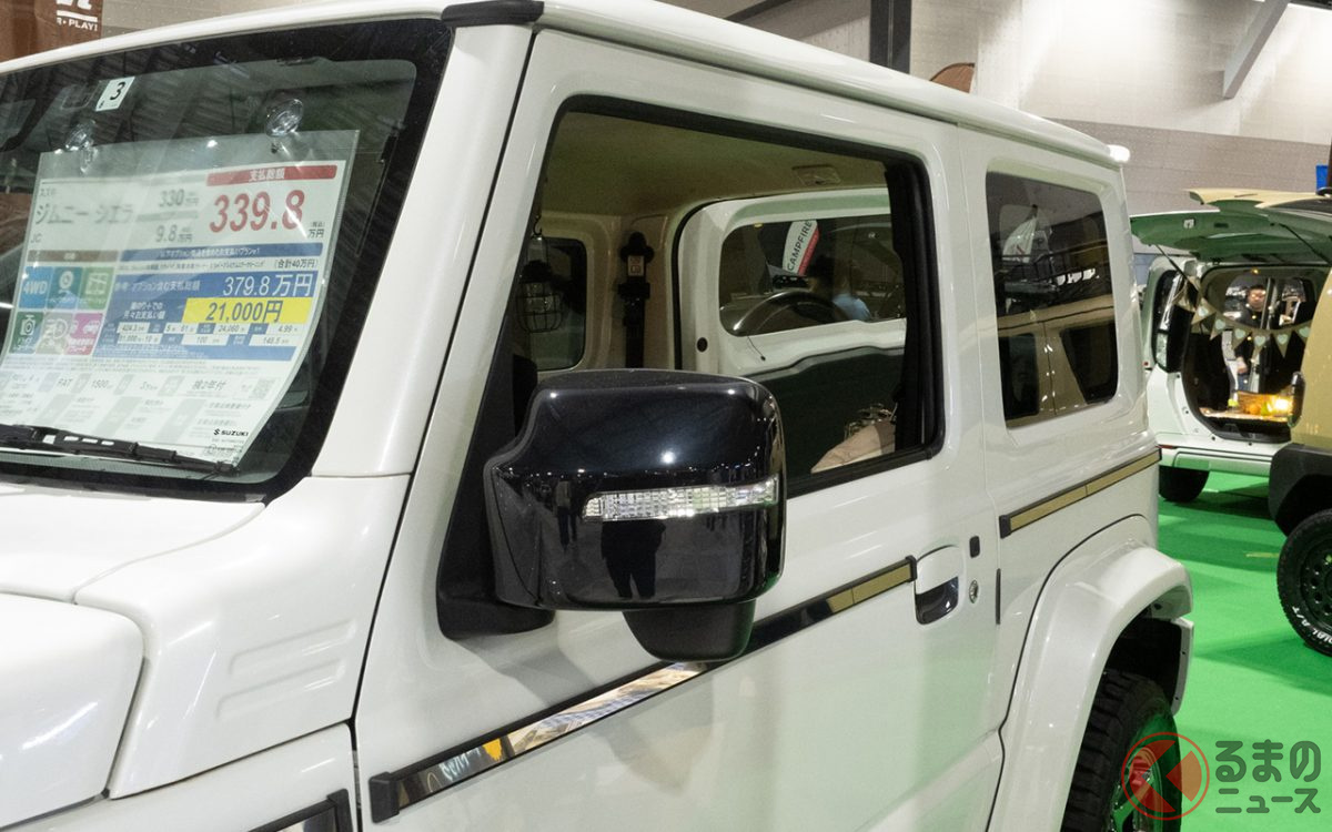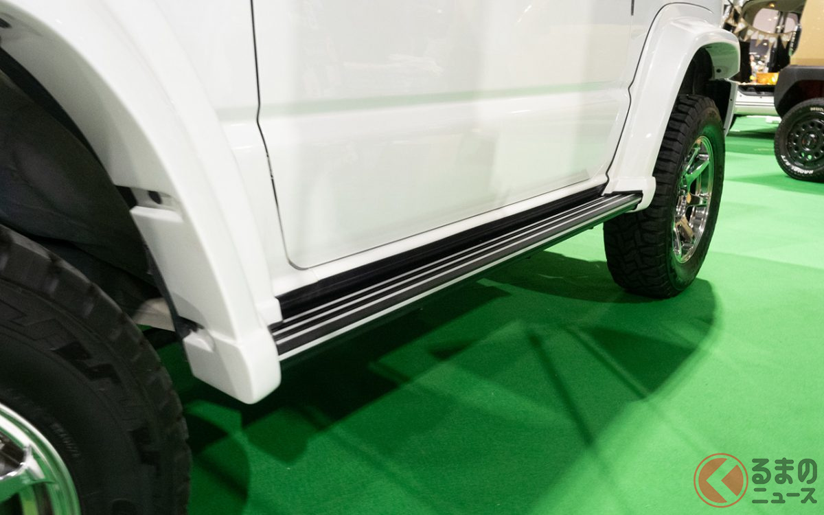 “Gクラス顔”のスズキ「ジムニーシエラ」登場! 精悍カクカクボディ&オバフェン仕様がカッコイイ! 小さな「ゲレンデ風カスタムカー」が「FIELDSTYLE JAPAN」で展示!