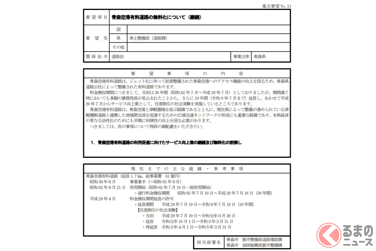 「青森空港有料道路」が無料開放へ! 債務返済のめどが立ち無料化 「10年延期」したあとついに決定! 2027年7月から