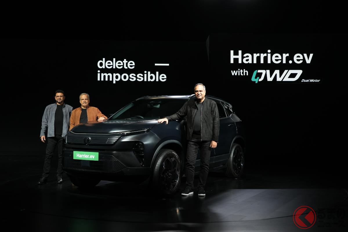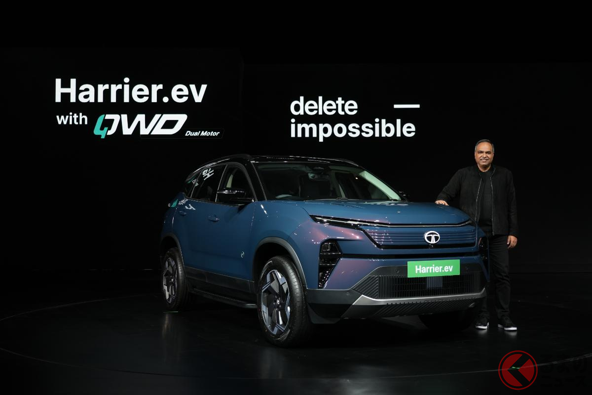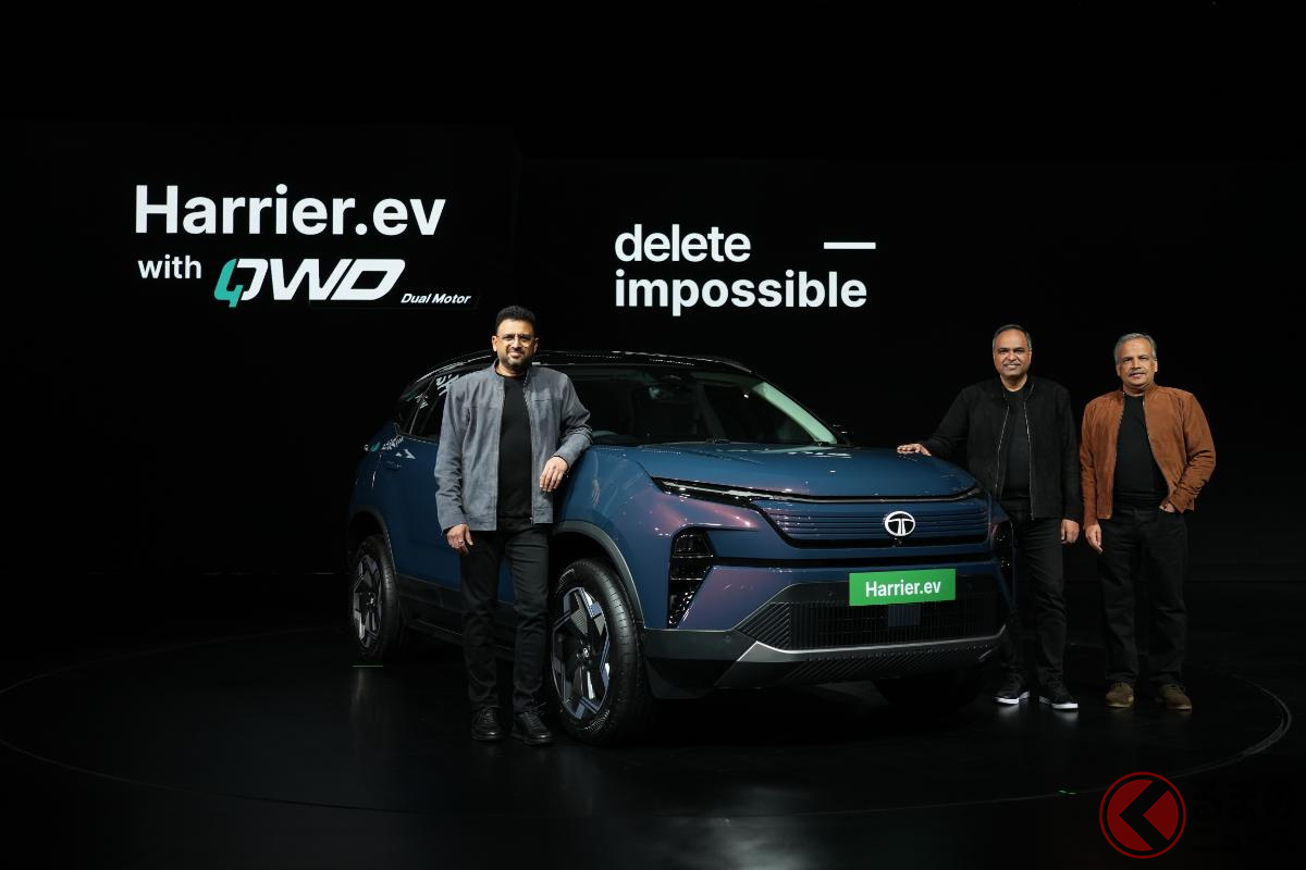 タタ新「ハリアー」発表! 歴代初「パワートレイン」×4WD採用! 専用デザイン外装&世界初「ディスプレイ搭載」の内装がカッコイイ! ブーストモードやドリフトモードも!? 「電動SUV」インドに登場!