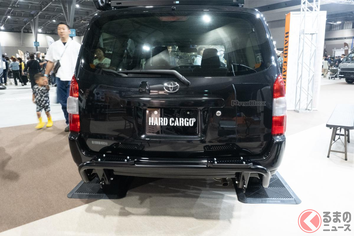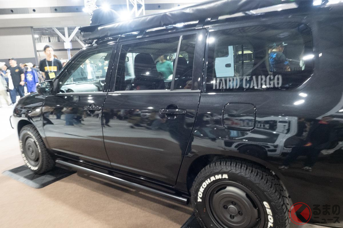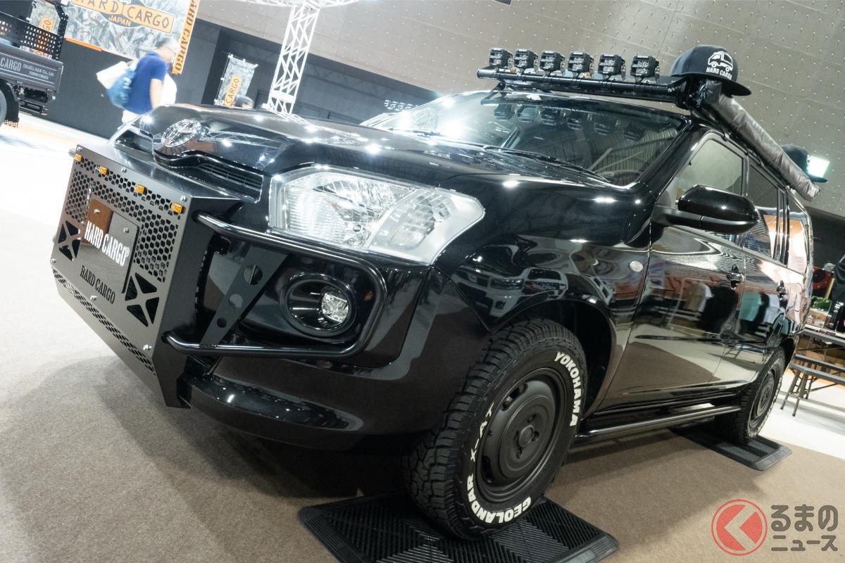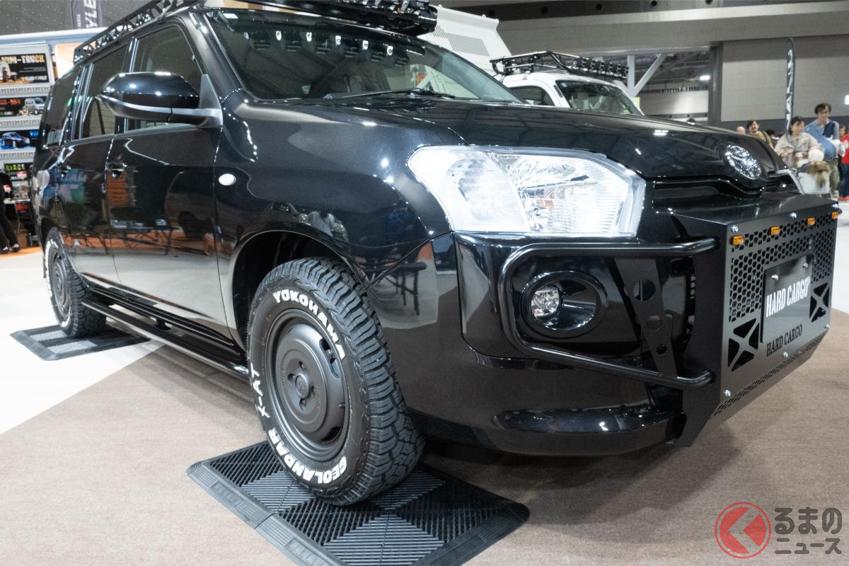 タフ顔の「プロボックス“SUV”」公開! 全長4.2m級のトヨタ「商用車」にコ゚ツい「バンパーガード」装備! 漆黒ボディがイイ「ハードカーゴ仕様」登場