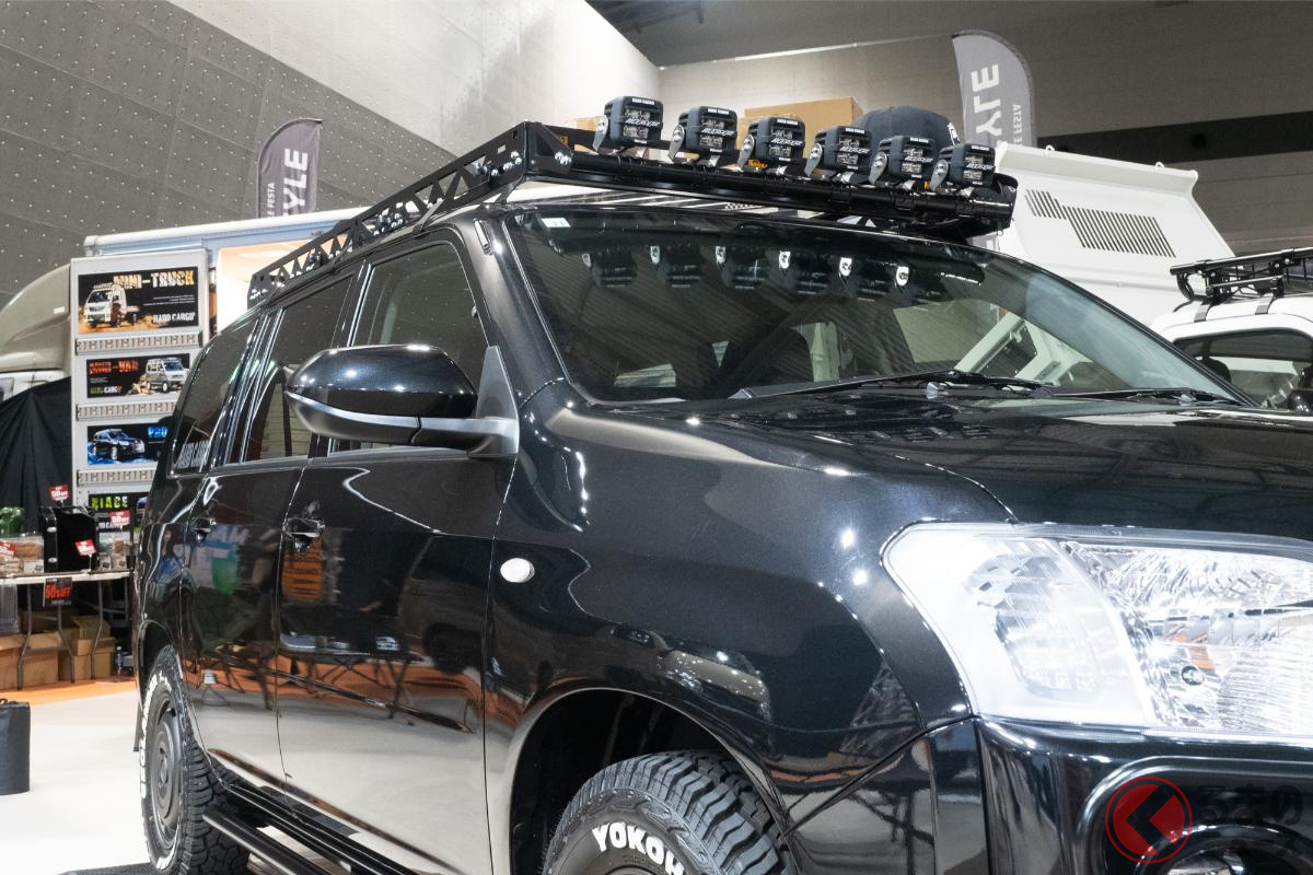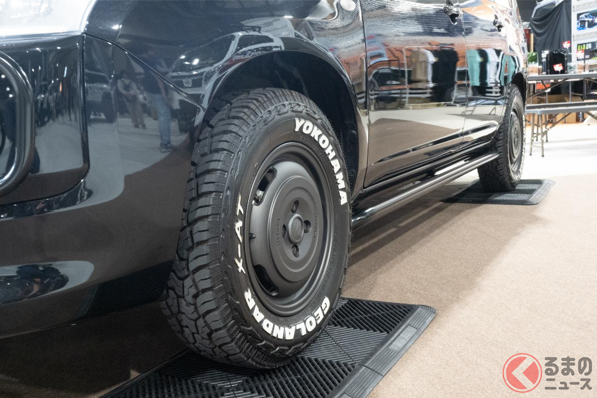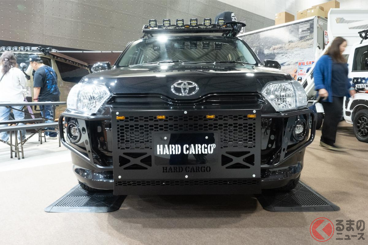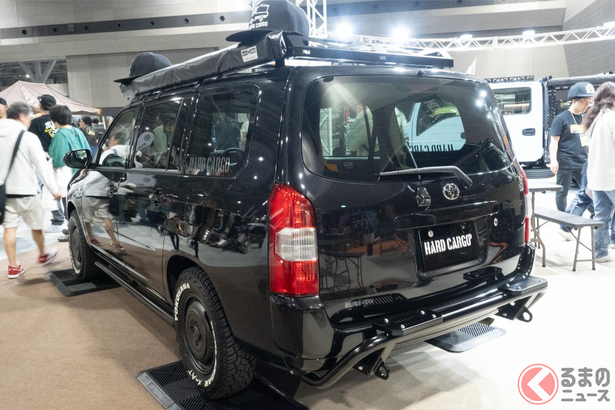 タフ顔の「プロボックス“SUV”」公開! 全長4.2m級のトヨタ「商用車」にコ゚ツい「バンパーガード」装備! 漆黒ボディがイイ「ハードカーゴ仕様」登場