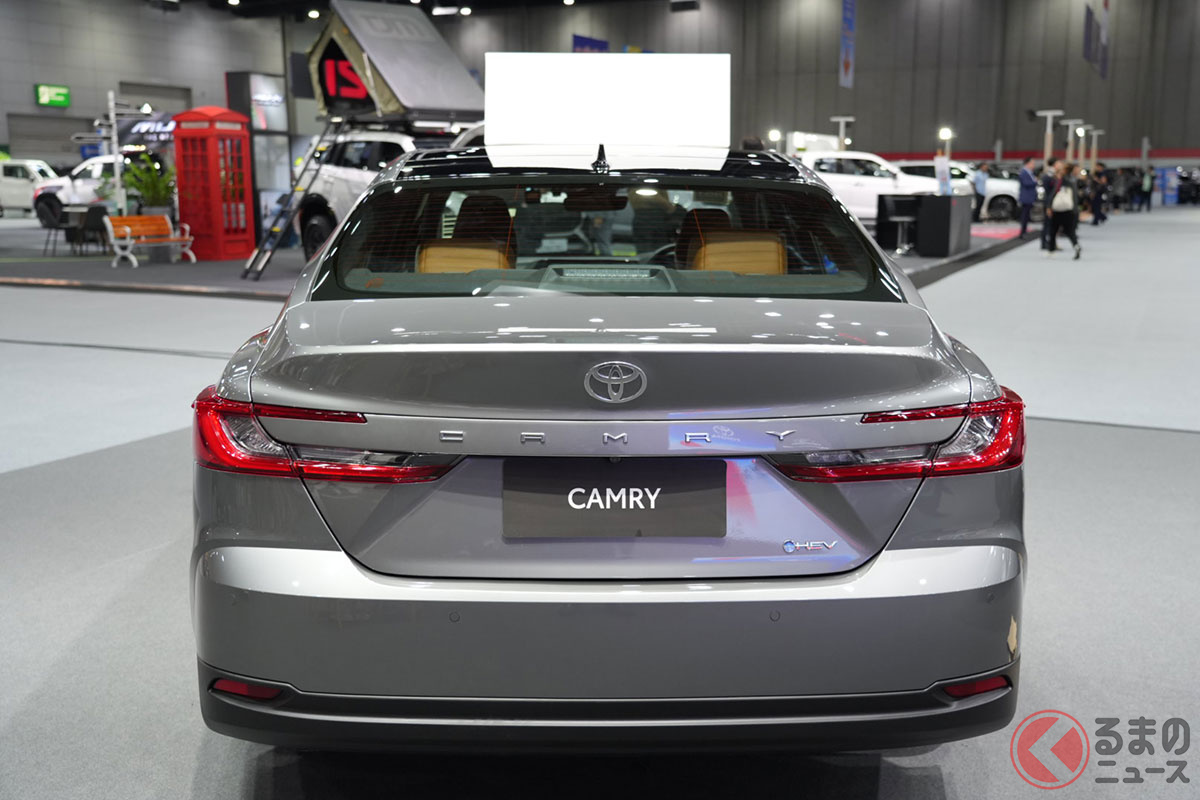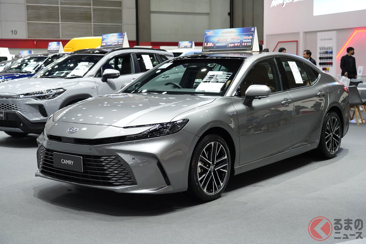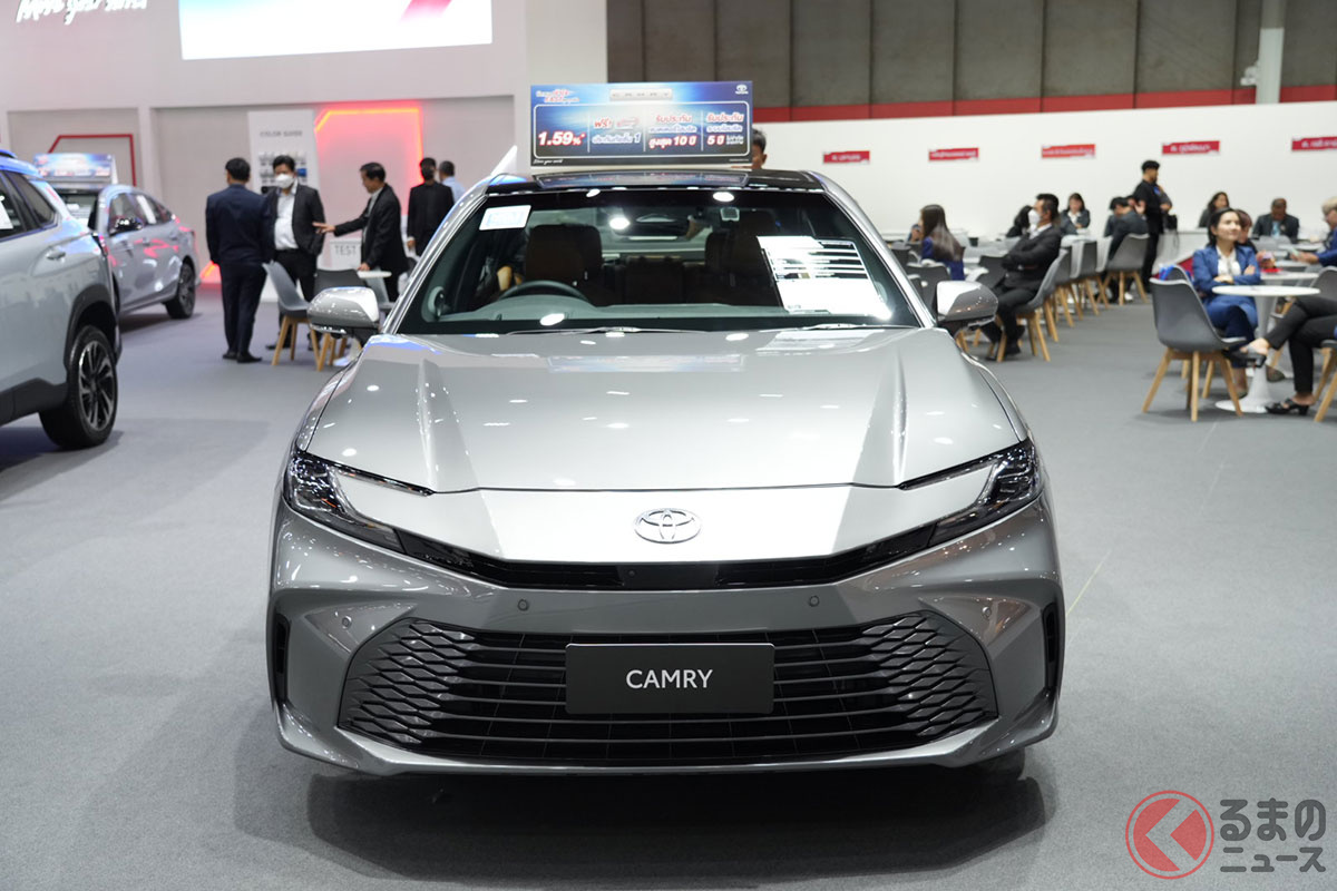 全長4.9m! トヨタ最新「FF“最上級”セダン」実車公開! 精悍「サメ顔」×流麗“クーペ”ボディがカッコイイ! 「リッター25km」も走る高級モデル「カムリ」をタイイベントで展示