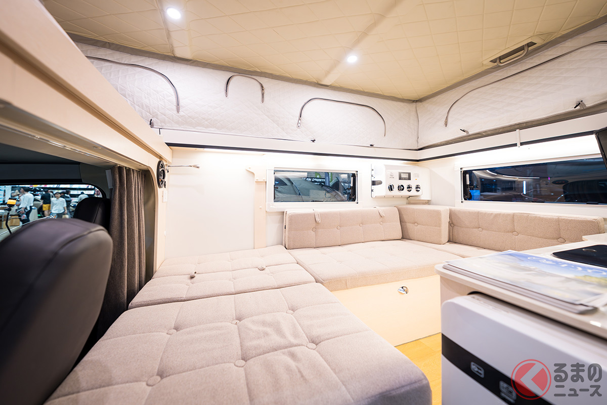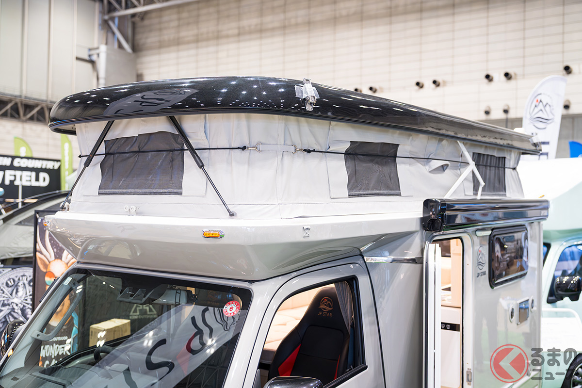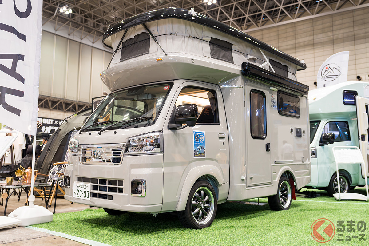 ダイハツ「“2階建て”軽トラ!?」実車公開! “全長4m以下”で「4人」が寝られる? “屋根”が違う2つの車中泊モデル「JPSTAR happy1」登場