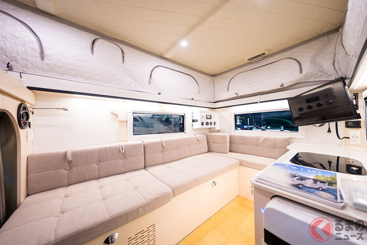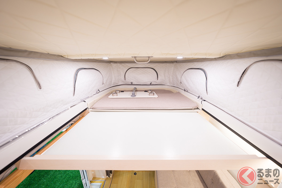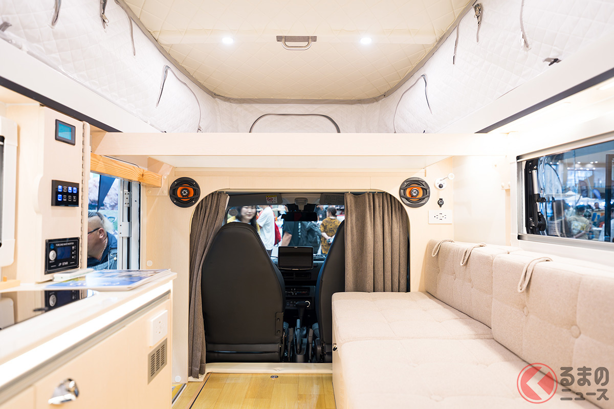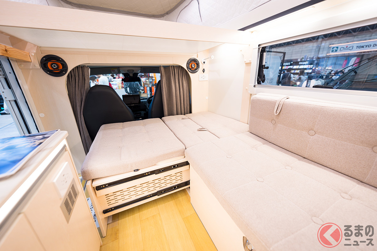ダイハツ「“2階建て”軽トラ!?」実車公開! “全長4m以下”で「4人」が寝られる? “屋根”が違う2つの車中泊モデル「JPSTAR happy1」登場