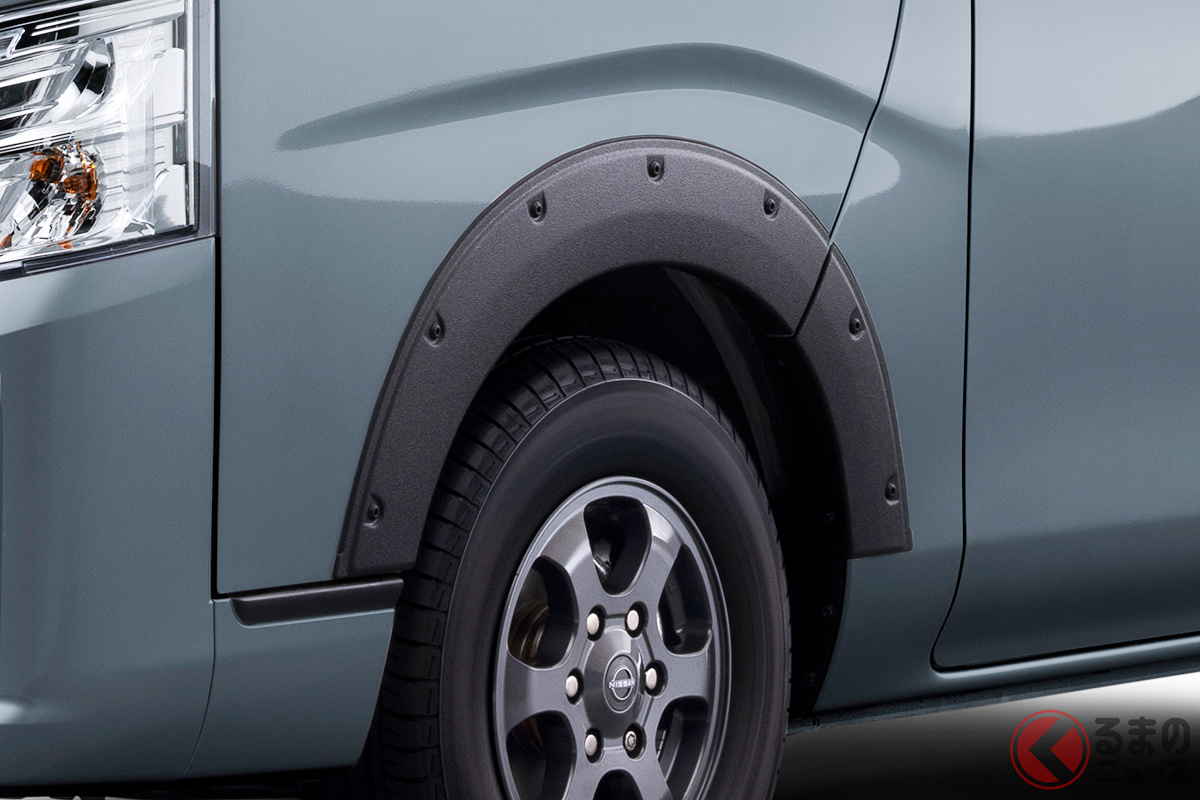 4WDやSUV車をメインに展開するカスタムパーツメーカーのジャオスは2025年7月22日、日産「キャラバン(E26)」用のアクセサリーパッケージである「SOTOASOBI パッケージ」に、JAOS製の「フェンダーガーニッシュ・タフブラック」が採用されたと発表しました。