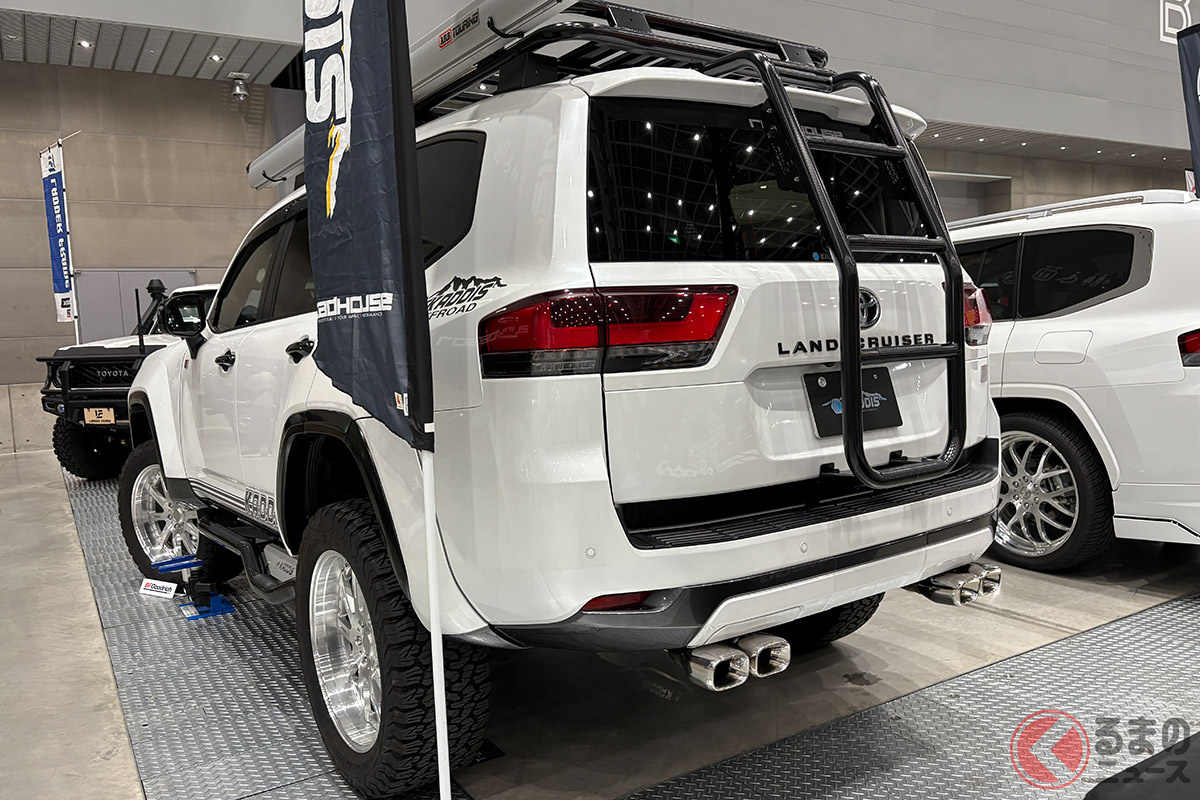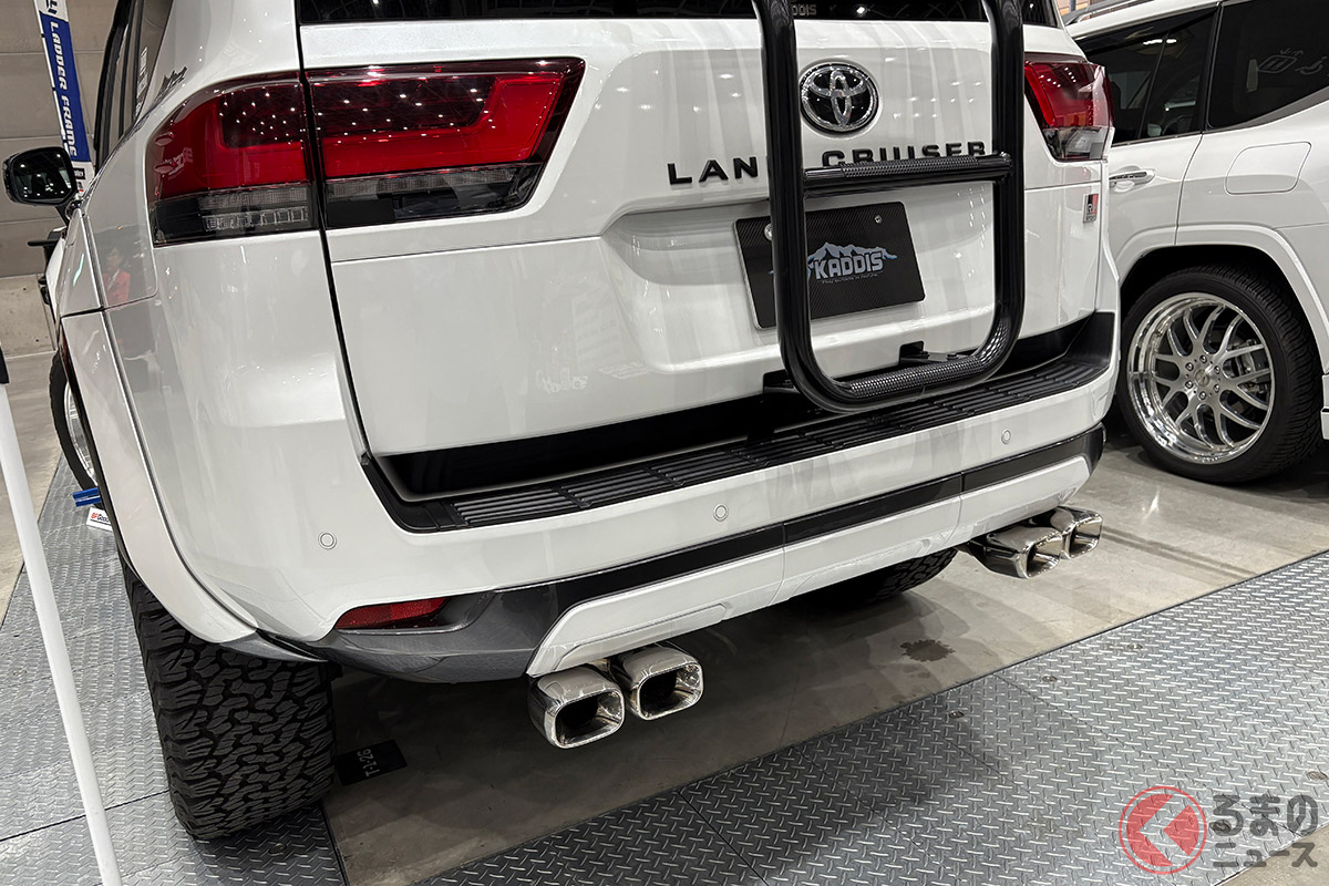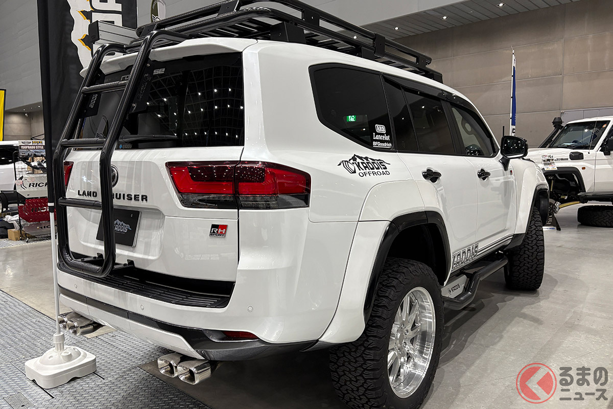 斬新なトヨタ「ランドクルーザー300」実車展示! ダイナミックな100mmリフトアップ&ワイドボディがスゴい! 4本出しマフラー装着したKADDIS仕様の「本格SUV」とは!