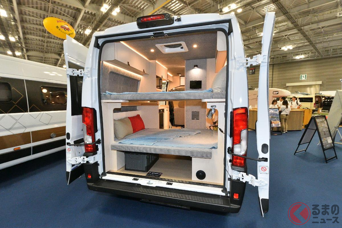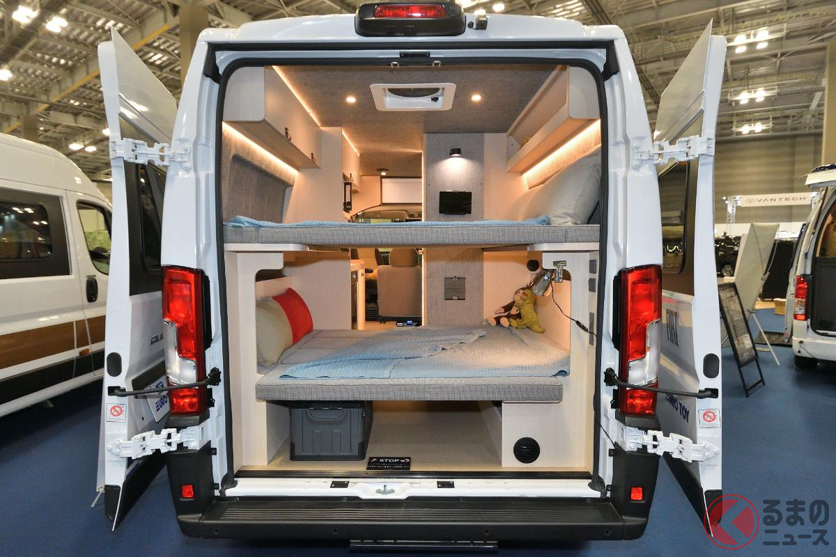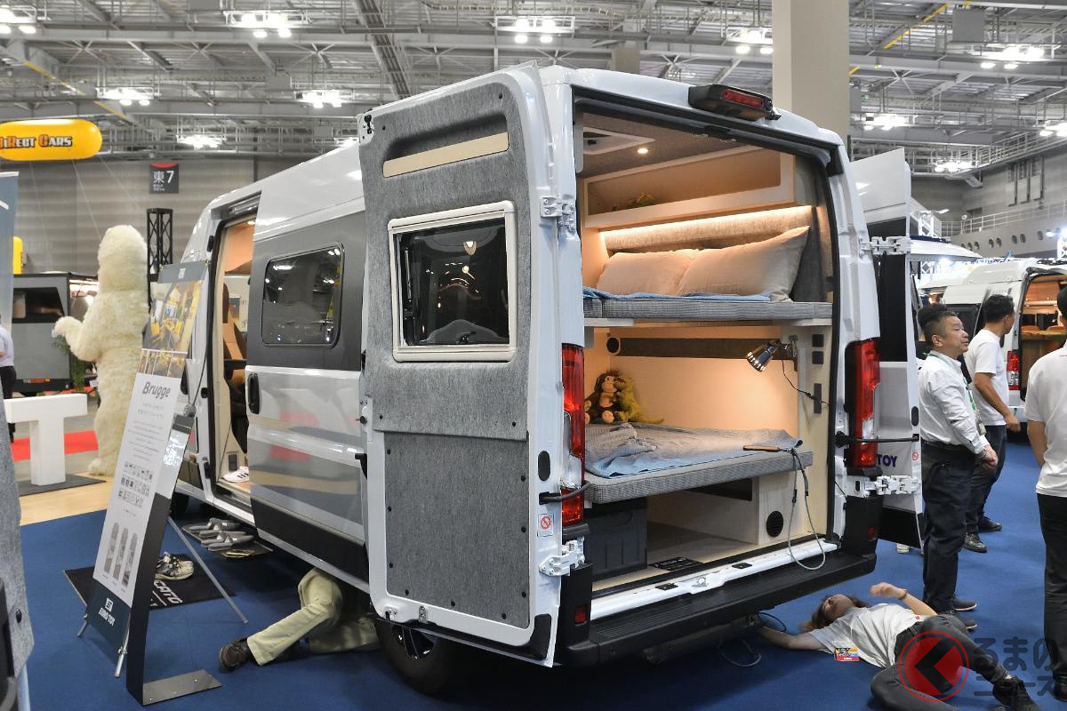 新型「車中泊」モデル「ブルージュ」初公開! ダブルベッド「2つ」完備で“大人4人”寝られる!? トイファクトリーのフィアット「デュカト“新型キャンピングカー”」に注目!