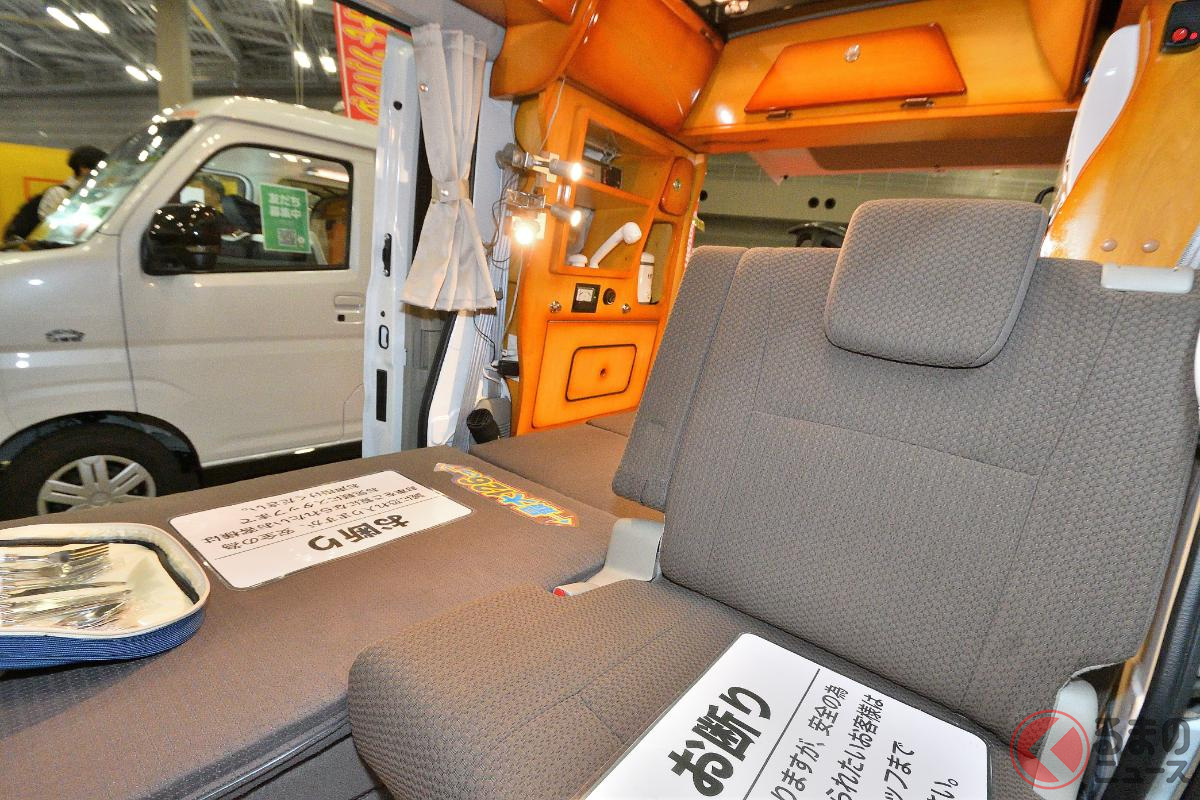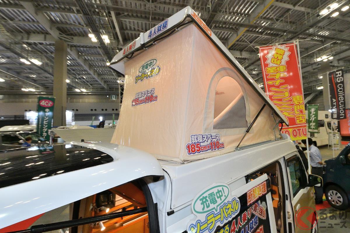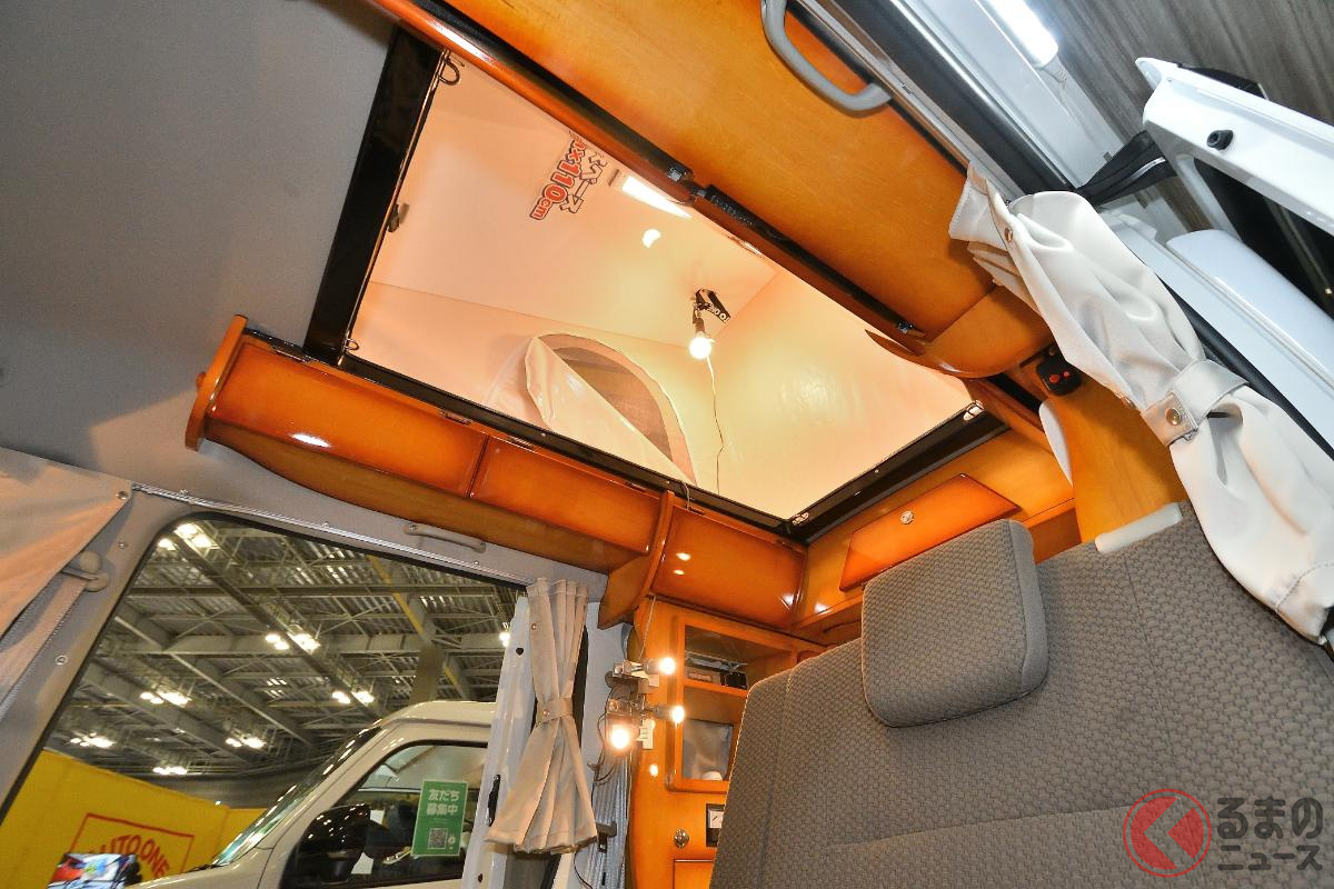 スズキ「“2階建て”軽バン!?」公開! 全長3.4mで「大人4人」“寝られる”「エブリイ」!? 電気も使えてめちゃ便利なオートワンキャンパー「給電くん」がスゴかった!