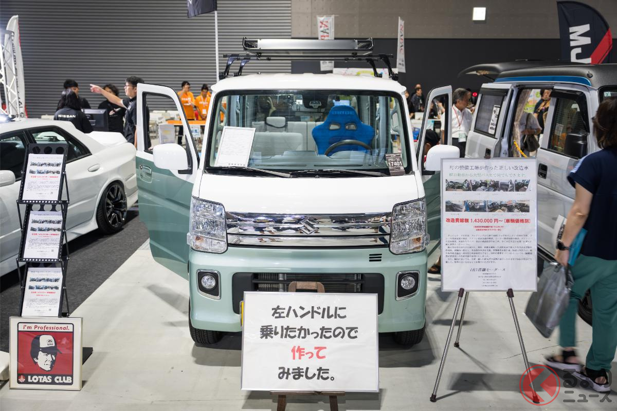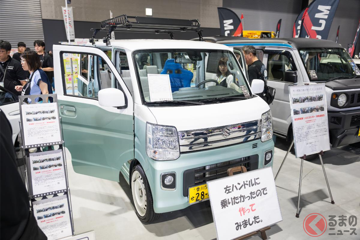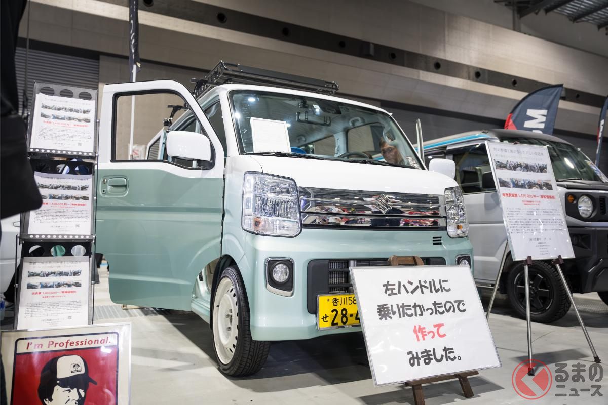 カスタムショップの真鍋モータースが、スズキ「エブリイ」を左ハンドルに改造した1台をオートメッセ愛知にて実車展示。その珍しい姿に、ユーザーから多くの関心を集めていました。