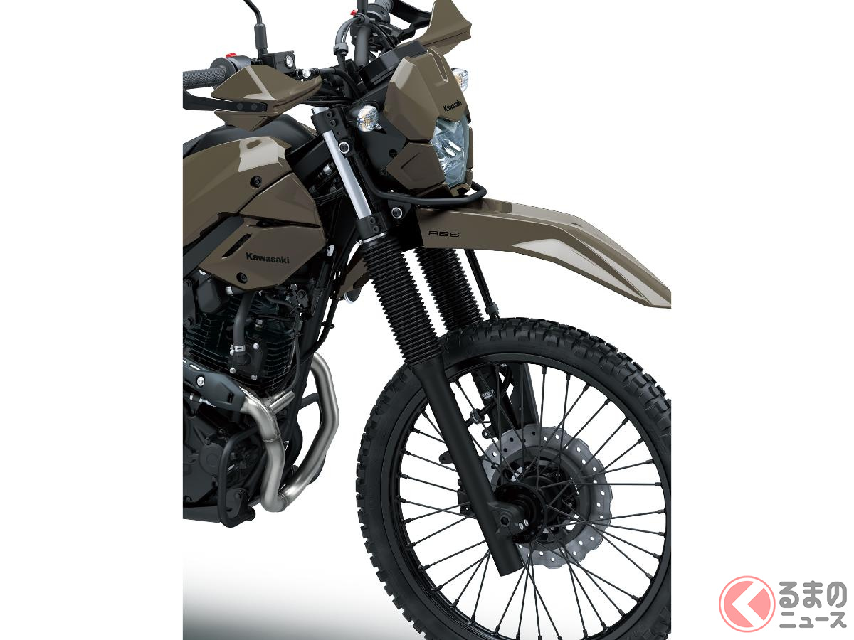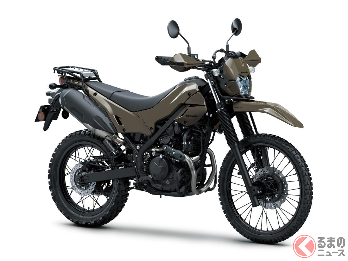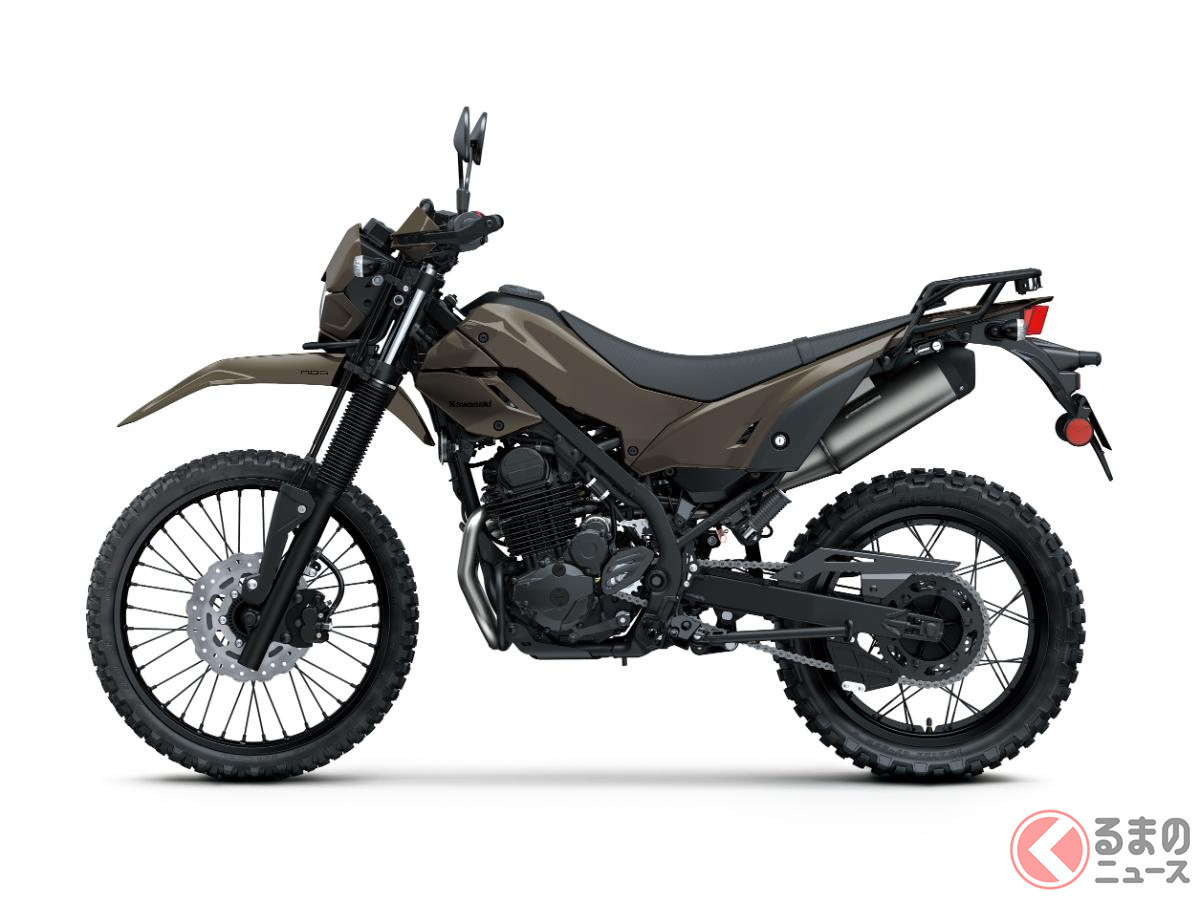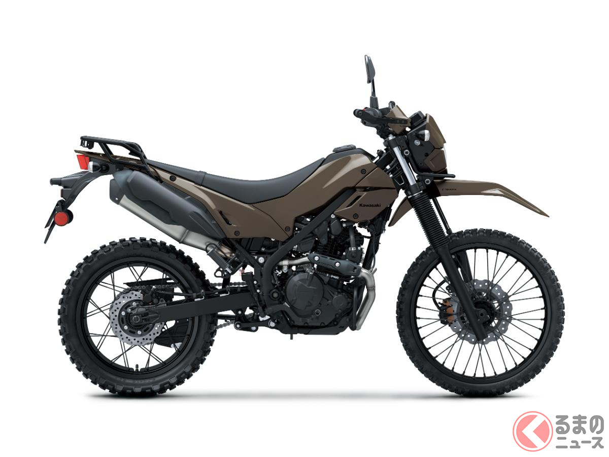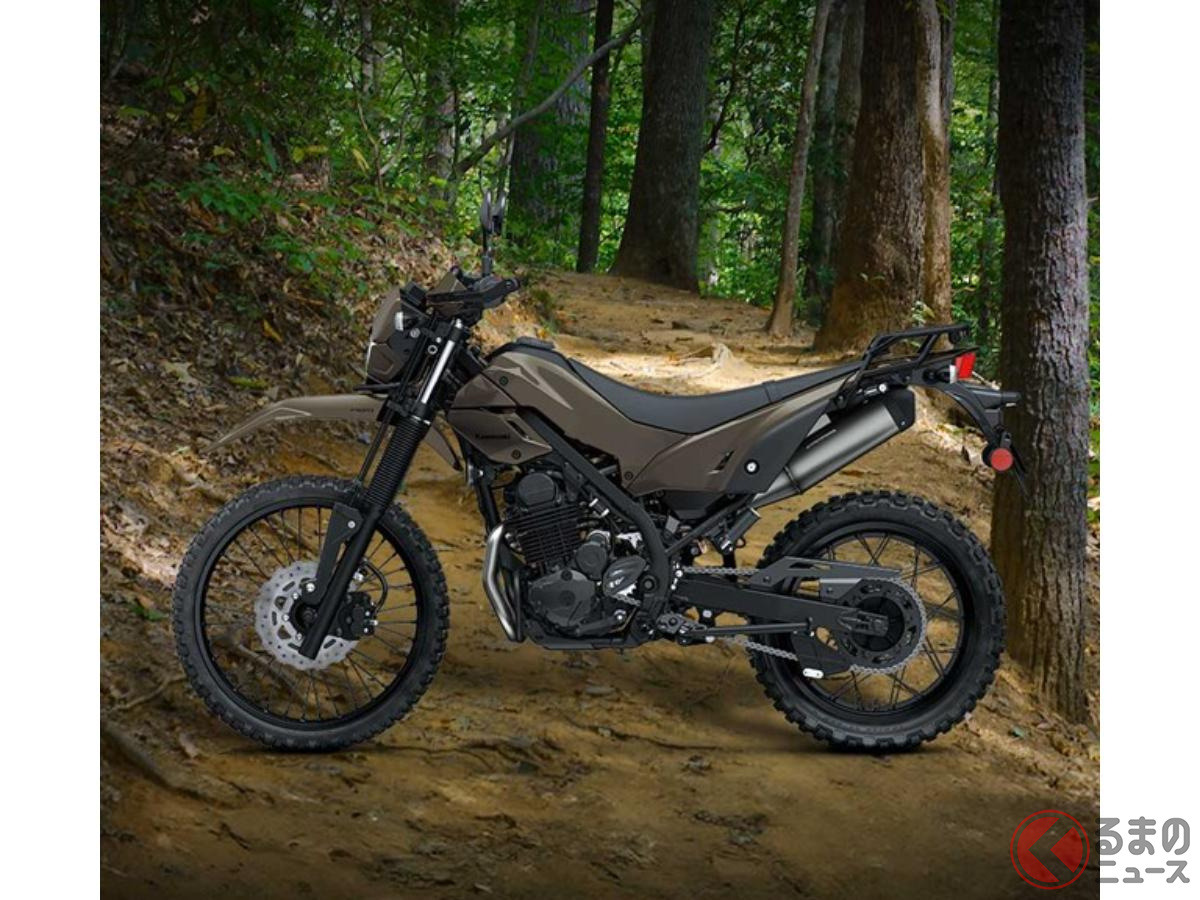 カワサキが超ゴツい「新型オフロードバイク」発表! あふれる“ミリタリー感”が超カッコいい「リアキャリア」や「エンジンガード」を標準装備! 新型「KLX230 DF」発売へ!