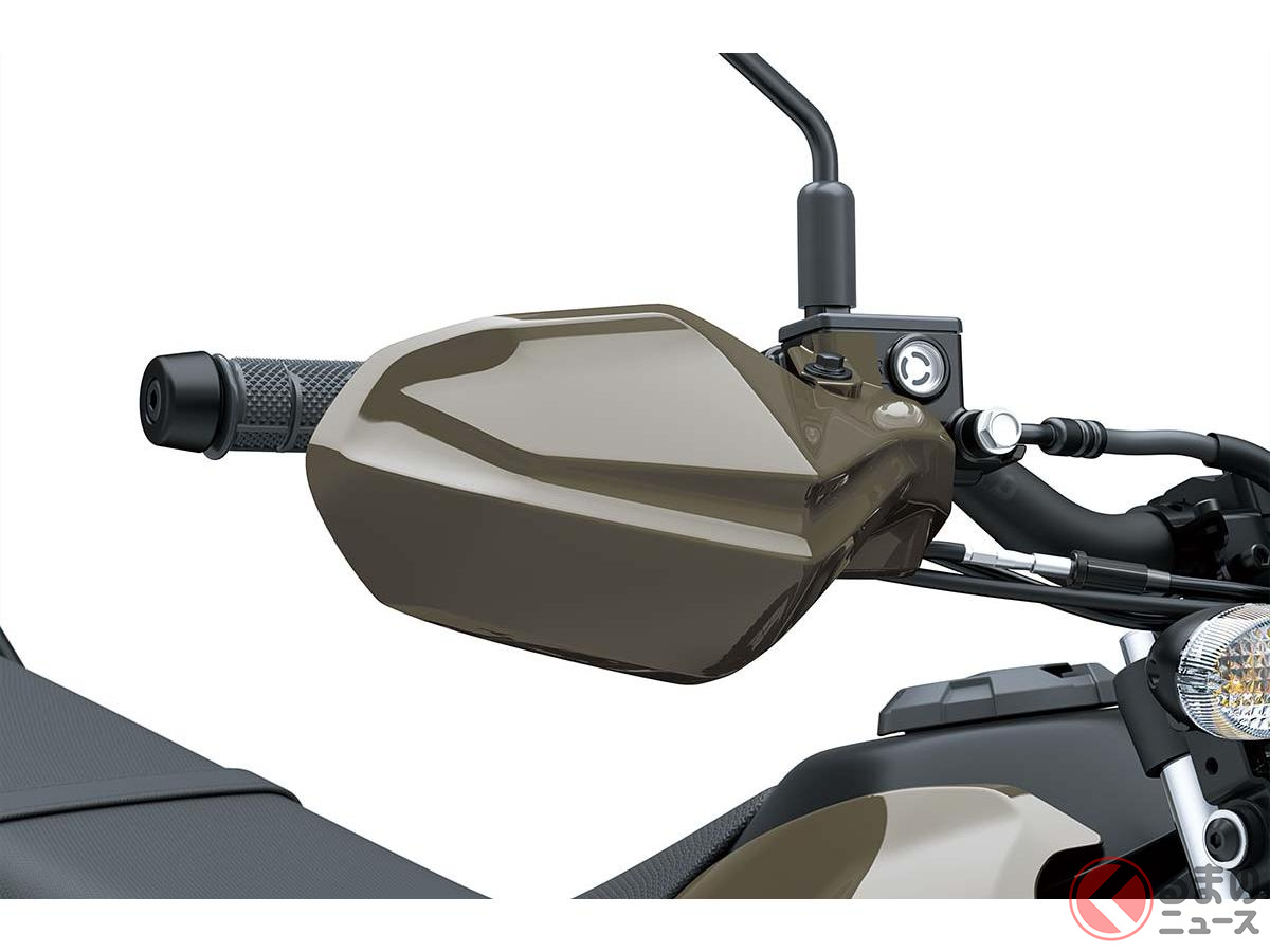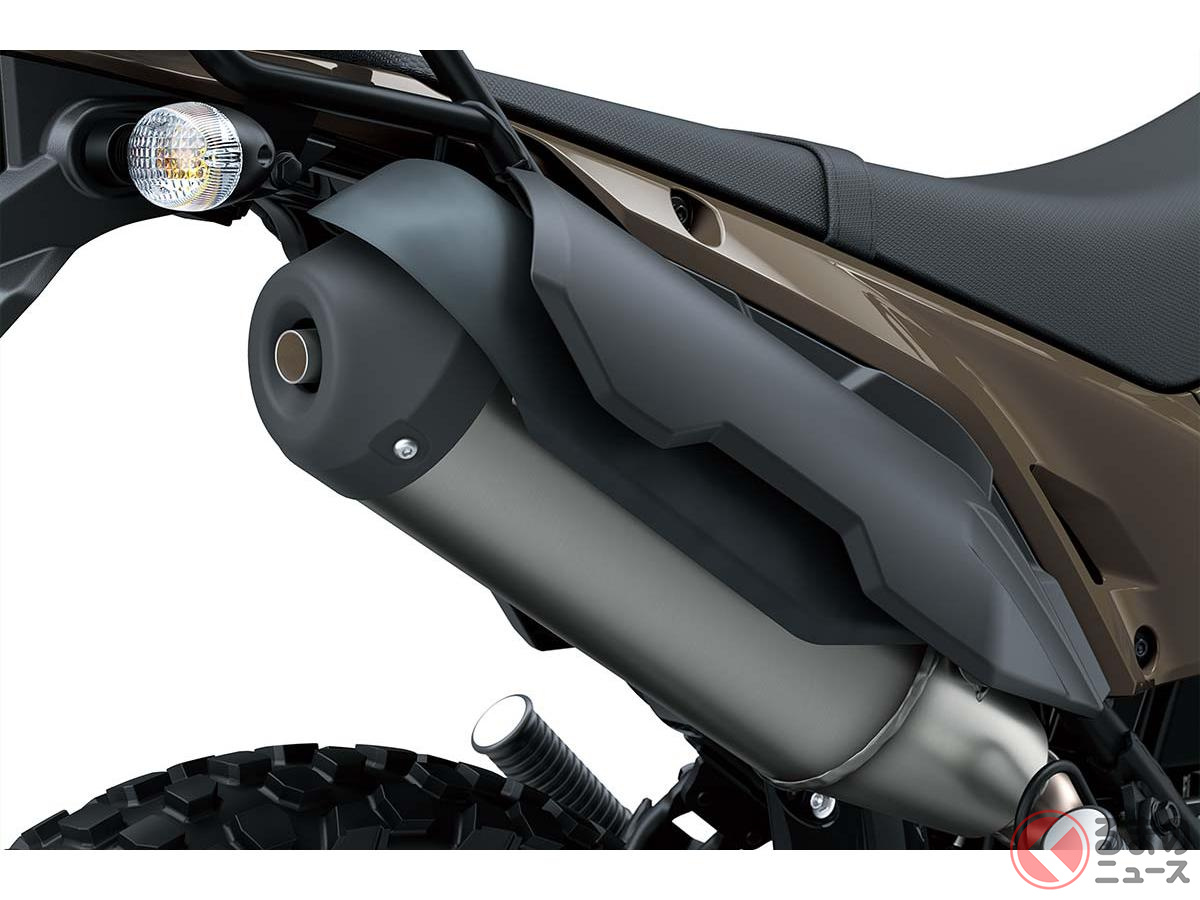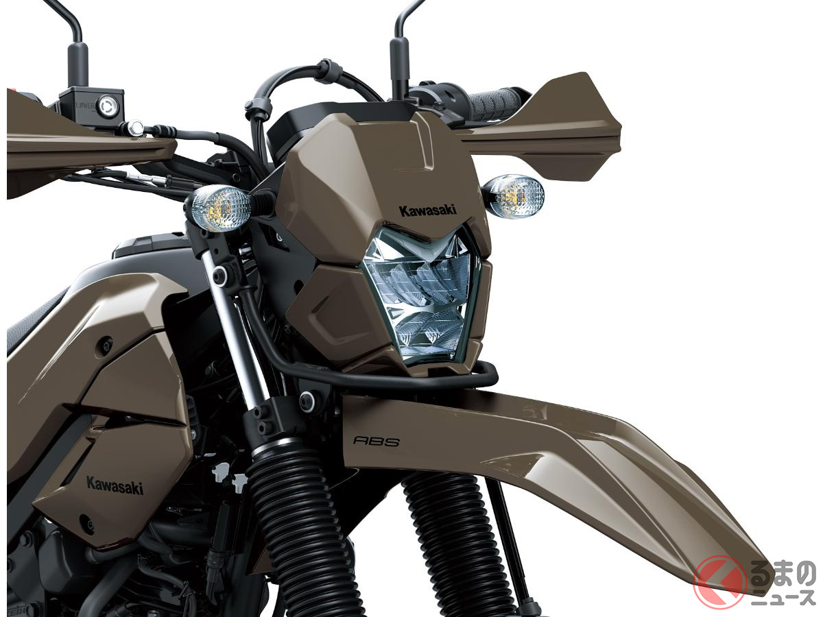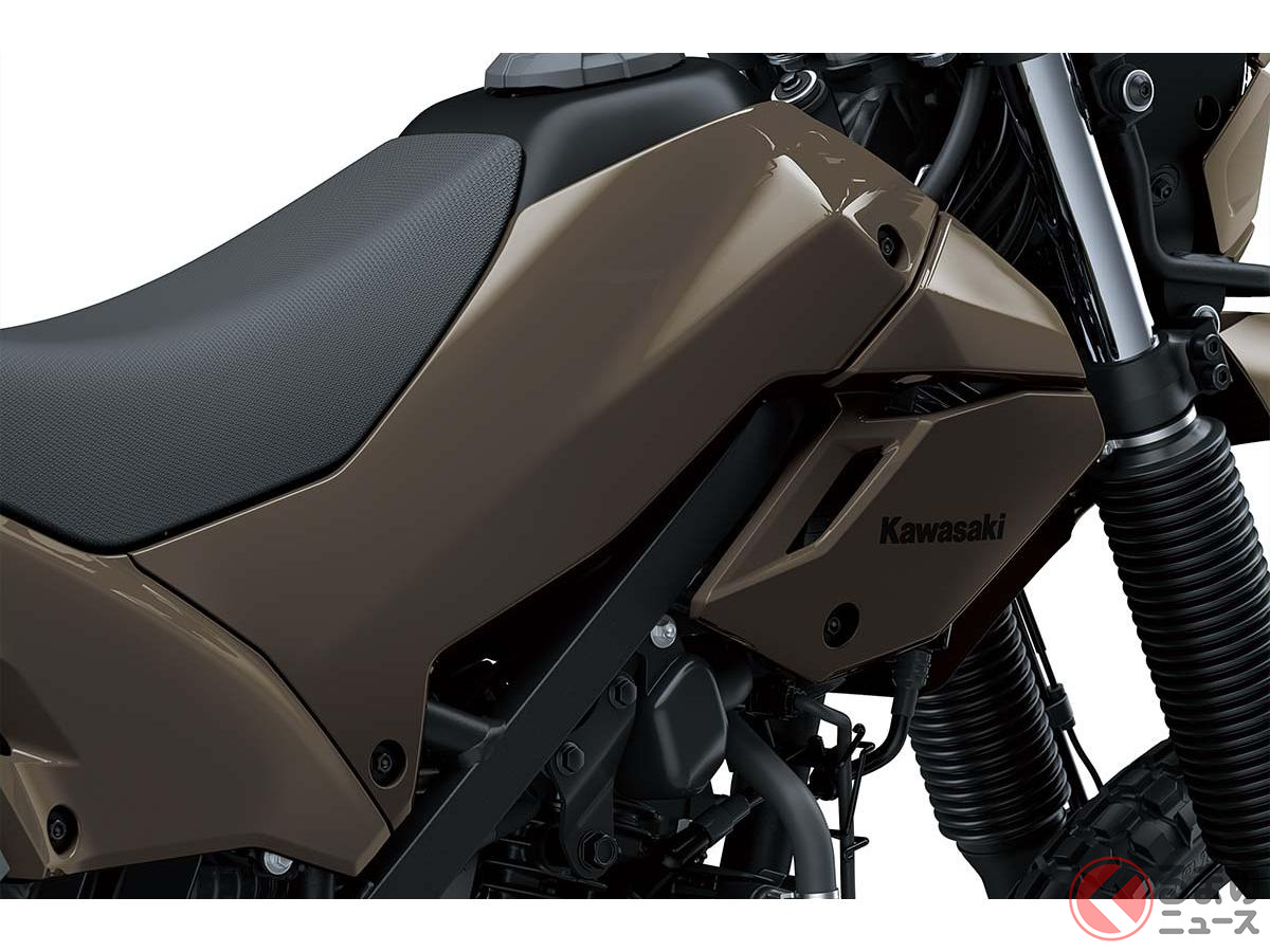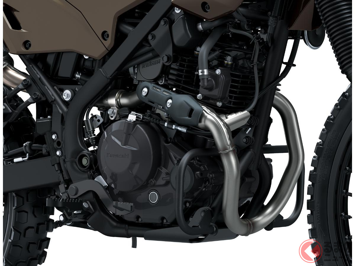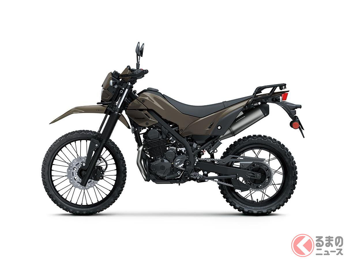 カワサキが超ゴツい「新型オフロードバイク」発表! あふれる“ミリタリー感”が超カッコいい「リアキャリア」や「エンジンガード」を標準装備! 新型「KLX230 DF」発売へ!