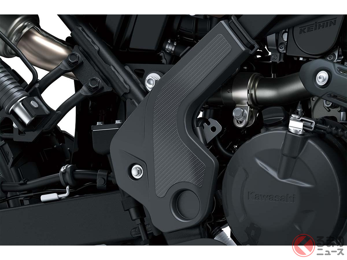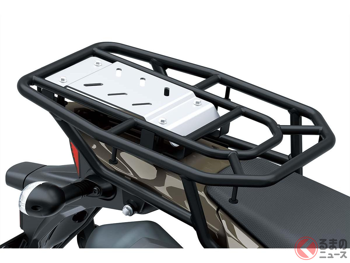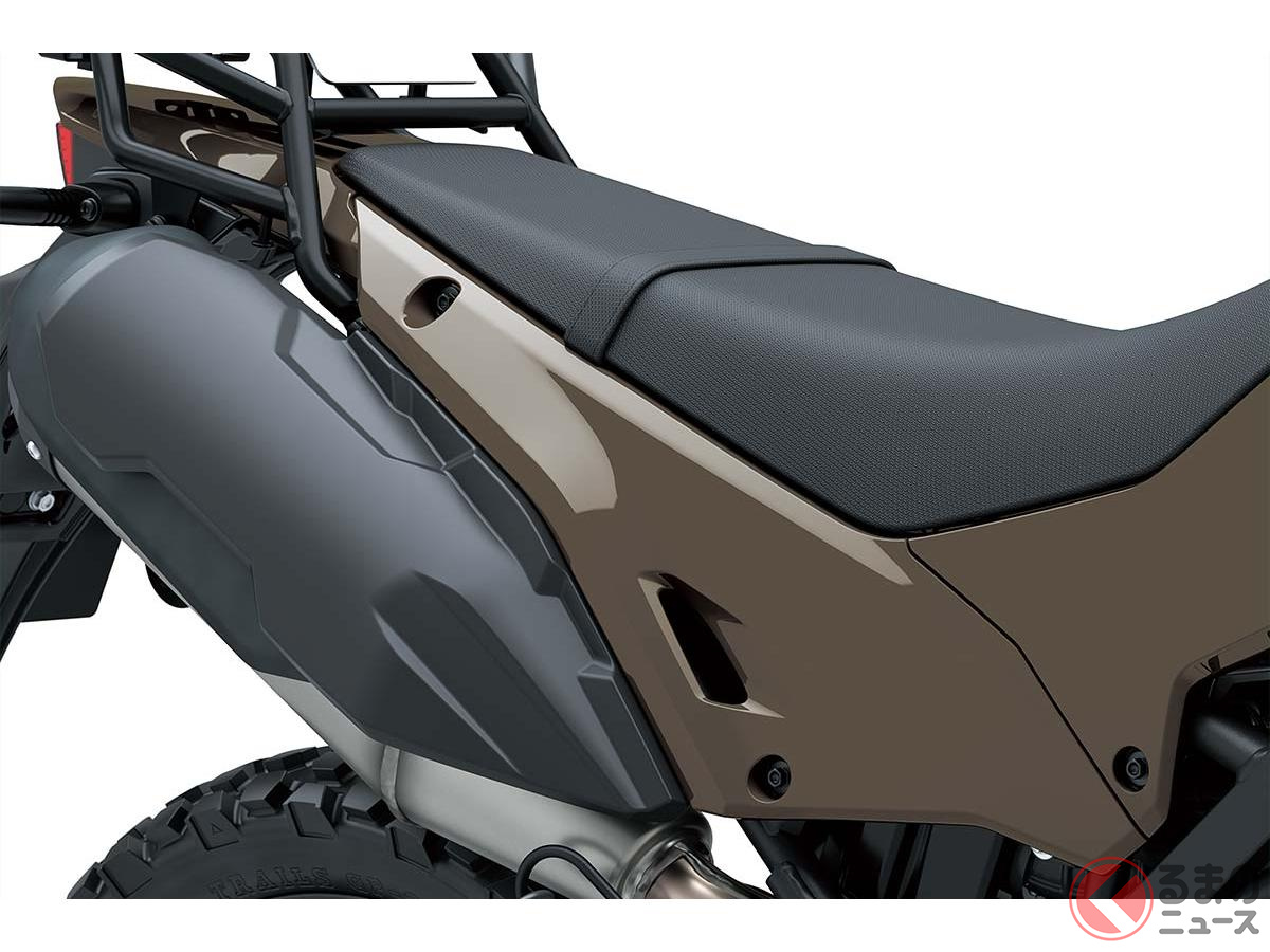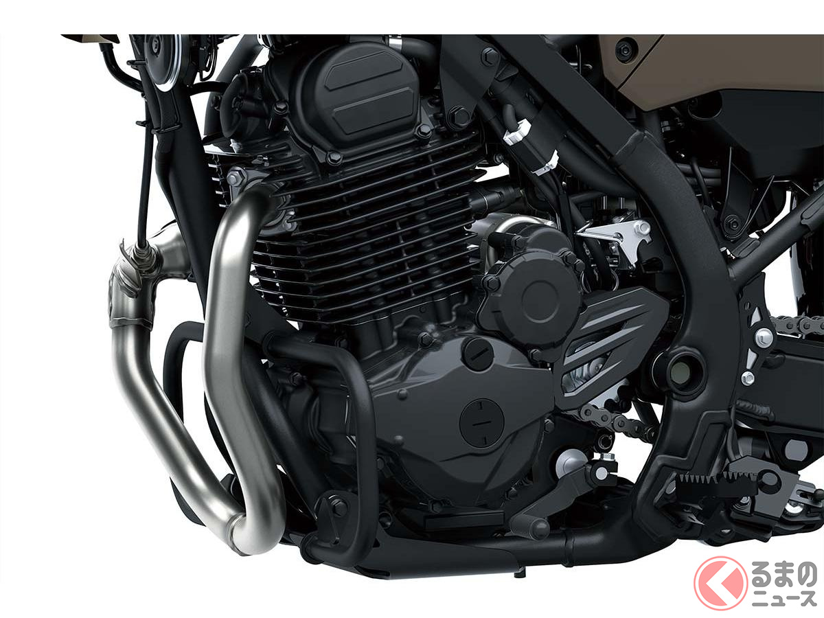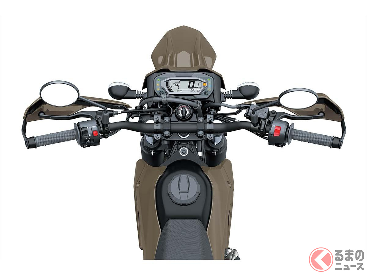カワサキが超ゴツい「新型オフロードバイク」発表! あふれる“ミリタリー感”が超カッコいい「リアキャリア」や「エンジンガード」を標準装備! 新型「KLX230 DF」発売へ!