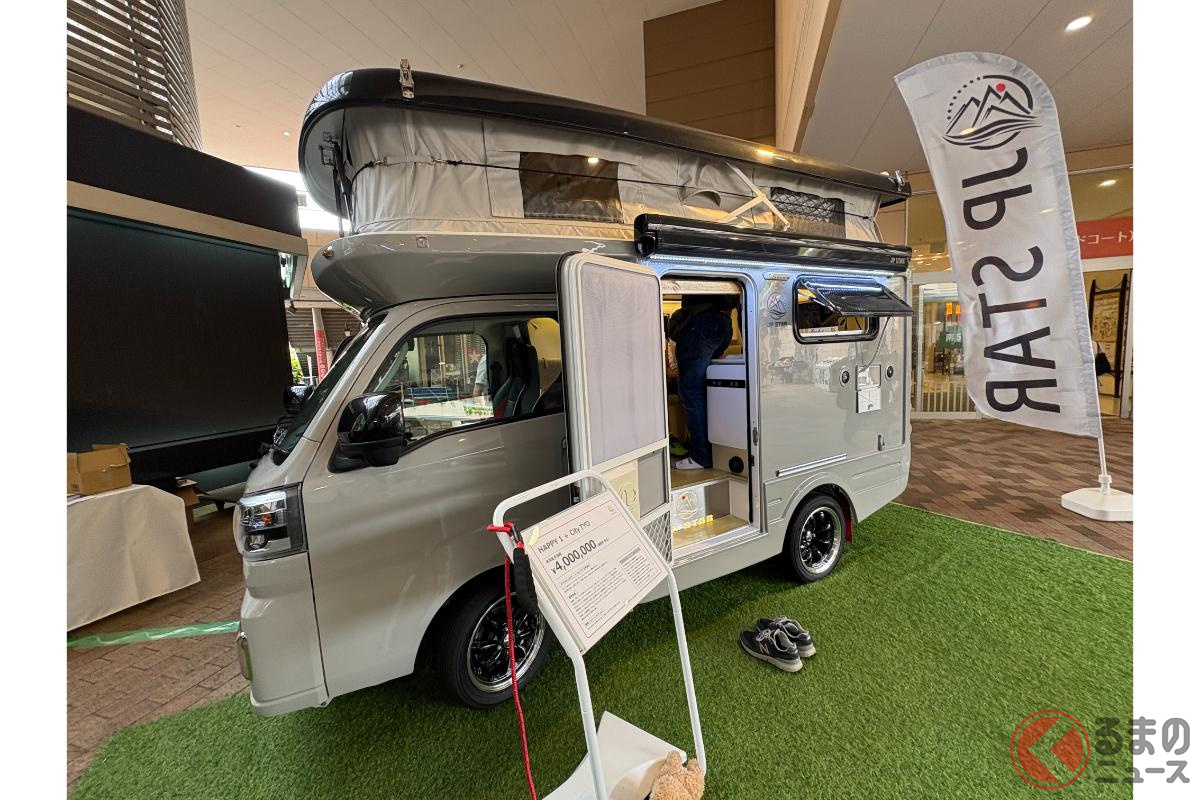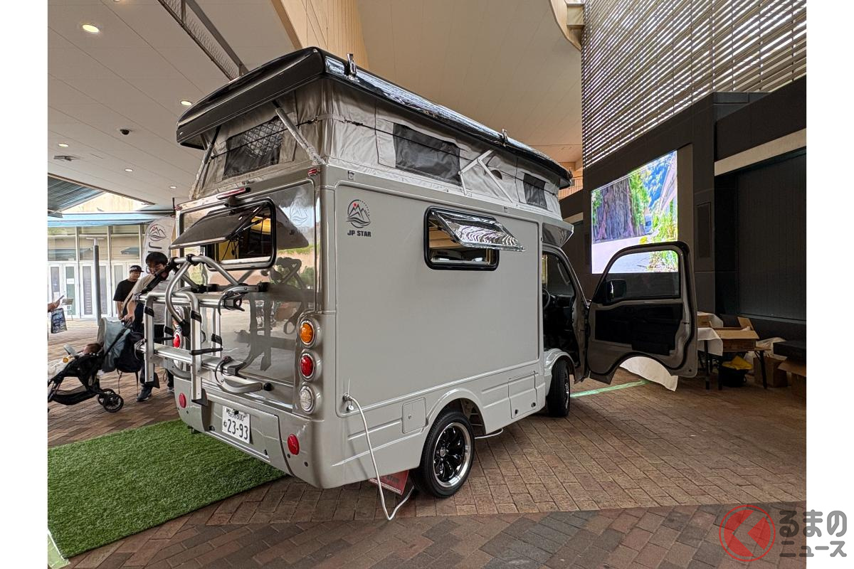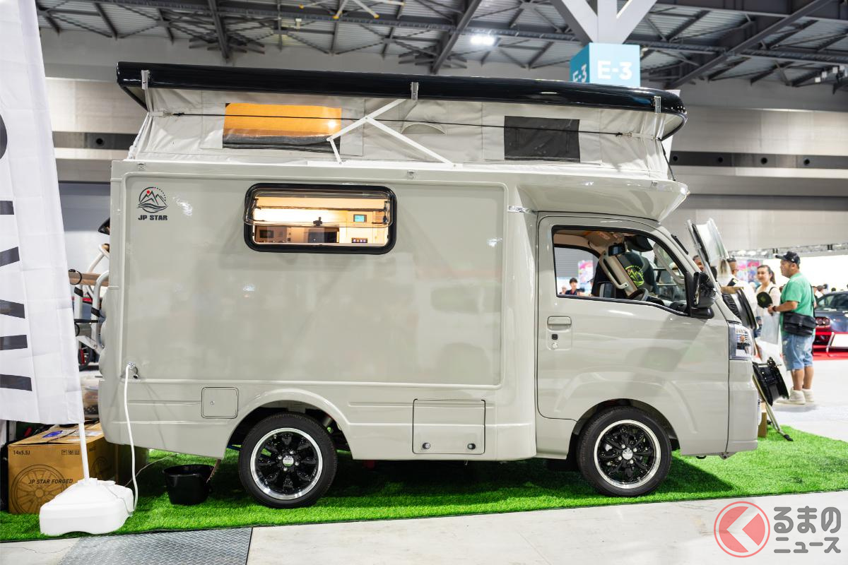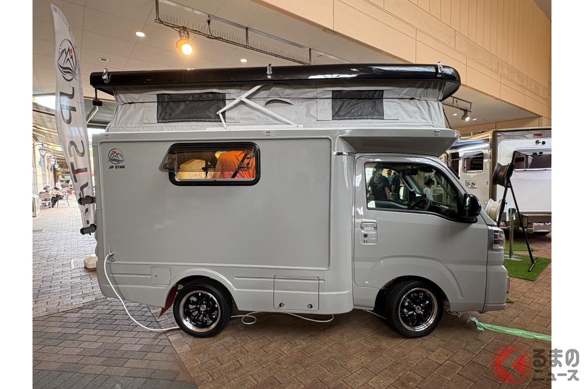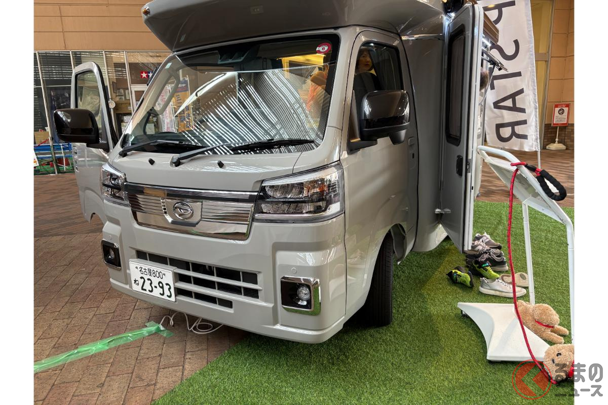 400万円! 4人乗れる「“軽規格超え”軽トラ」Happy1+ city TYOに反響多数! ダイハツ「ハイゼットトラック」ベースの「超広々仕様」に「YouTubeでみた!」「見た目より広そう」の声も! 4人寝られるJP STARキャンパー展示に“熱視線”集まる!