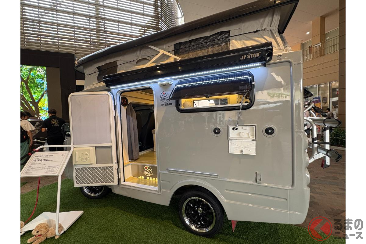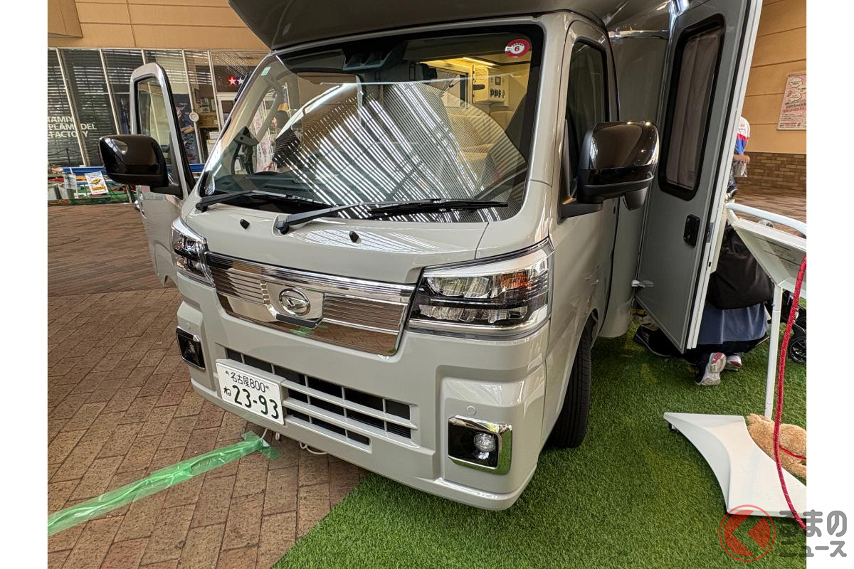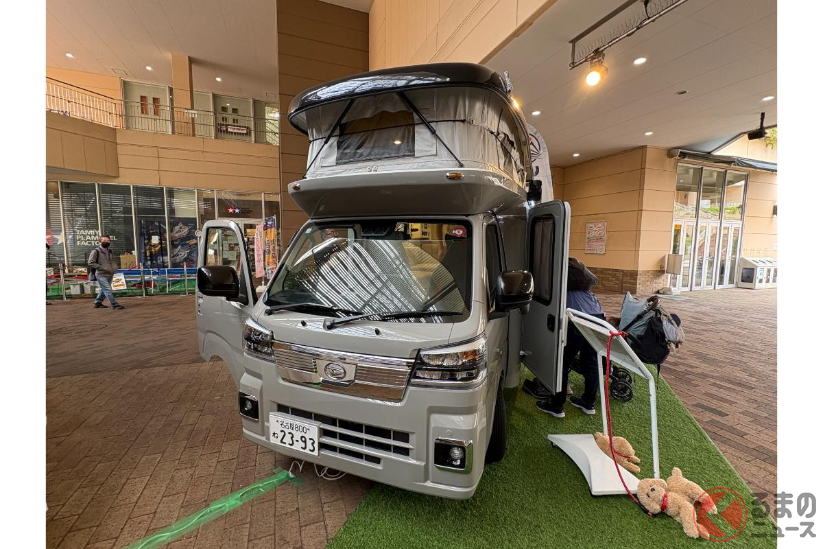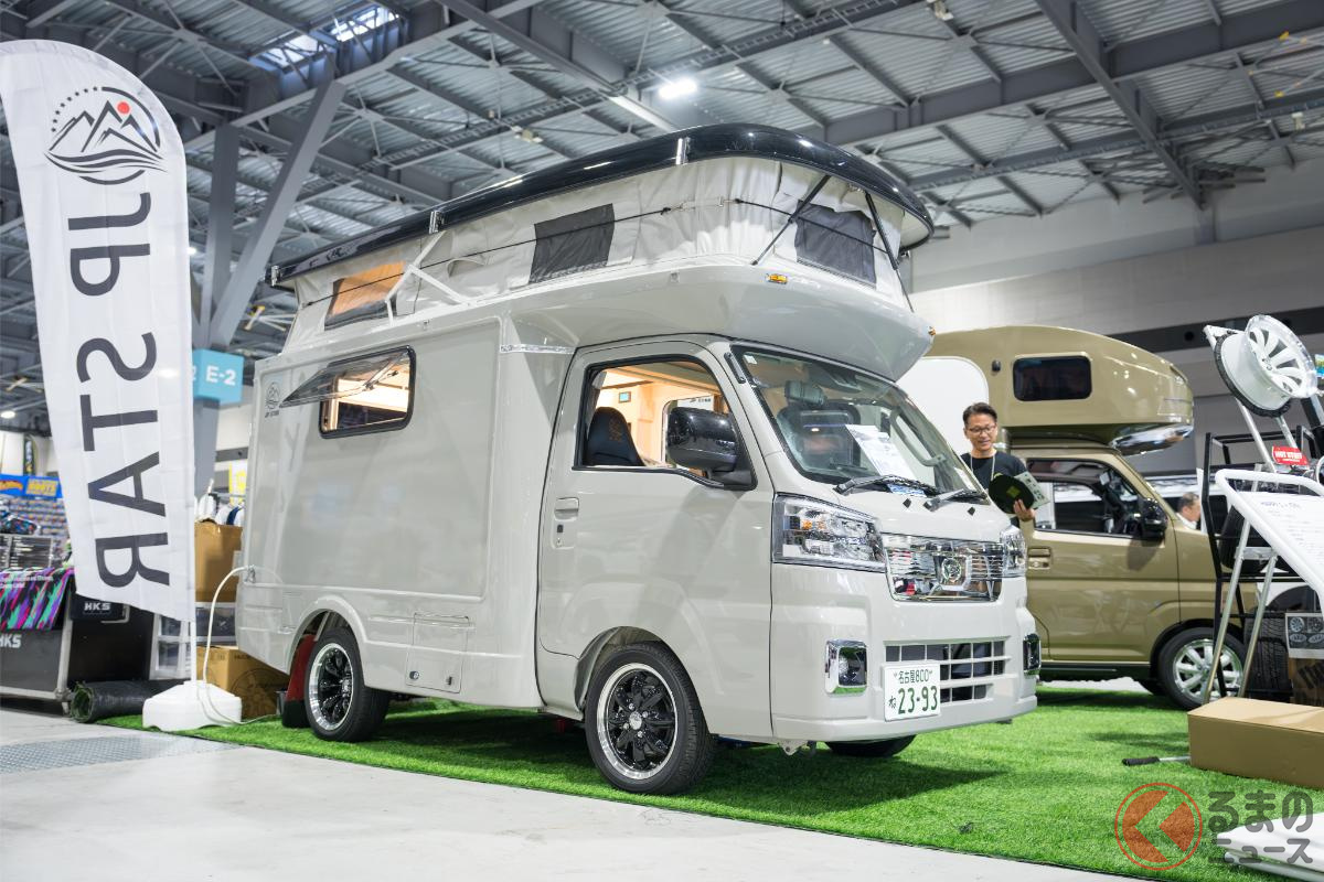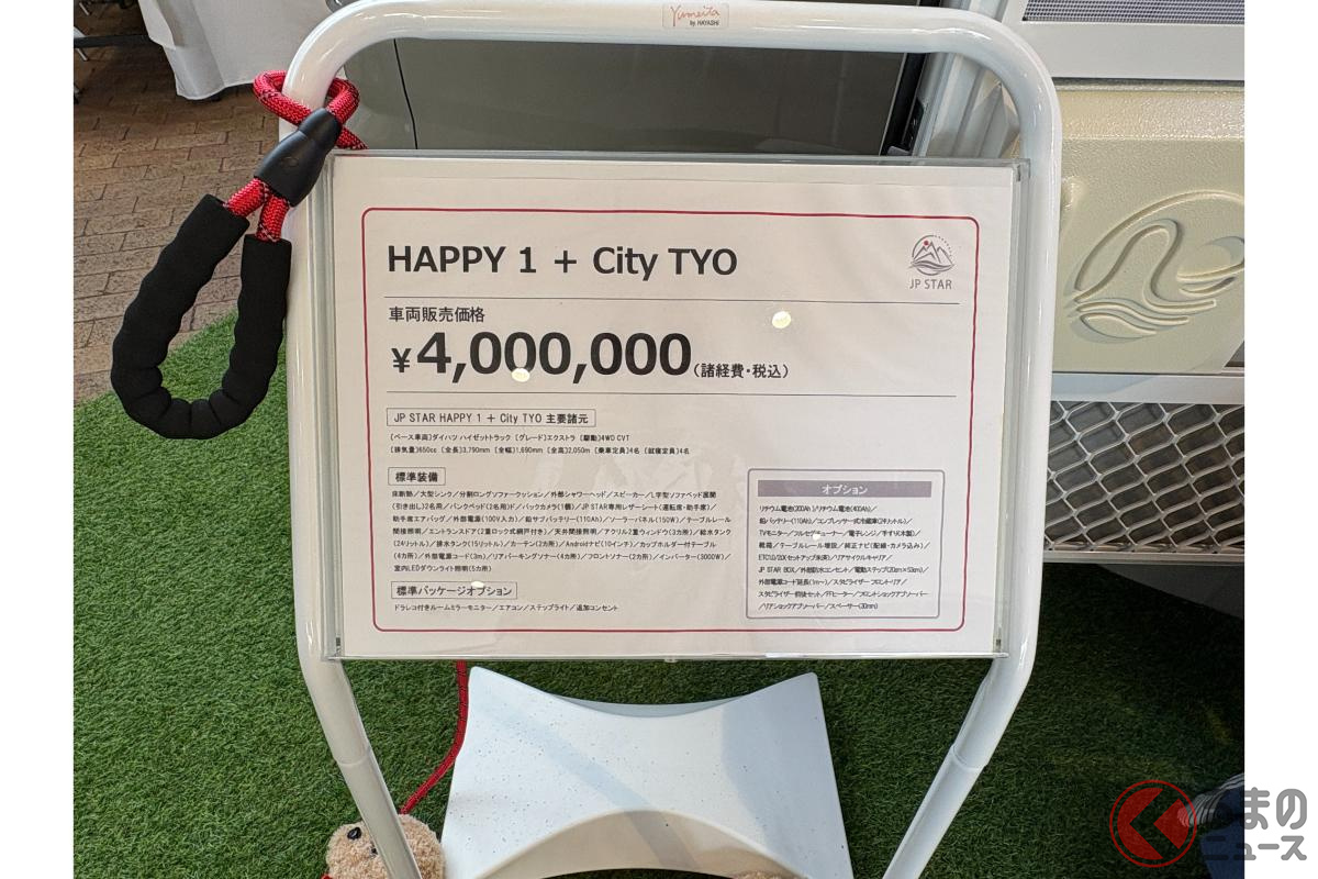 400万円! 4人乗れる「“軽規格超え”軽トラ」Happy1+ city TYOに反響多数! ダイハツ「ハイゼットトラック」ベースの「超広々仕様」に「YouTubeでみた!」「見た目より広そう」の声も! 4人寝られるJP STARキャンパー展示に“熱視線”集まる!