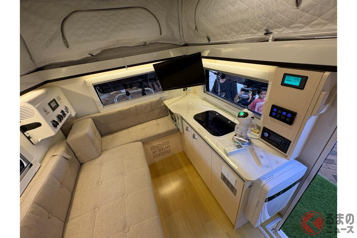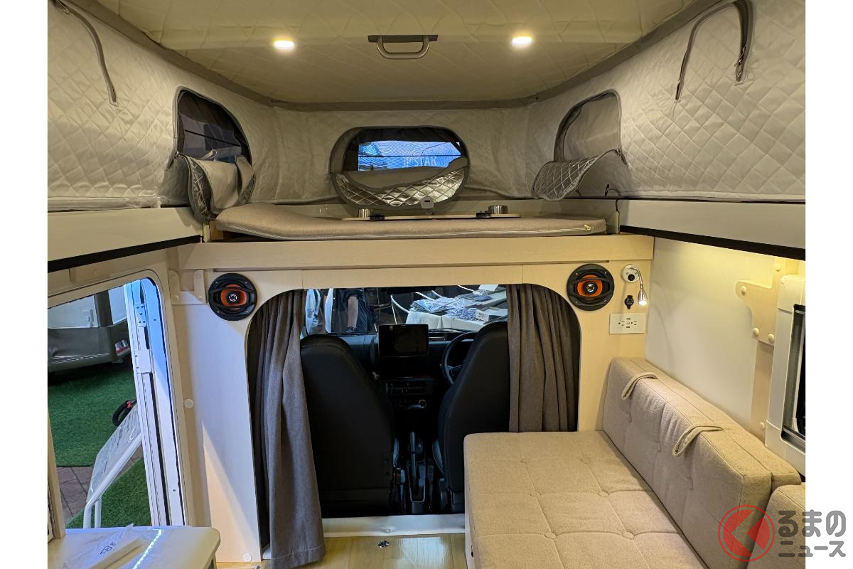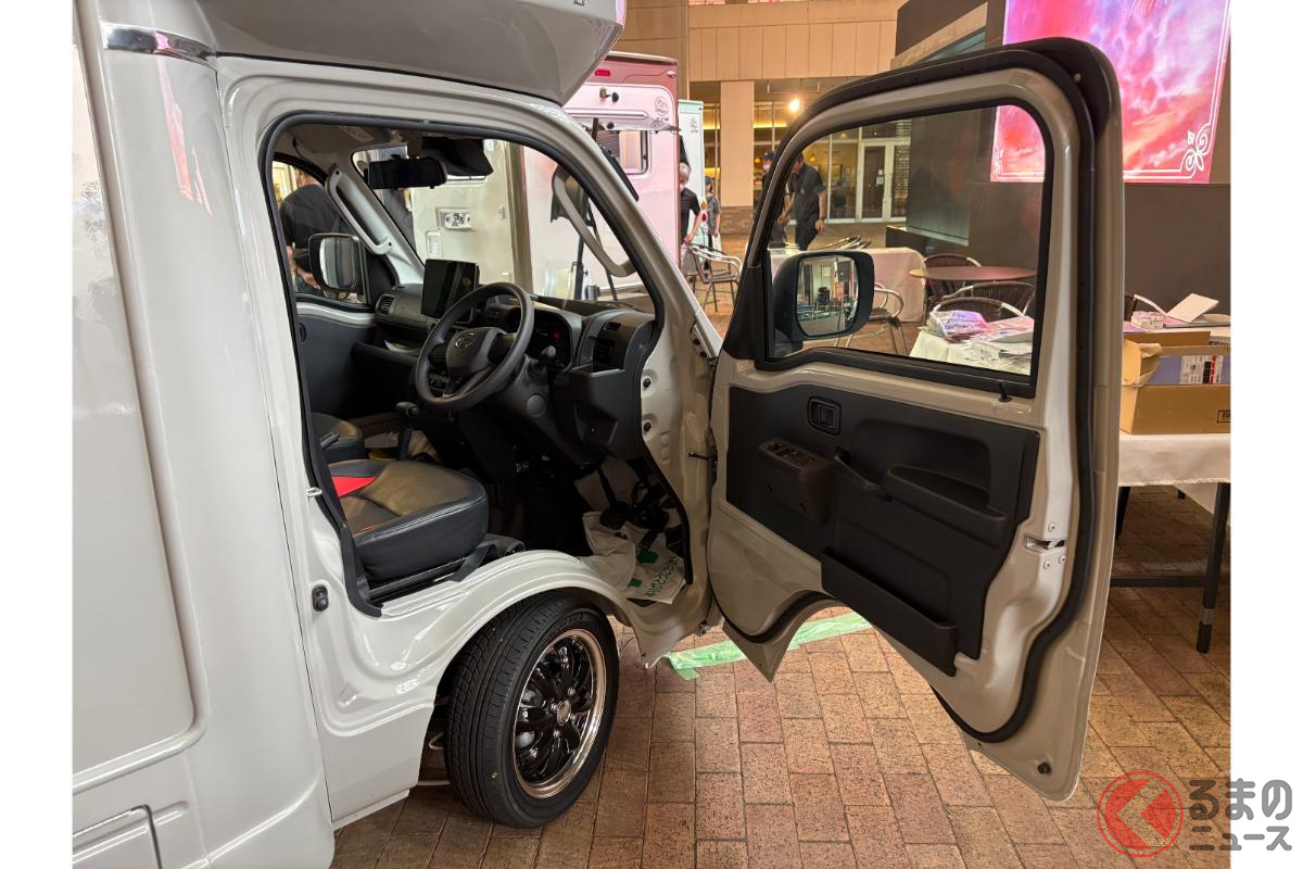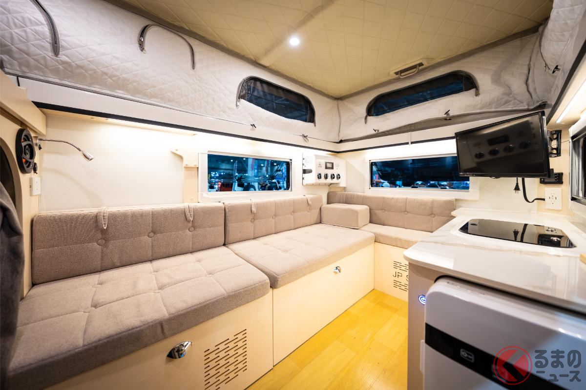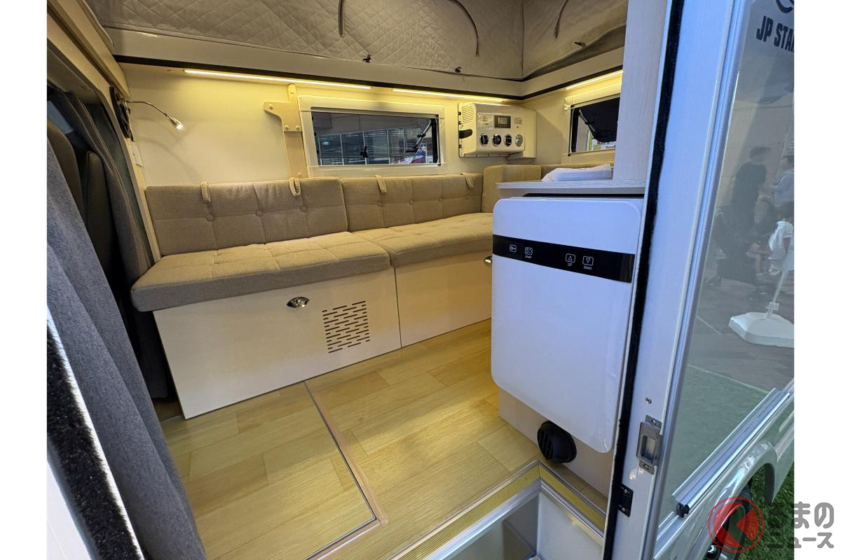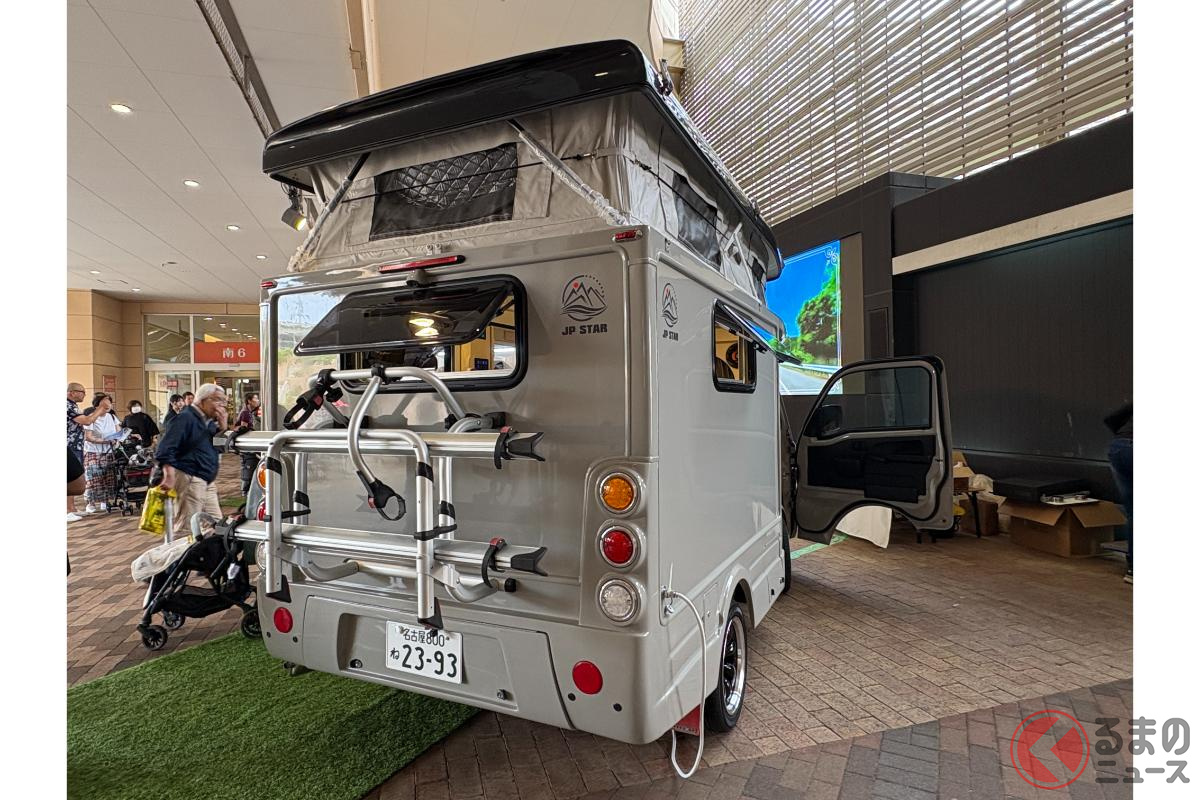 400万円! 4人乗れる「“軽規格超え”軽トラ」Happy1+ city TYOに反響多数! ダイハツ「ハイゼットトラック」ベースの「超広々仕様」に「YouTubeでみた!」「見た目より広そう」の声も! 4人寝られるJP STARキャンパー展示に“熱視線”集まる!