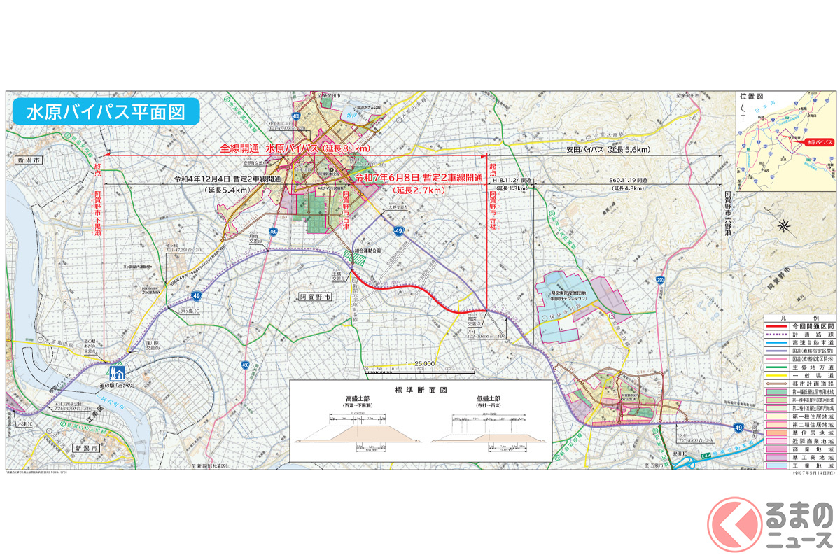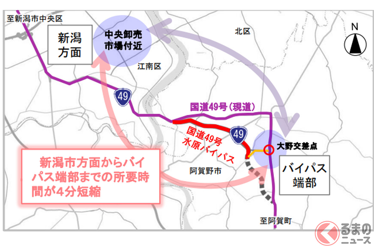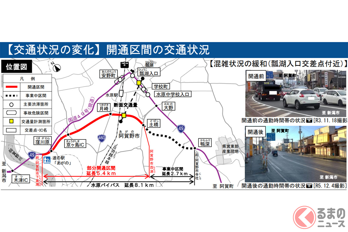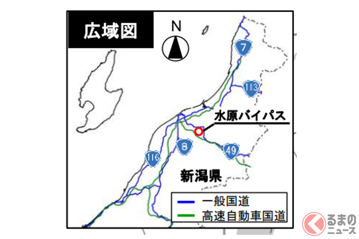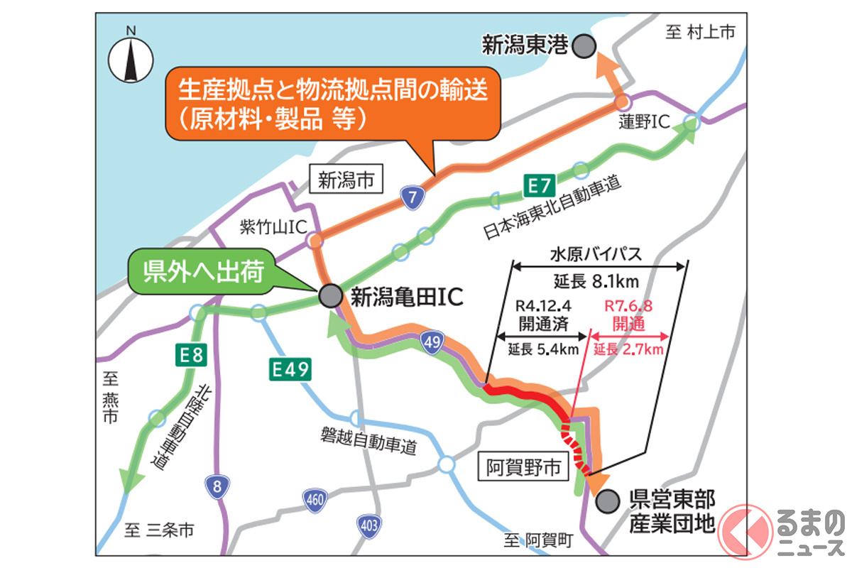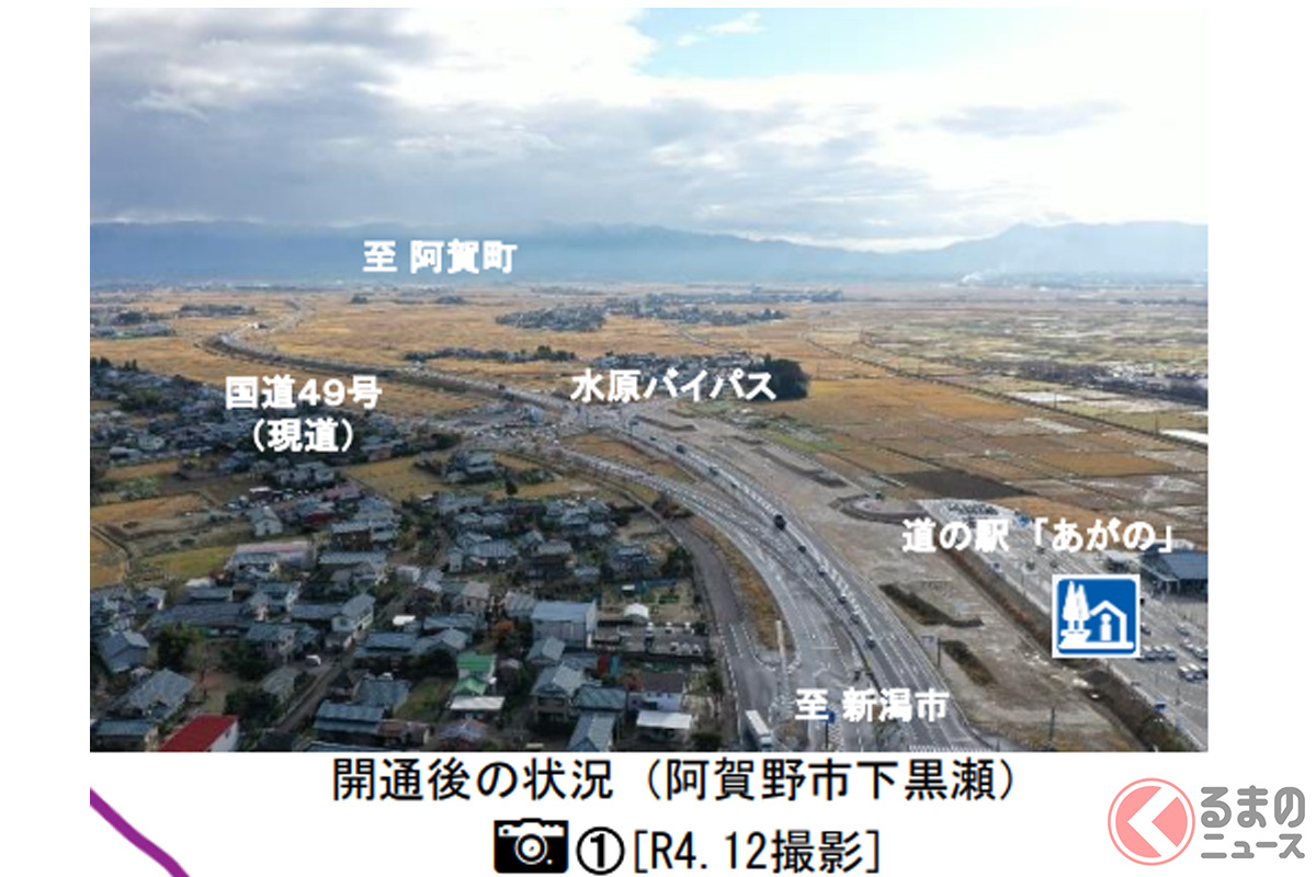 2025年6月8日、新潟県阿賀野市を通る国道49号「水原バイパス」が全線開通しました。これが開通するとどのような効果が見込めるのでしょうか。