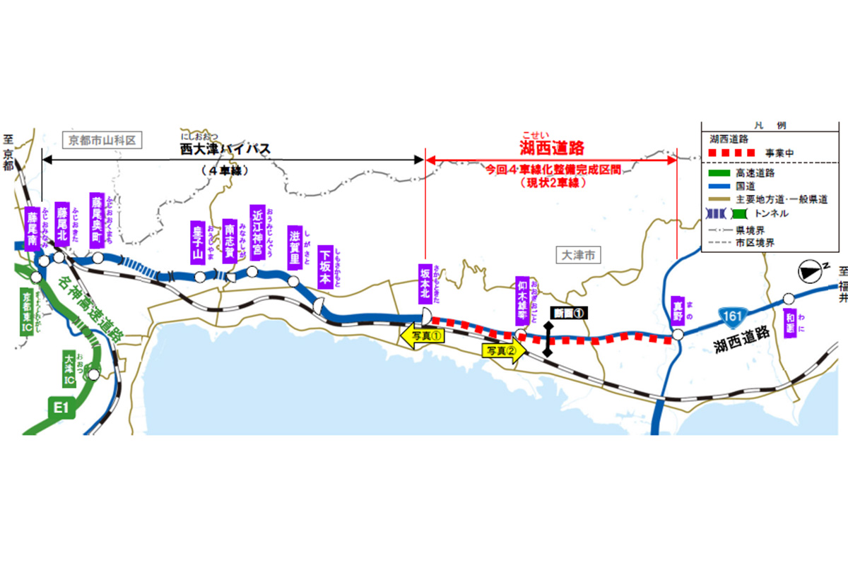 滋賀県大津市の国道161号「湖西道路」真野IC~坂本北IC間(6.6km)が4車線化され、2025年11月に開通します。