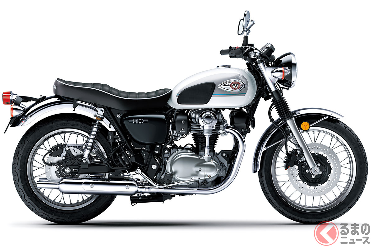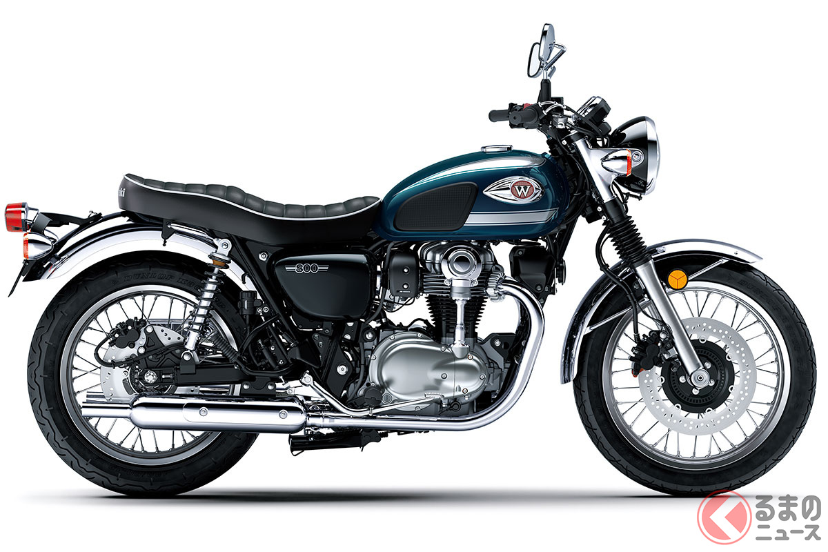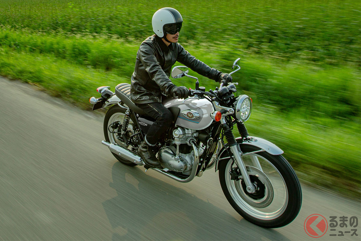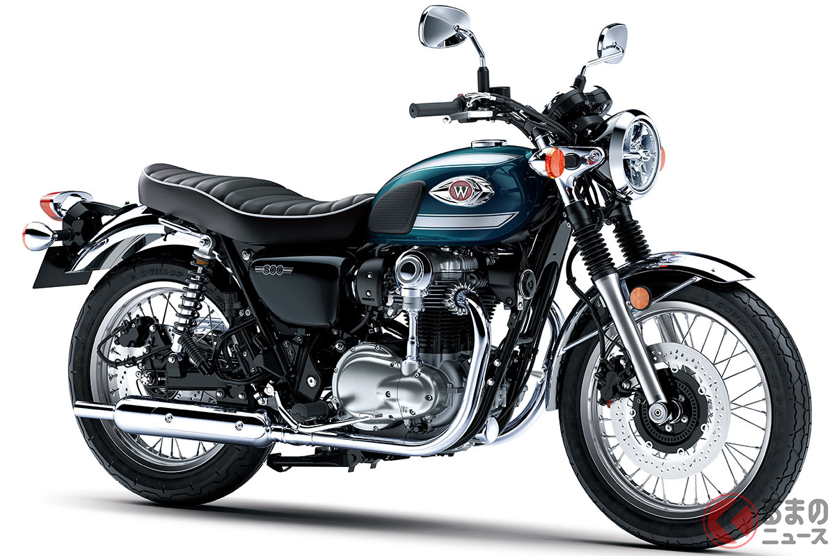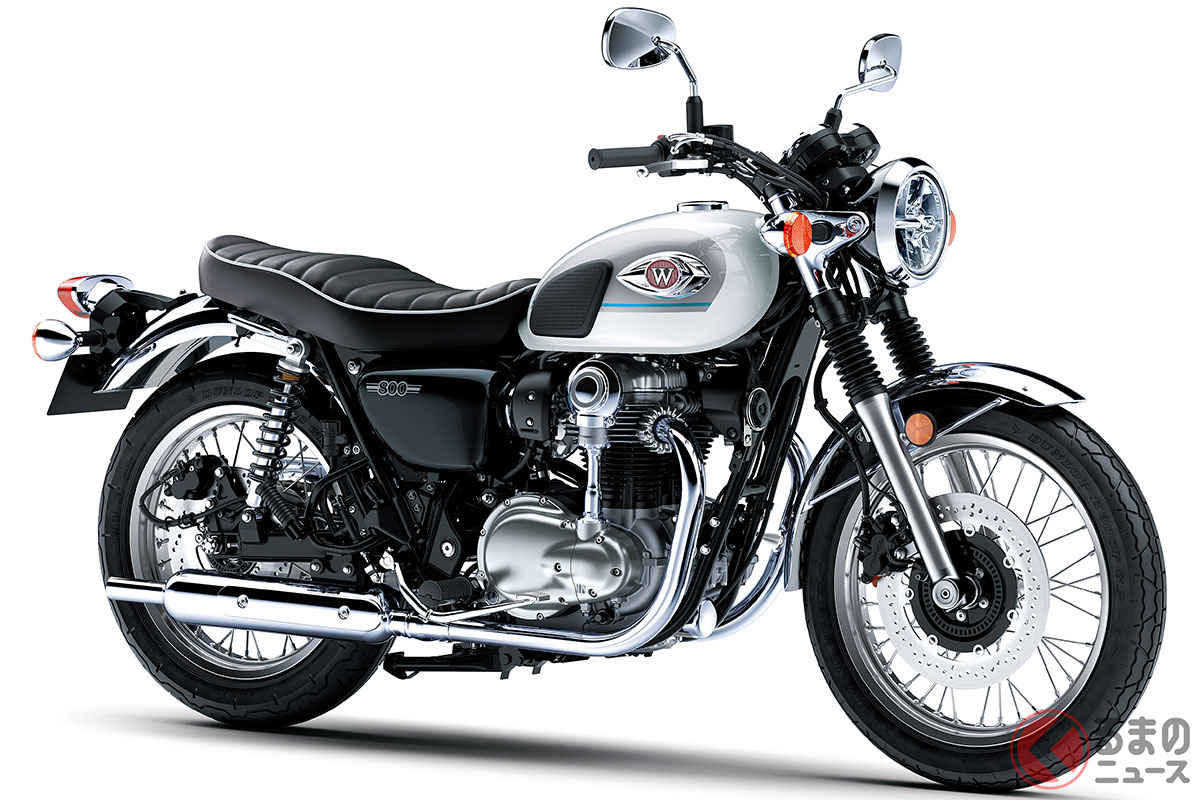カワサキ新「大型レトロバイク」発表! “旧車感”スゴイ丸目の「昭和風デザイン」採用! 直立した「2気筒エンジン」搭載した“W800”は新カラーとグラフィックが美しい!