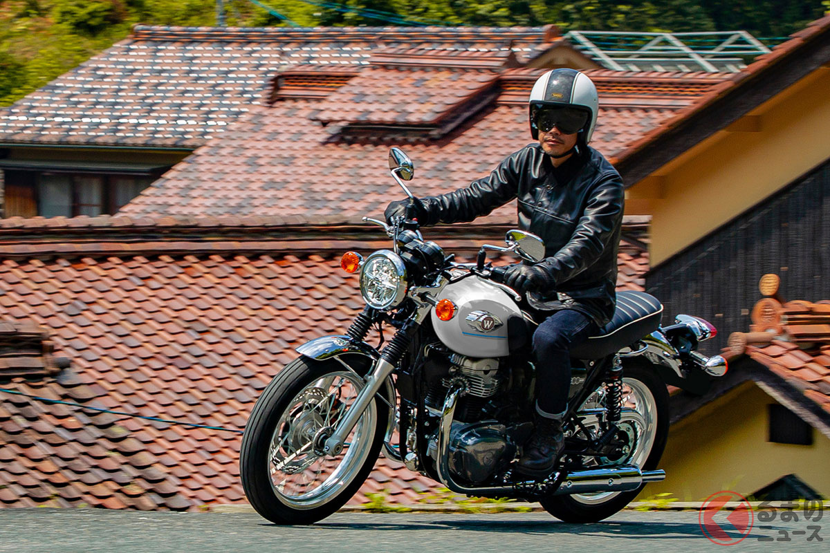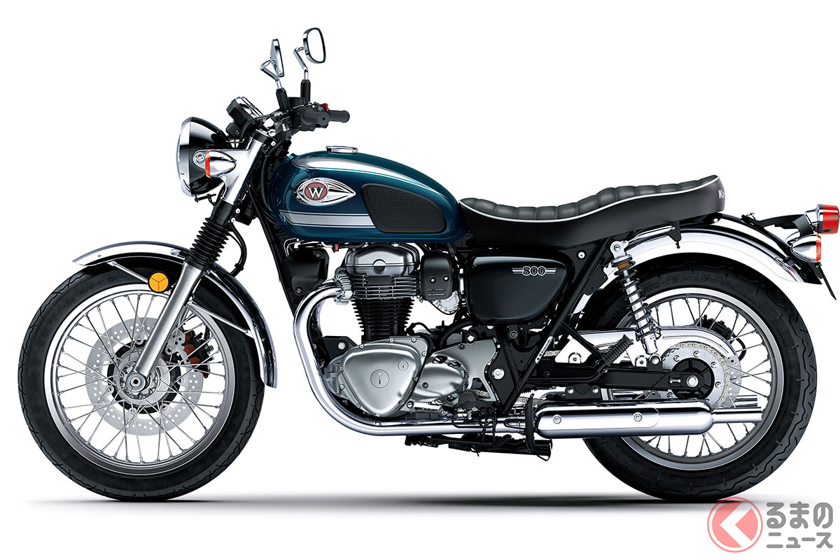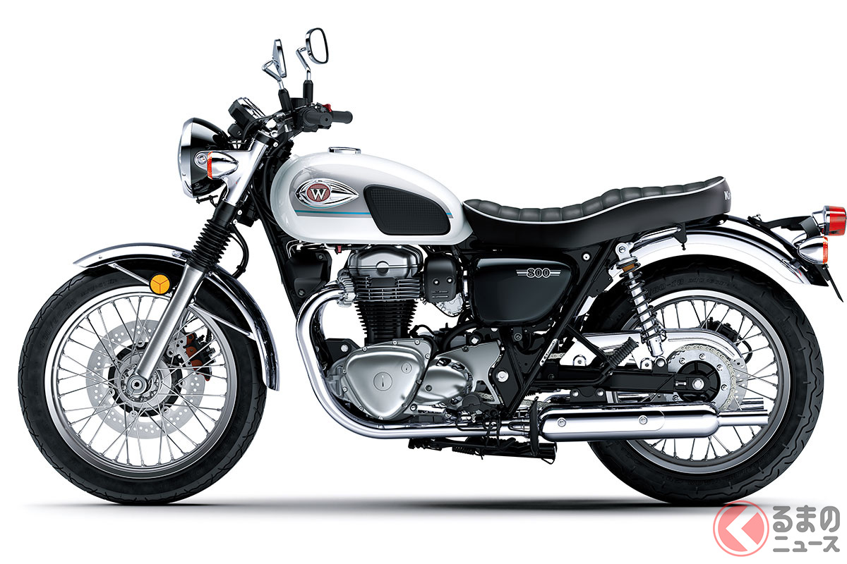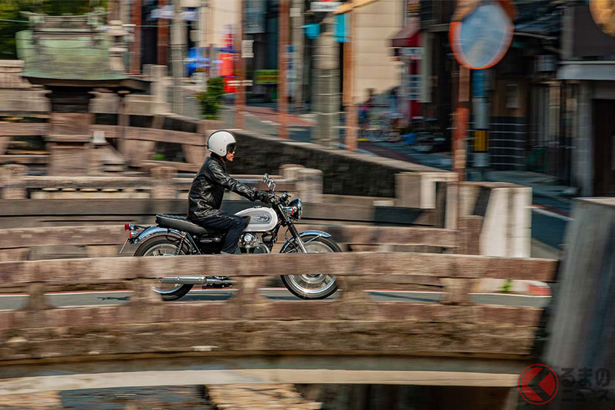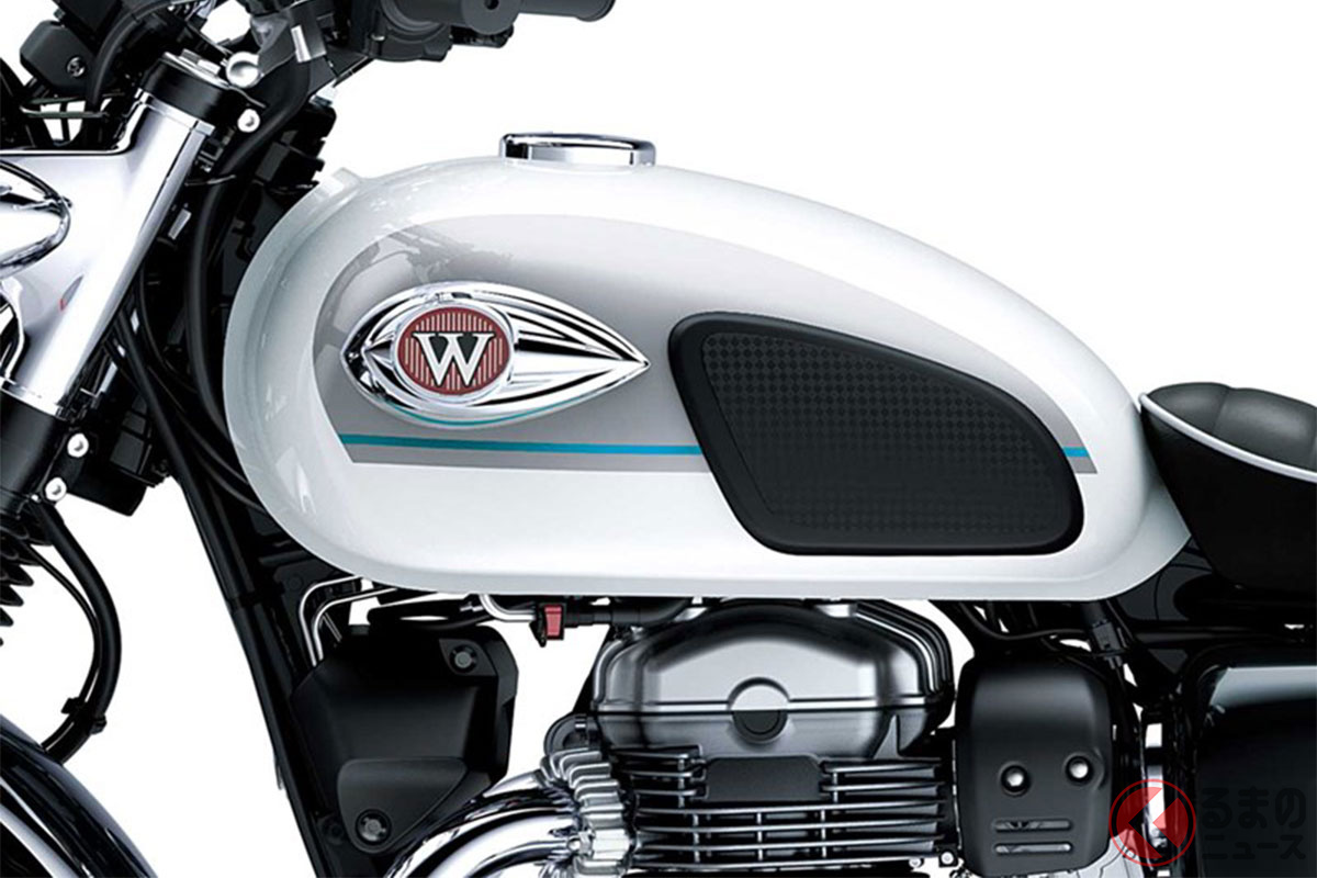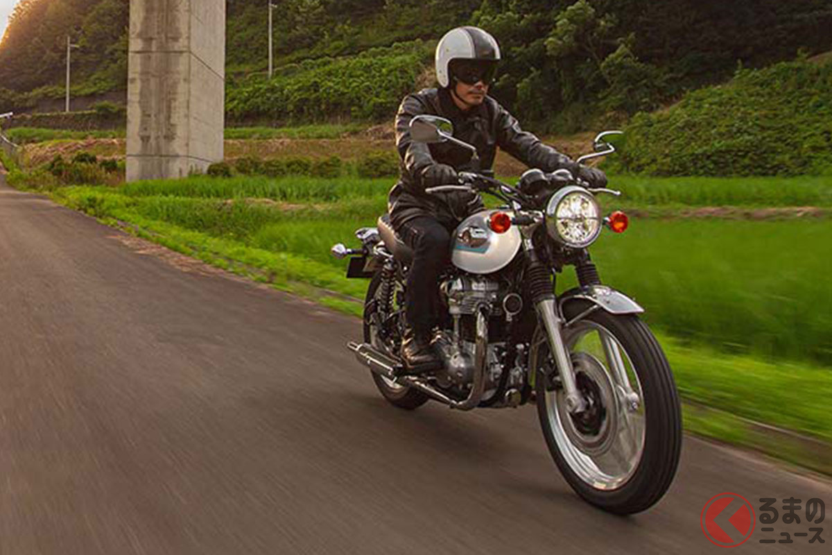 カワサキ新「大型レトロバイク」発表! “旧車感”スゴイ丸目の「昭和風デザイン」採用! 直立した「2気筒エンジン」搭載した“W800”は新カラーとグラフィックが美しい!