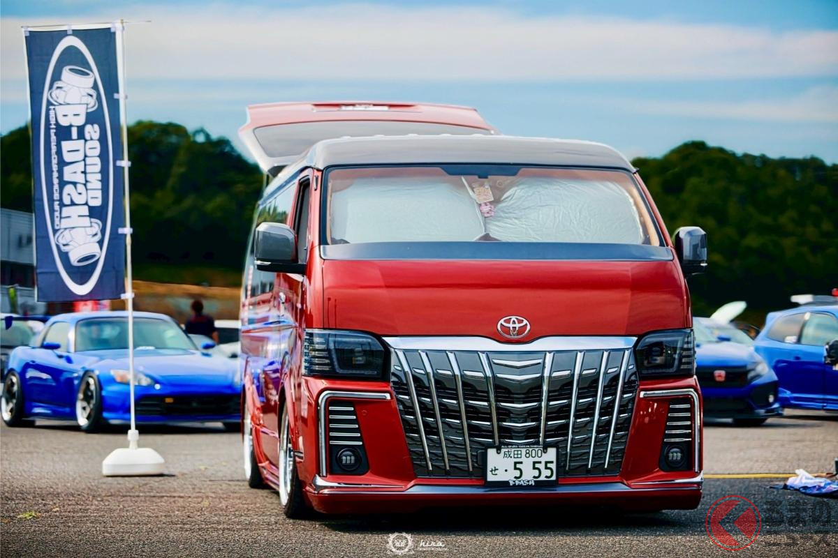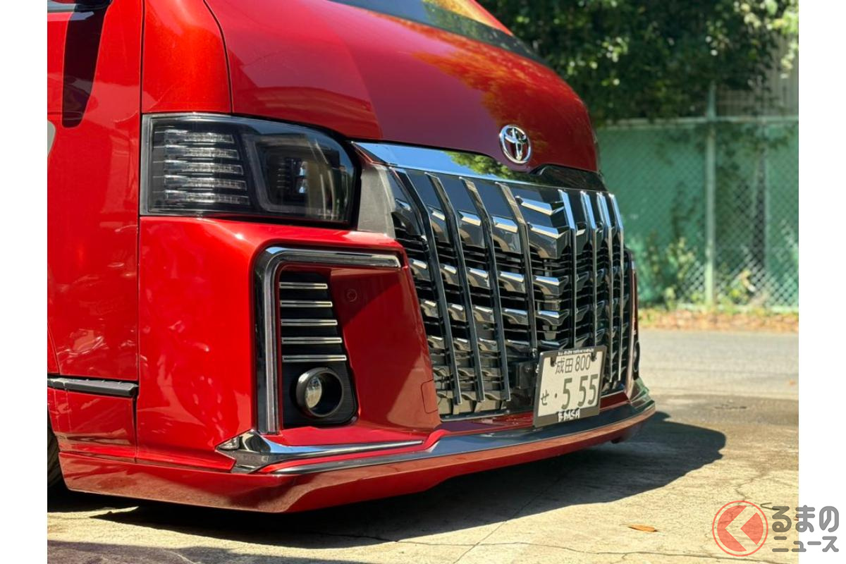 トヨタ「アルファード」風のフロントマスクを得た「ハイエース」が、全国各地の自動車関係のイベントブースで目撃されています。この個体には、どのようなカスタムが施されているのでしょうか。