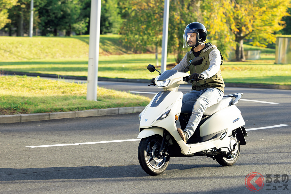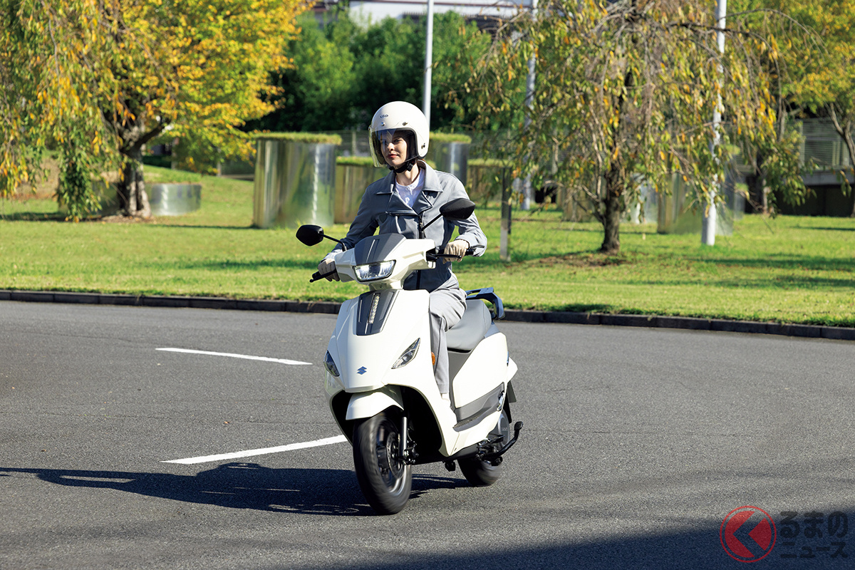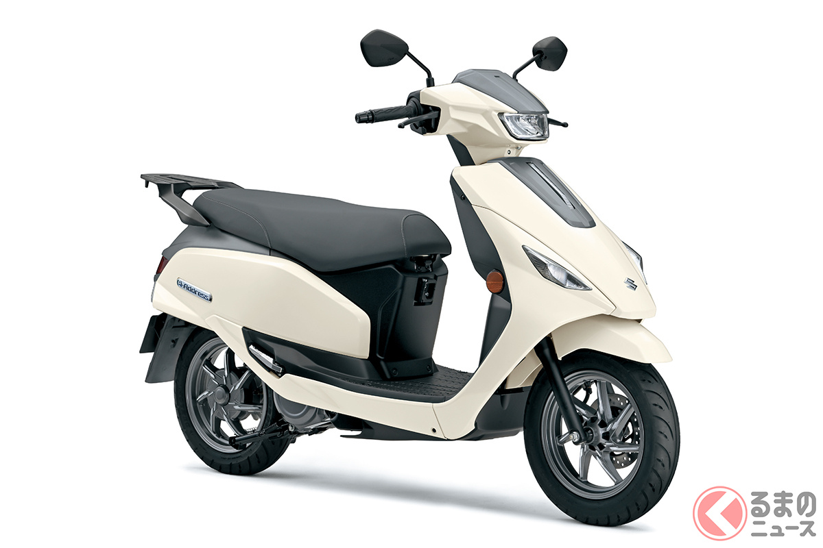 スズキが人気モデル「アドレス」の快適仕様を日本初公開! 排気ガス出ないエコモデル!? シート下には収納スペース完備! 「e-Address」をJMS2025に展示