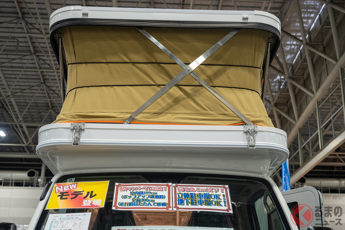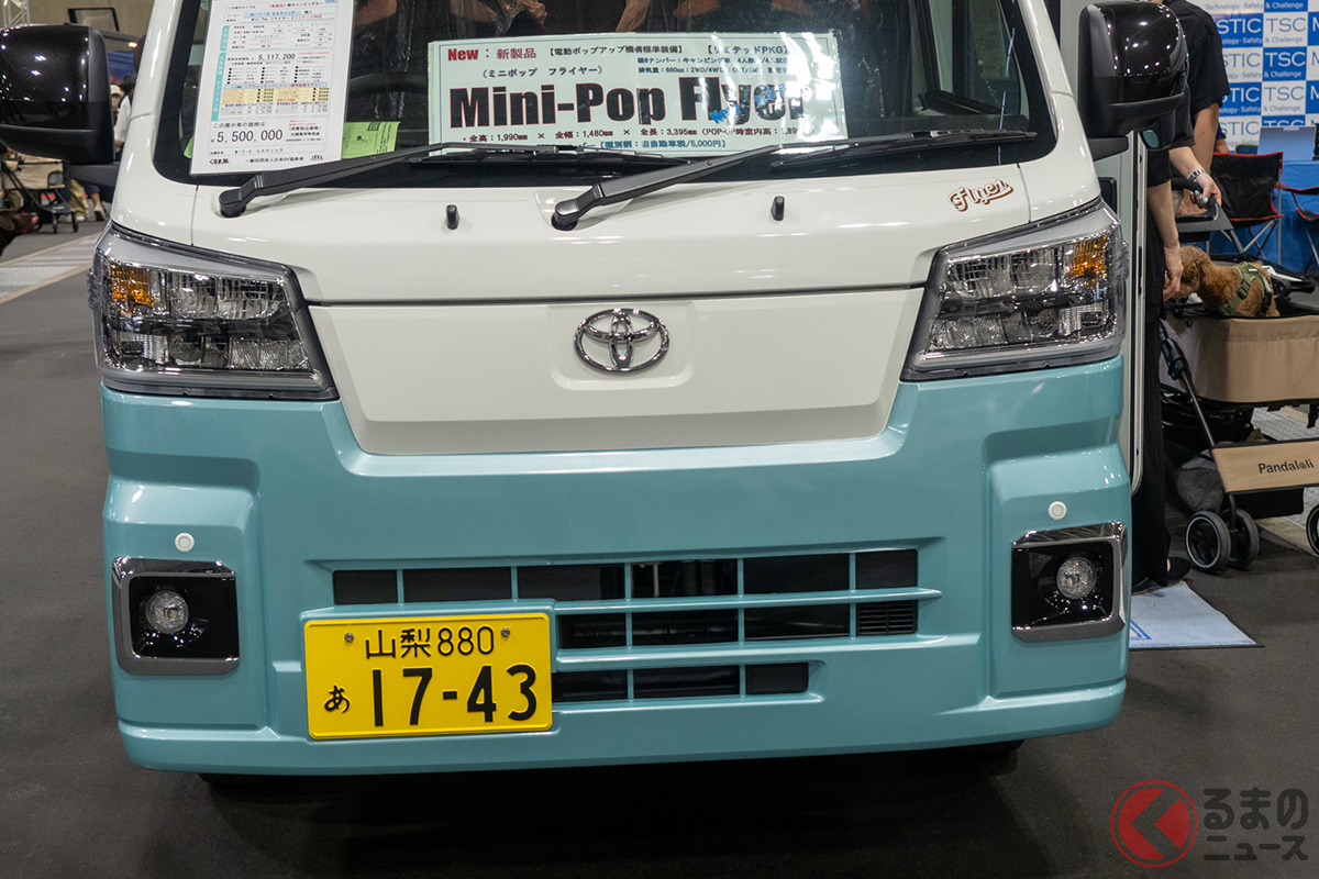 トヨタの「“2階建て”軽トラ!?」実車公開! PIXISトラックで「大人4人“寝られる”」!? 上下で開く「ポップアップ屋根」がスゴいMYSミスティックの新型軽キャンパー「Mini POP Flyer」に注目