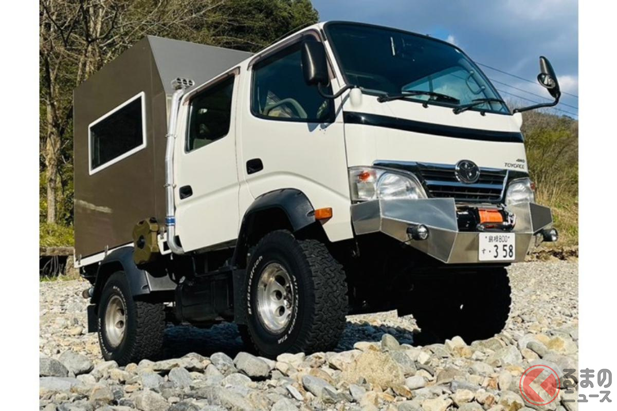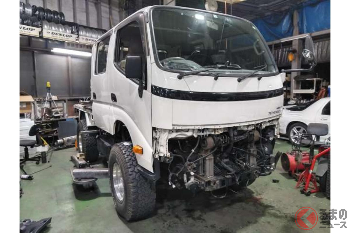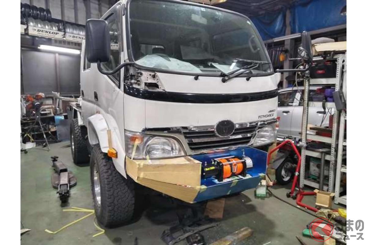 商用トラックとして知られるトヨタ「トヨエース」をベースに、SUVテイストへ思い切ったカスタムを施した個体が中古市場に姿を現しました。ボディを持ち上げて大型タイヤを履かせ、フロントまわりはフル造形のアルミバンパーへ刷新。従来の「業務用」の枠を軽やかに超える存在として注目を集めているようです。