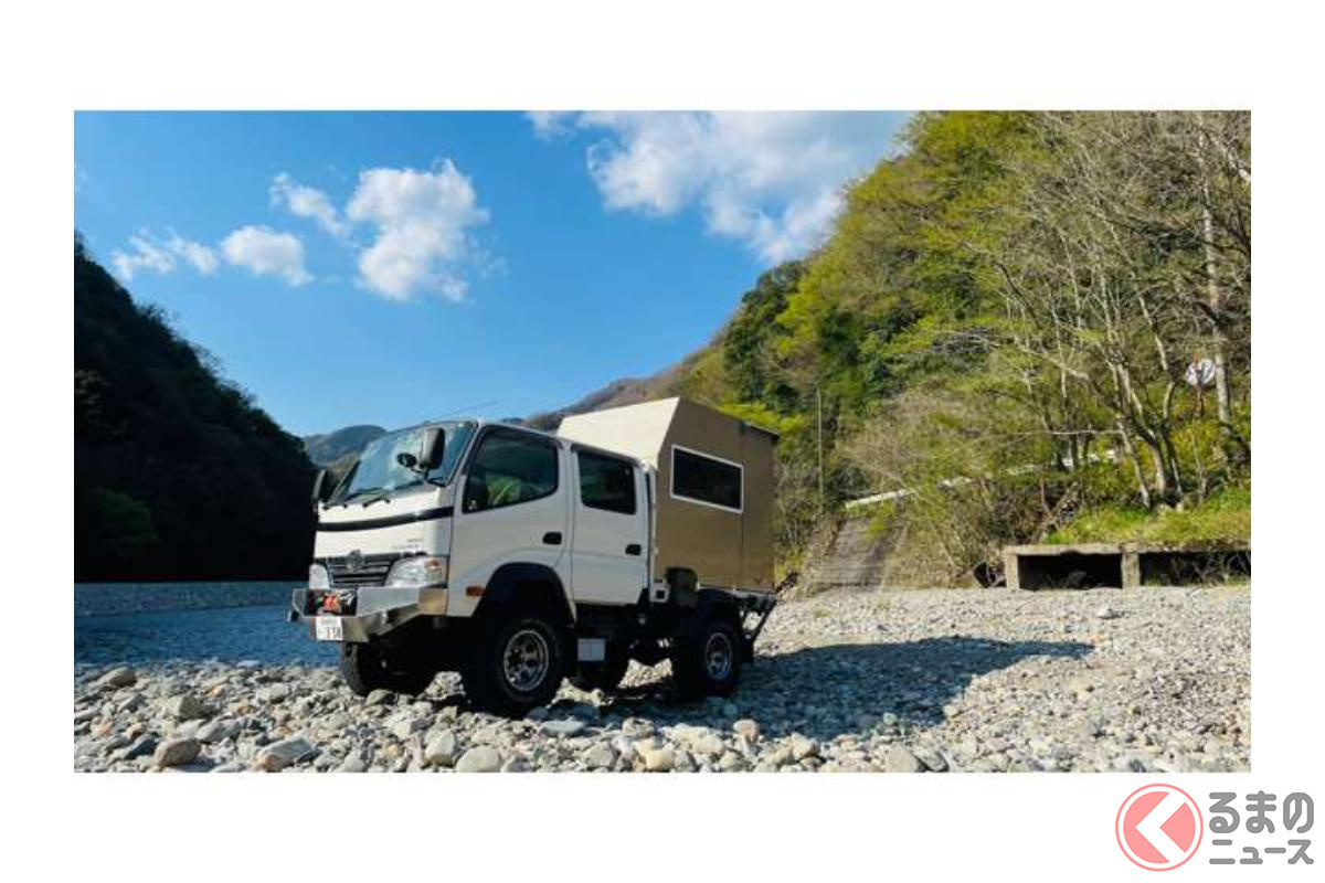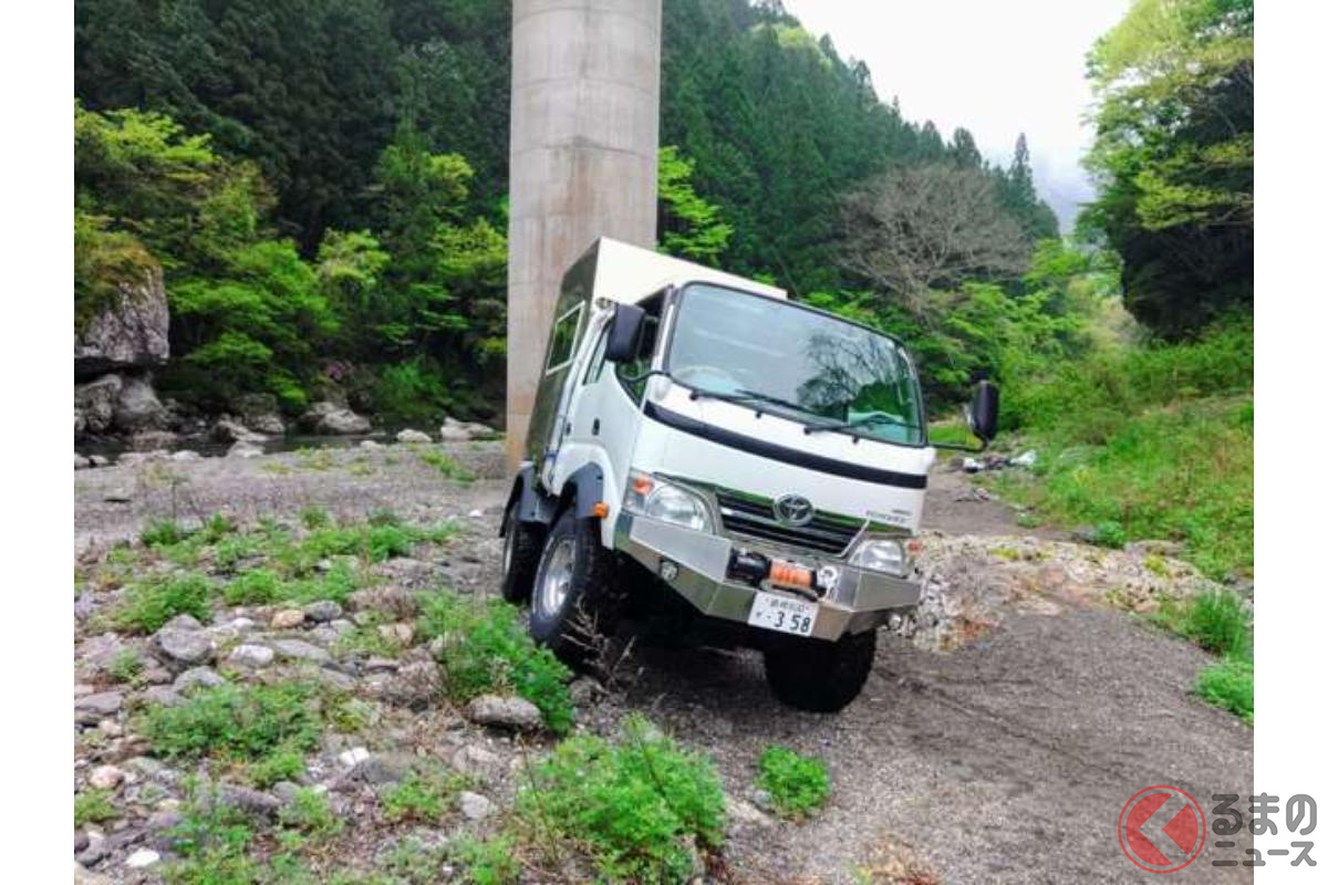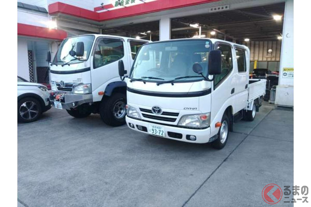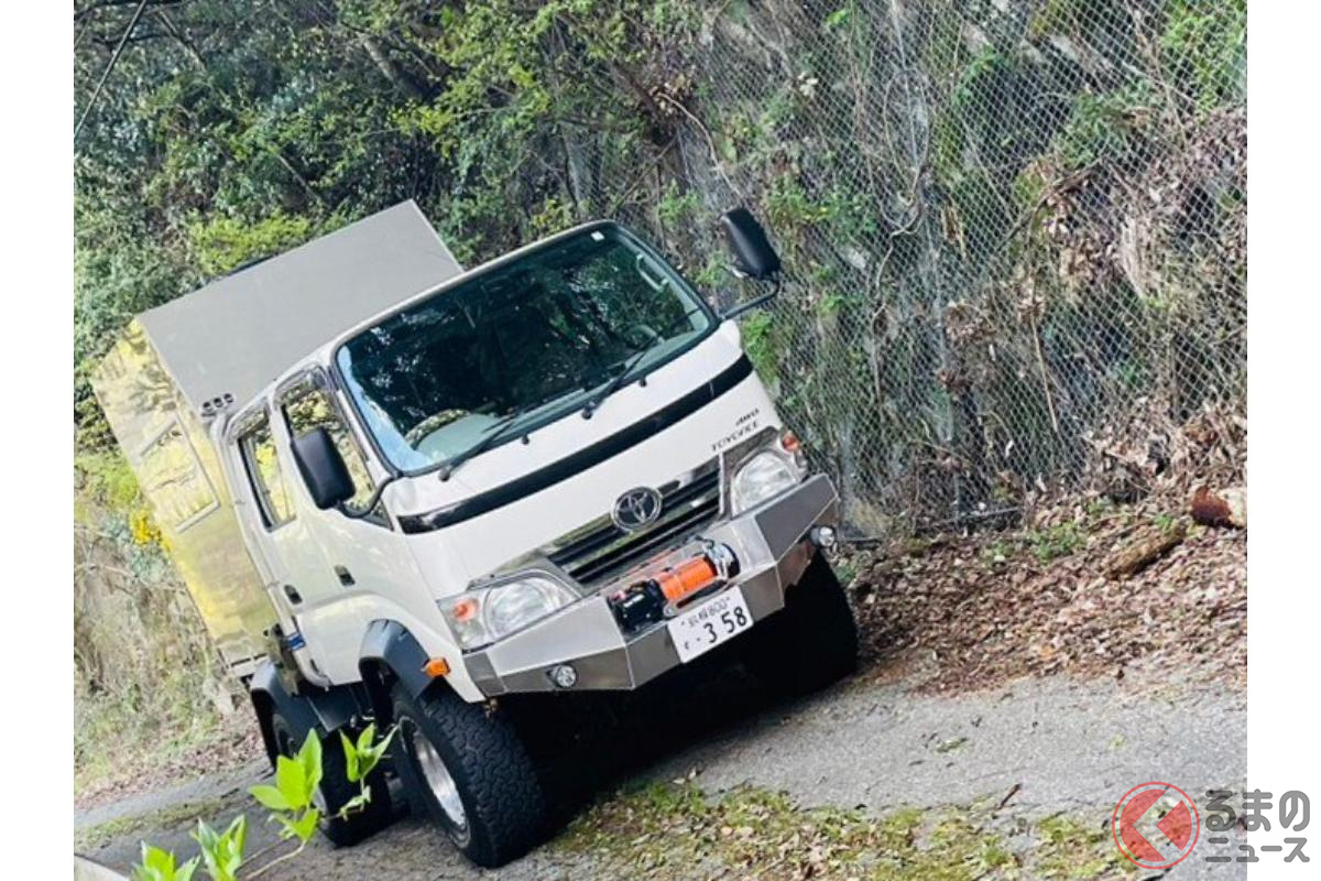 商用トラックとして知られるトヨタ「トヨエース」をベースに、SUVテイストへ思い切ったカスタムを施した個体が中古市場に姿を現しました。ボディを持ち上げて大型タイヤを履かせ、フロントまわりはフル造形のアルミバンパーへ刷新。従来の「業務用」の枠を軽やかに超える存在として注目を集めているようです。