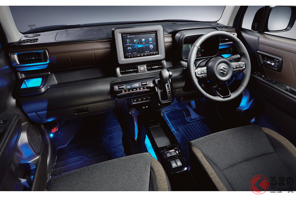 スズキ「新型コンパクトSUV」登場! デザイン刷新×新パワトレ搭載で走りも進化! めちゃ青く光るフロアイルミがスゴい! 「新型クロスビー」の斬新インテリアとは!