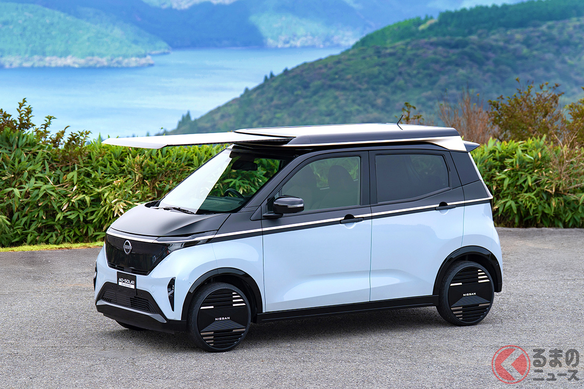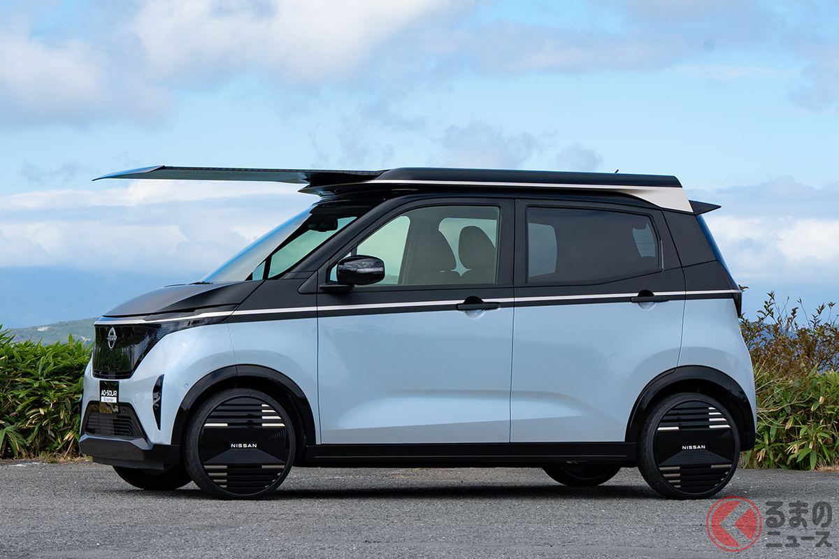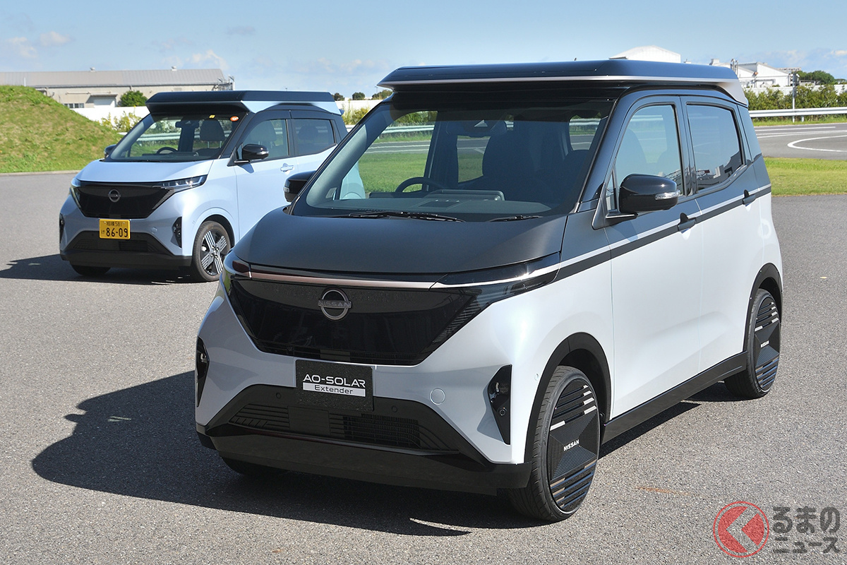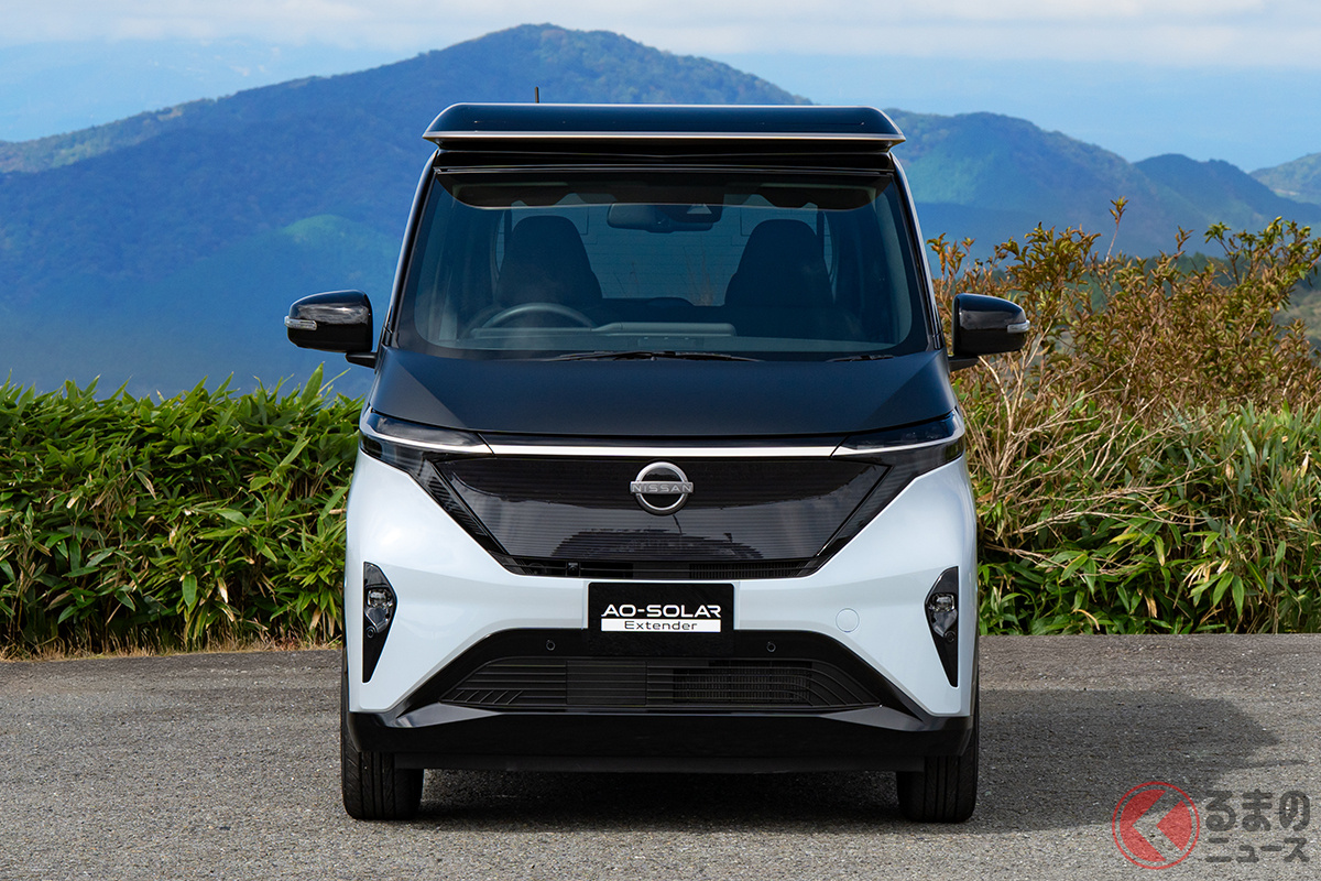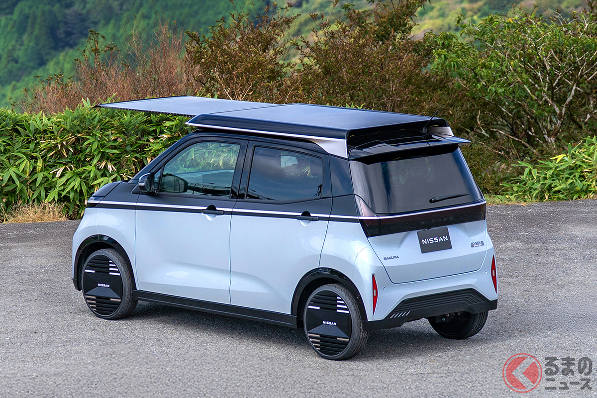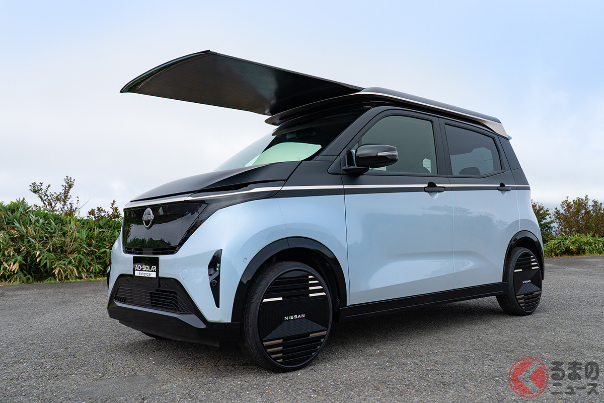 日産が「大型ソーラーパネル」搭載の新「軽EV」を発表! 500Wの「太陽光発電」可能に! 年間3千km相当の電力まかなえる「サクラ“あおぞら エクステンダー”」JMS2025に出展