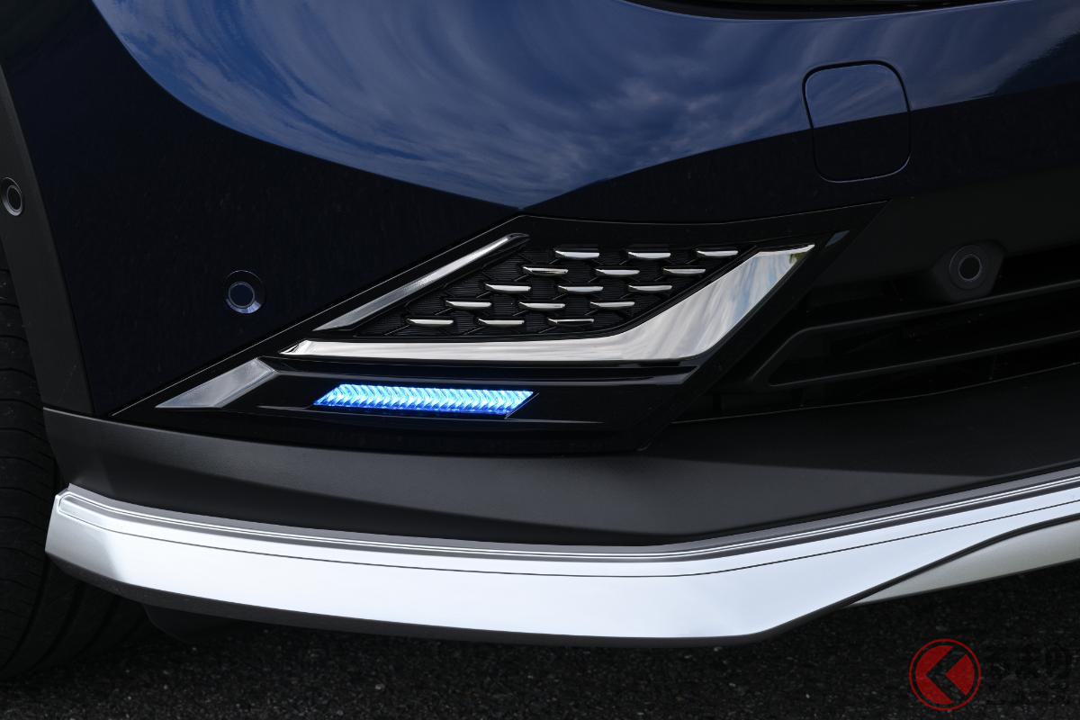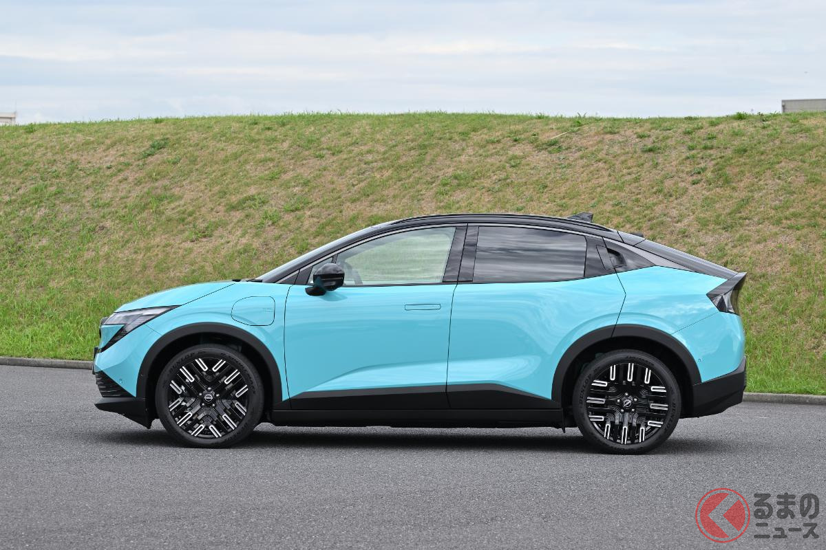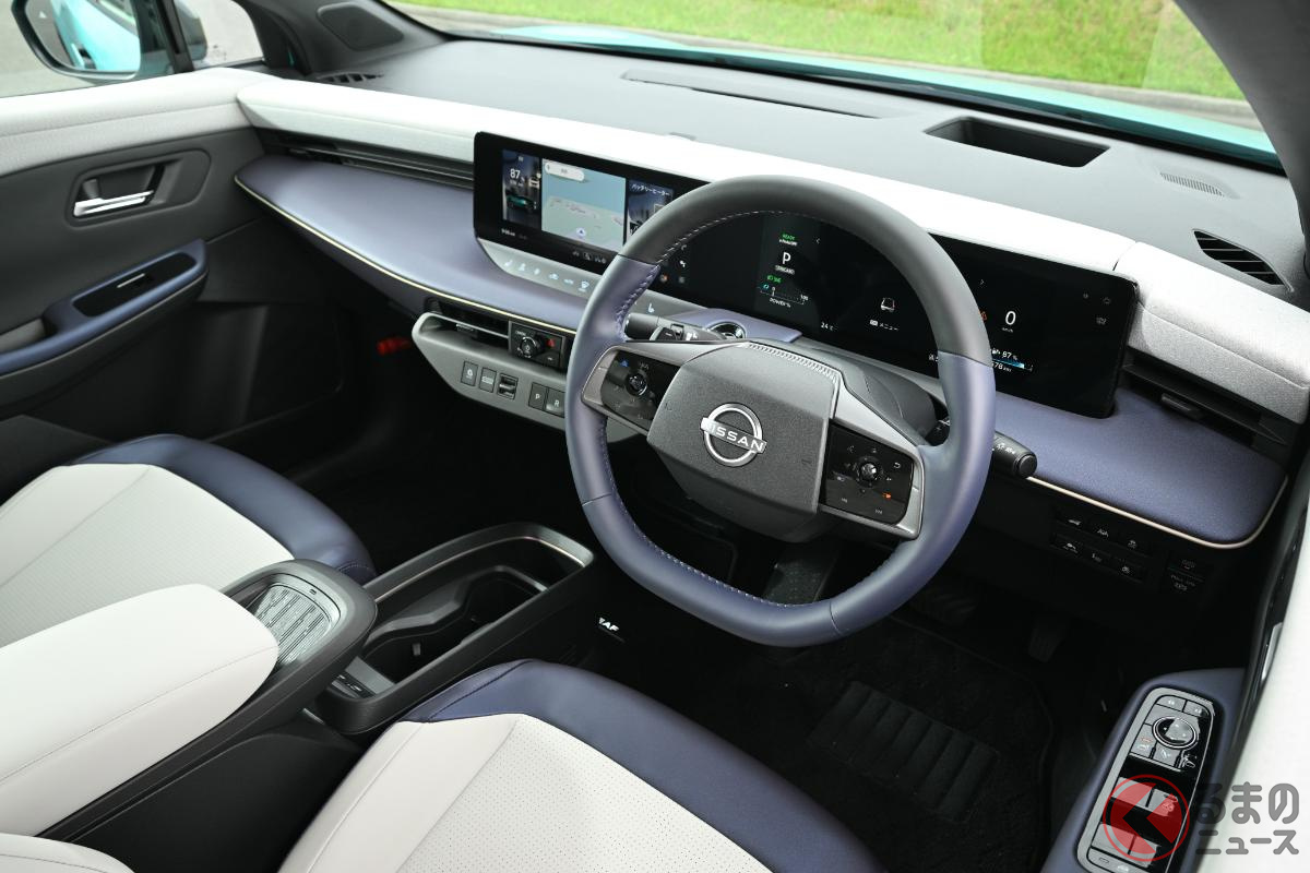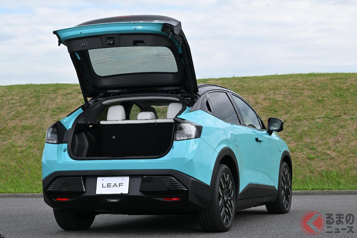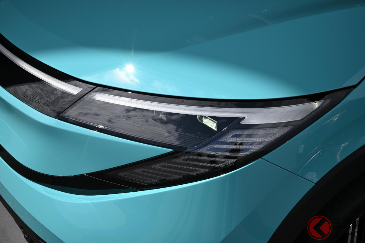 日産の新型「流麗クロスオーバー」発表! めちゃ青く光る「上質エクステリア」&“豪華内装”がカッコイイ! “専用ロゴ”で特別感満載! 全長4.3m“ちょうどいい”「リーフ」最高級モデルとは?