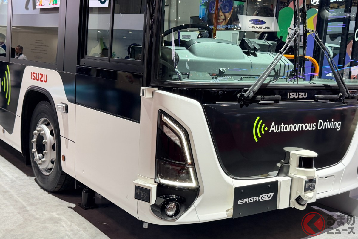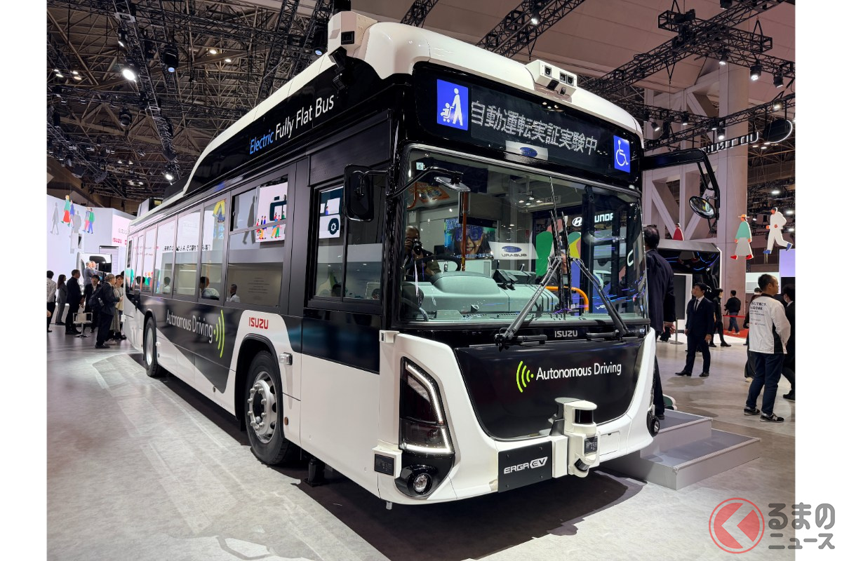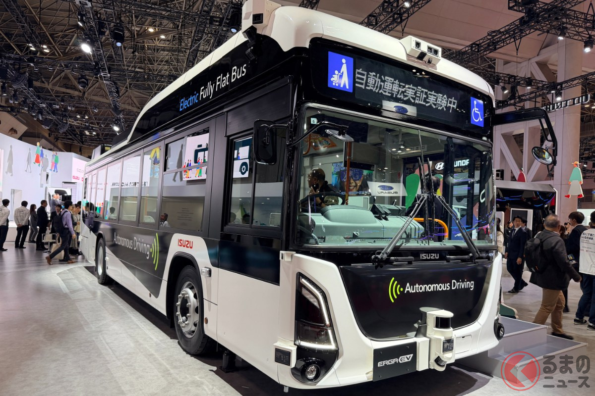 いすゞが「エルガEV 自動運転バス」を世界初公開! “段差ゼロ”のフルフラット×「自動運転」の“静音モデル”! 新時代の「大型路線バス」をJMS2025で披露
