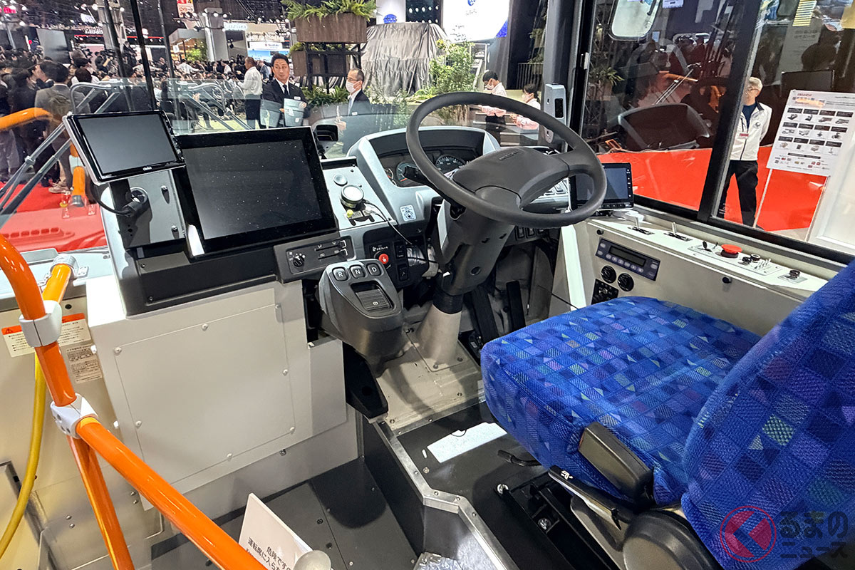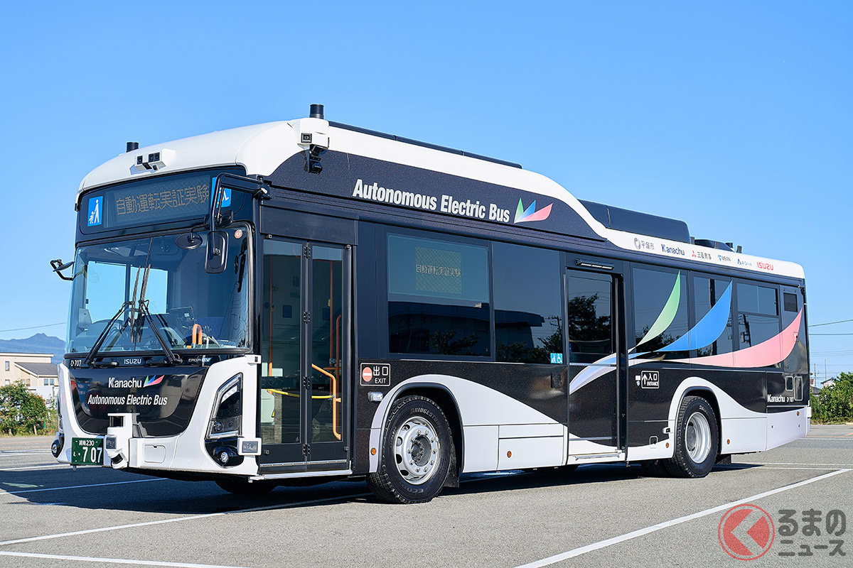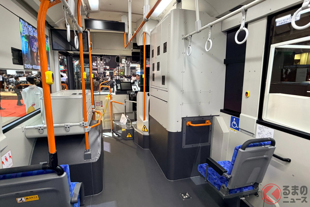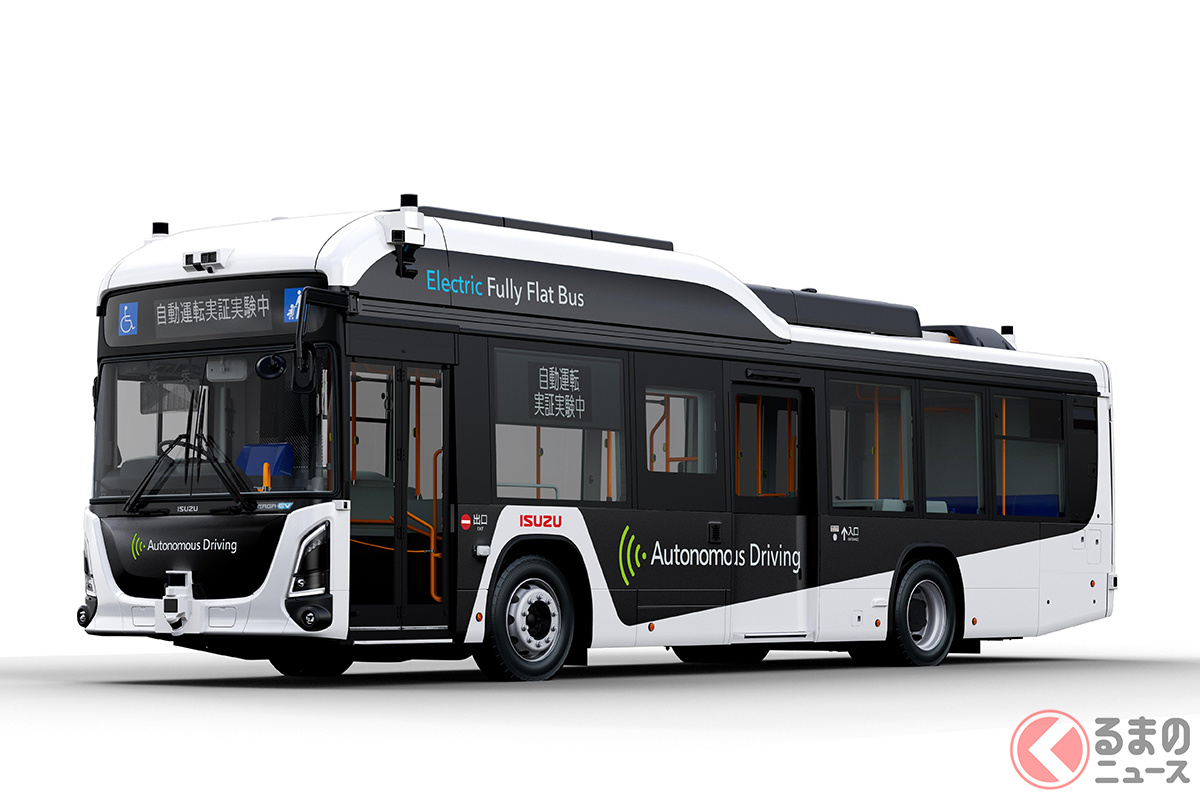 いすゞが「エルガEV 自動運転バス」を世界初公開! “段差ゼロ”のフルフラット×「自動運転」の“静音モデル”! 新時代の「大型路線バス」をJMS2025で披露