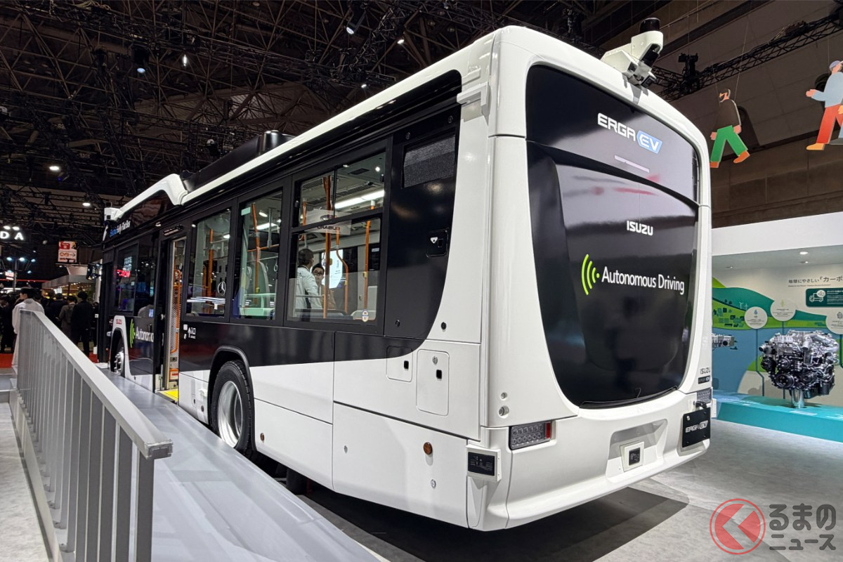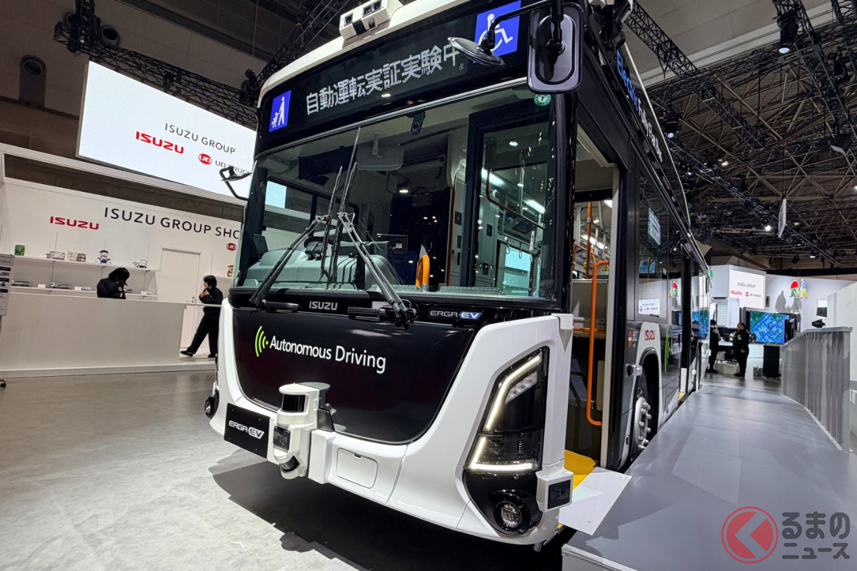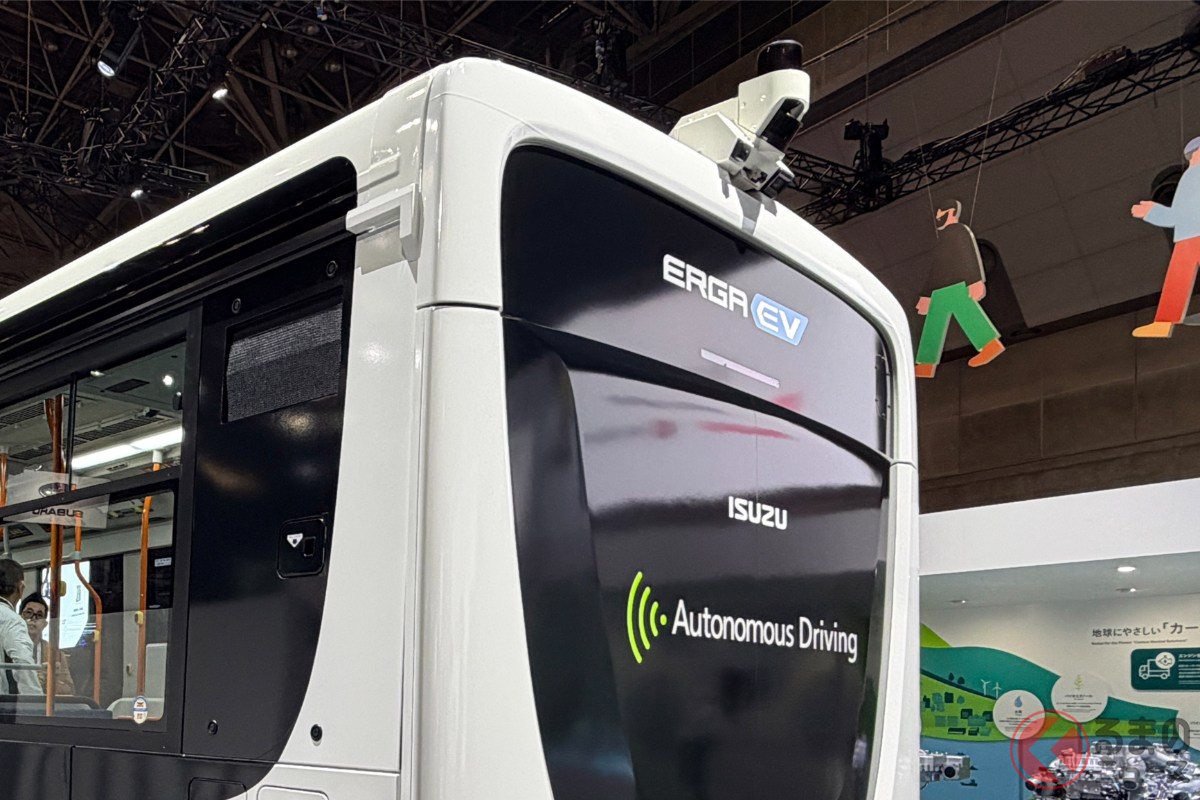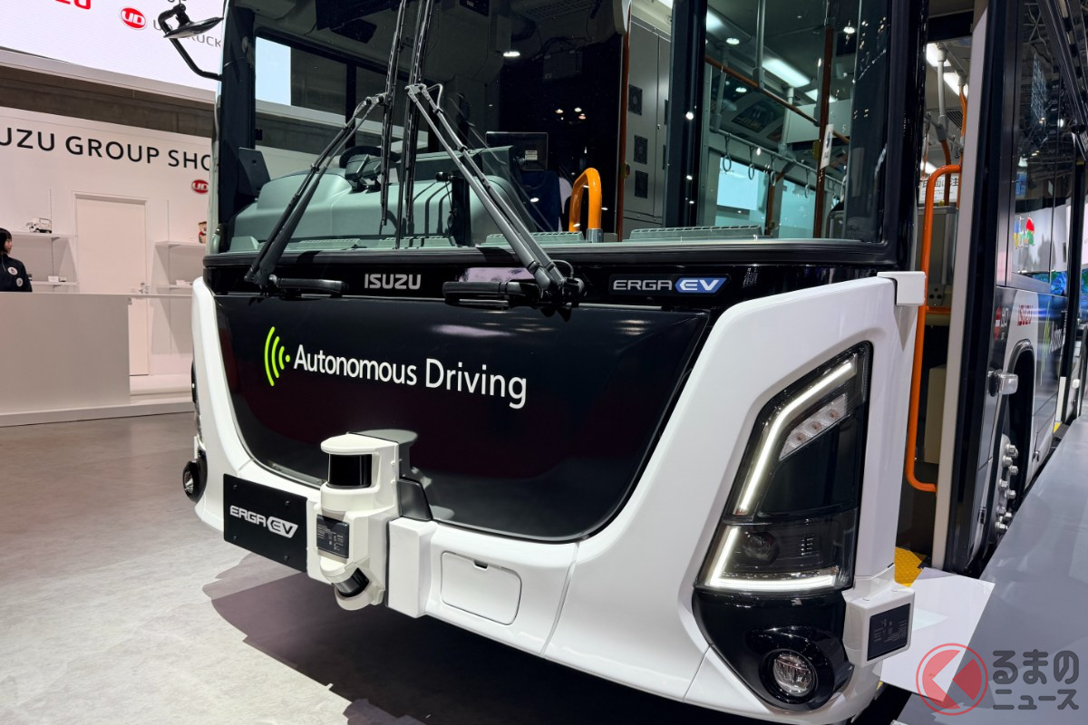 いすゞは2025年10月29日、「ジャパンモビリティショー2025」のプレスデーにおいて、国内初のBEVフルフラット路線バスをベースにした「エルガEV 自動運転バス」を世界初公開しました。