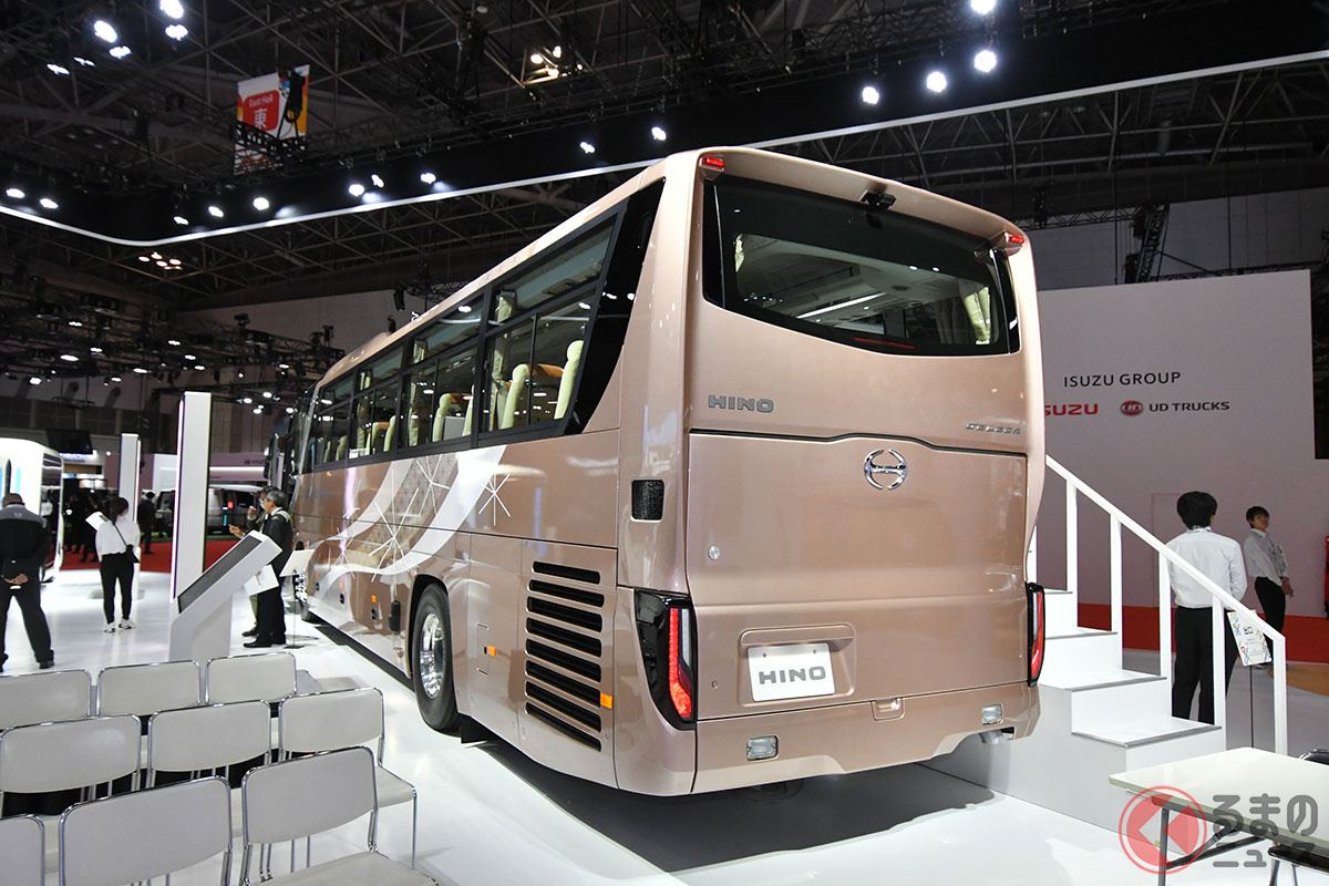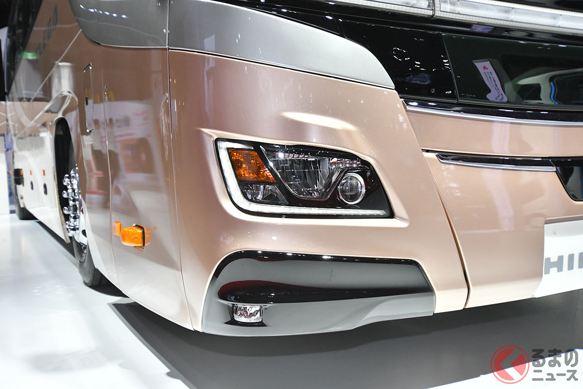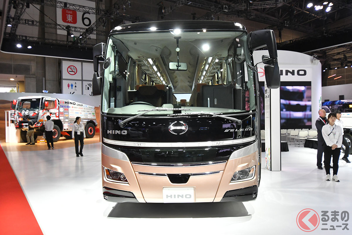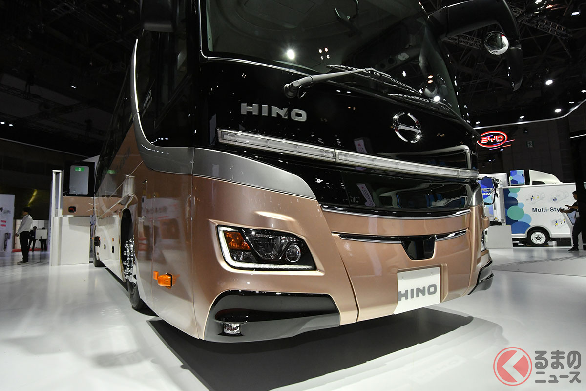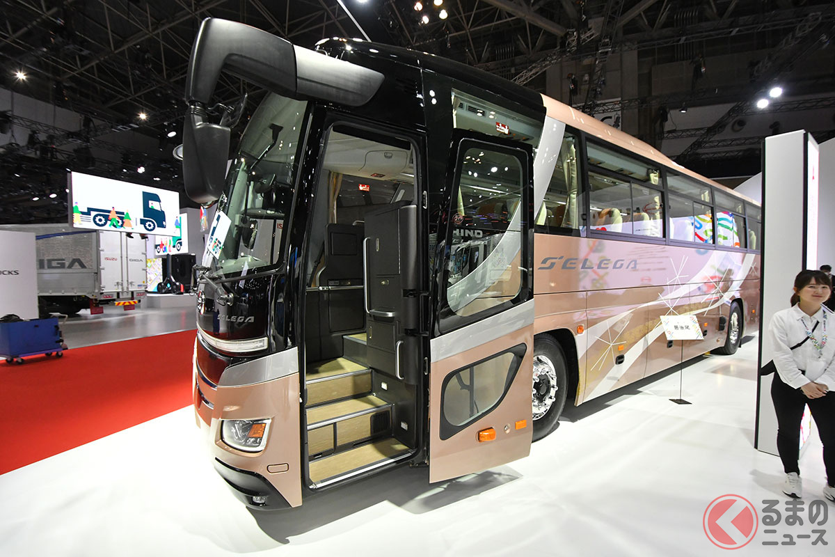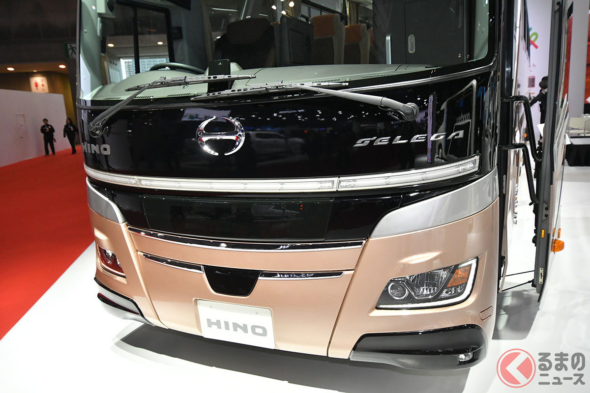 20年ぶりデザイン刷新! 日野が「新たな精悍モデル」を日本“初”公開! 斬新すぎる「門型スポイラー」×新12速AMT搭載で燃費向上! 上質な「キング・オブ・観光バス」新セレガ JMSで初披露