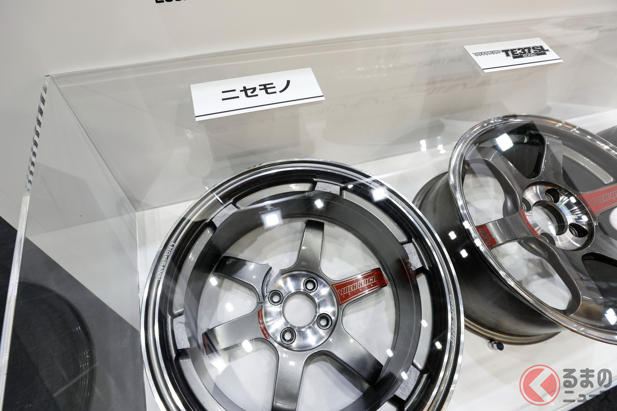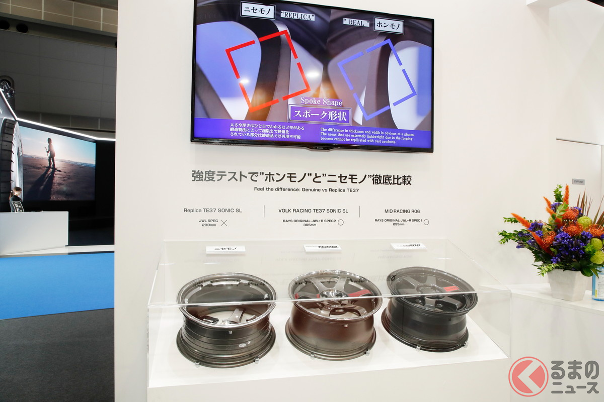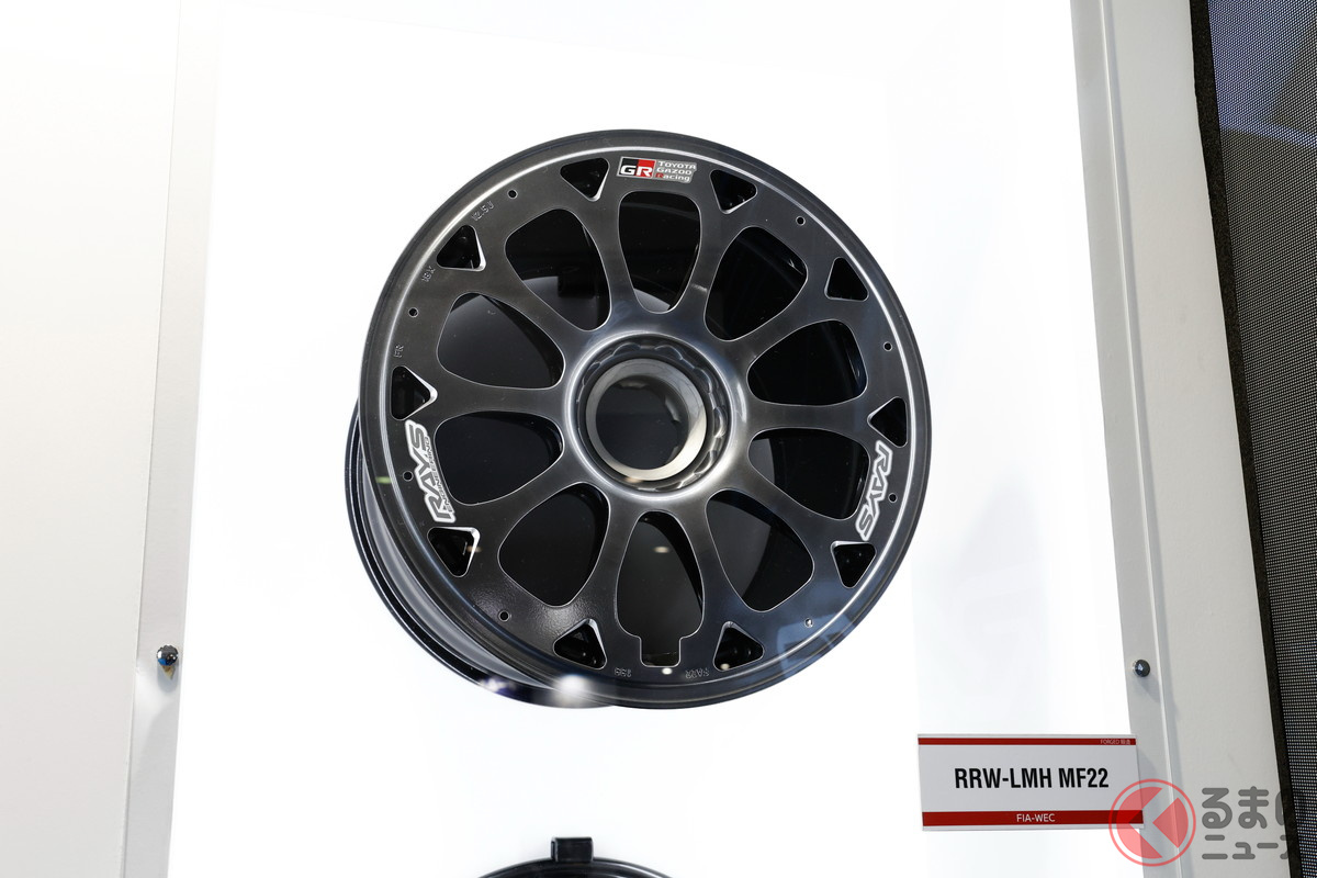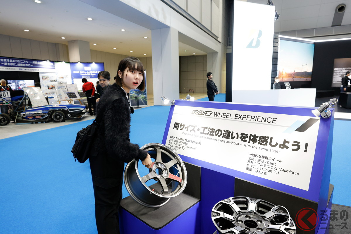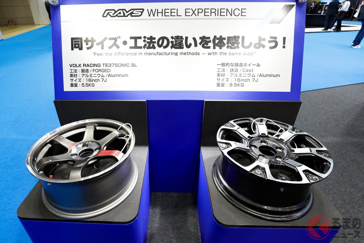 レイズが「ジャパンモビリティショー2025」に出展し、同社を象徴するVOLK RACING TE37からTOYOTA GAZOO Racingが使用するレーシングホイールまで、さまざまな展示をしています。ホイールの重さ比較では、大きな見た目とは裏腹に、実はレース向けの方が市販車向けよりも軽いことも体感できます。