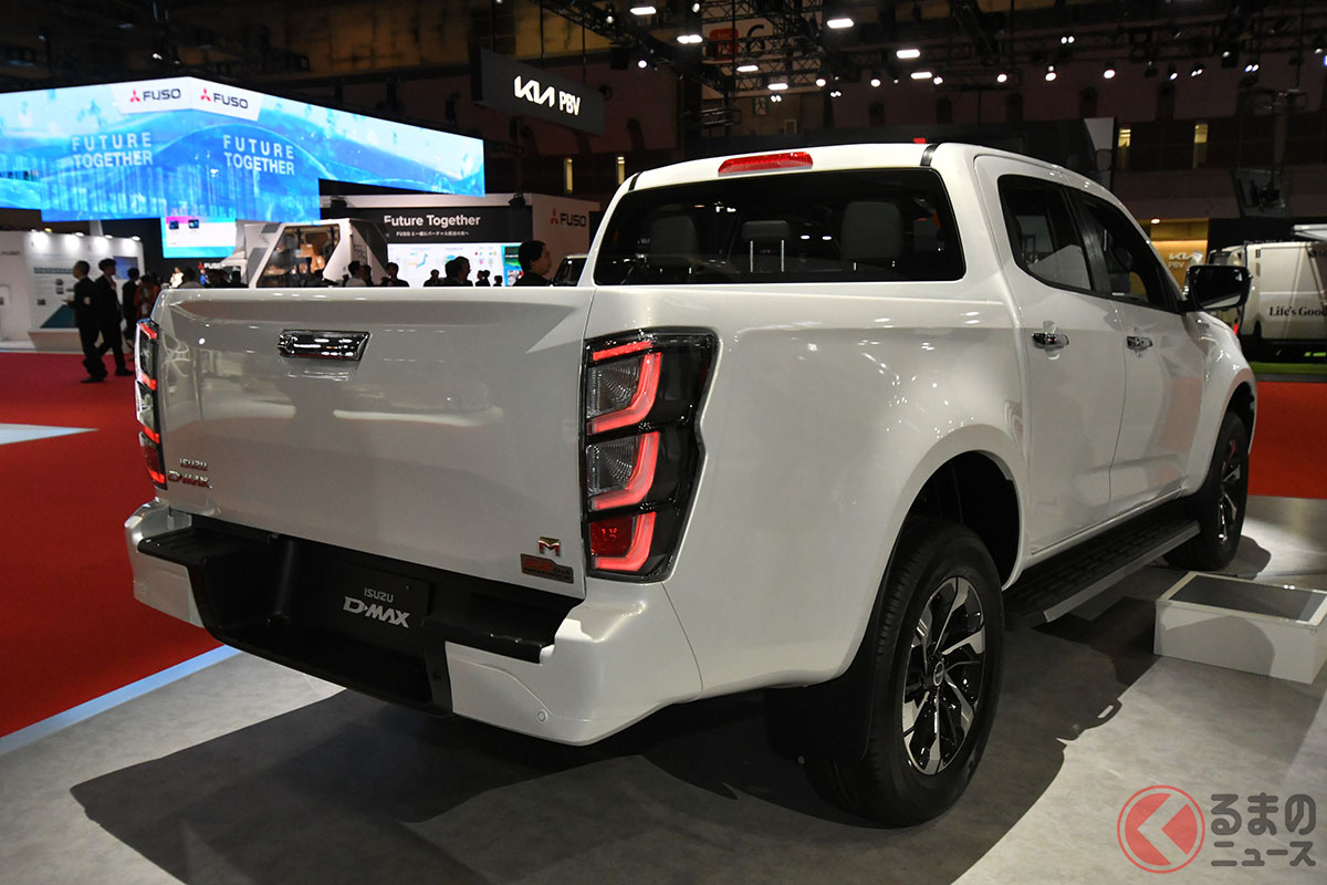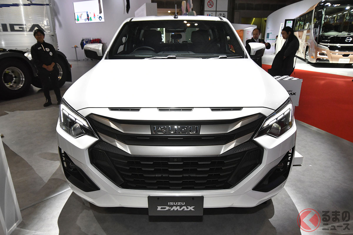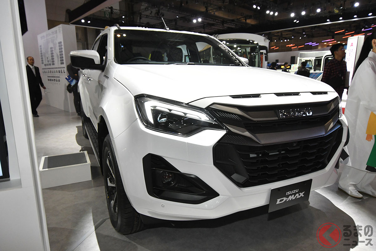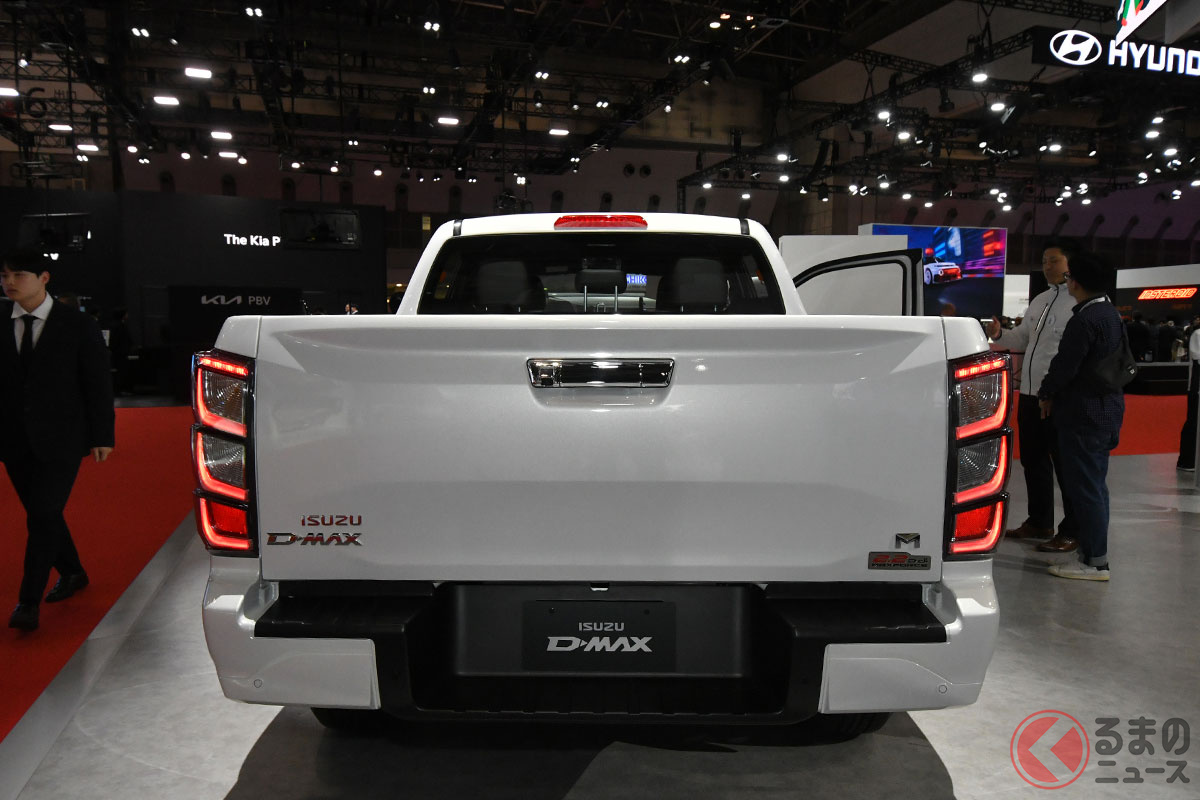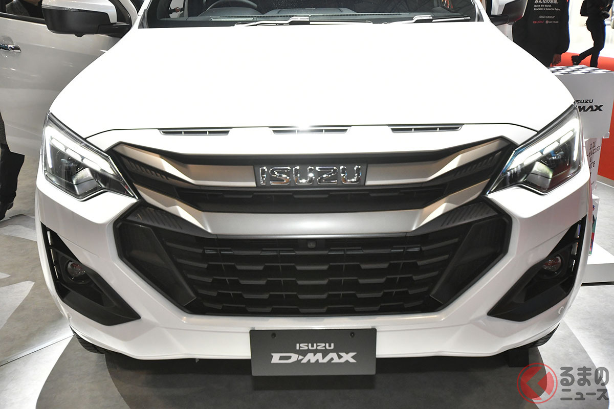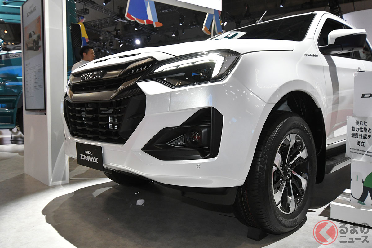 いすゞが「最新4ドア・5人乗り4WD」実車展示! 精悍V字グリル×全長5m超え「ド迫力ボディ」がカッコイイ! 6速MTもある「D-MAX」タイ製ピックアップをJMSで披露