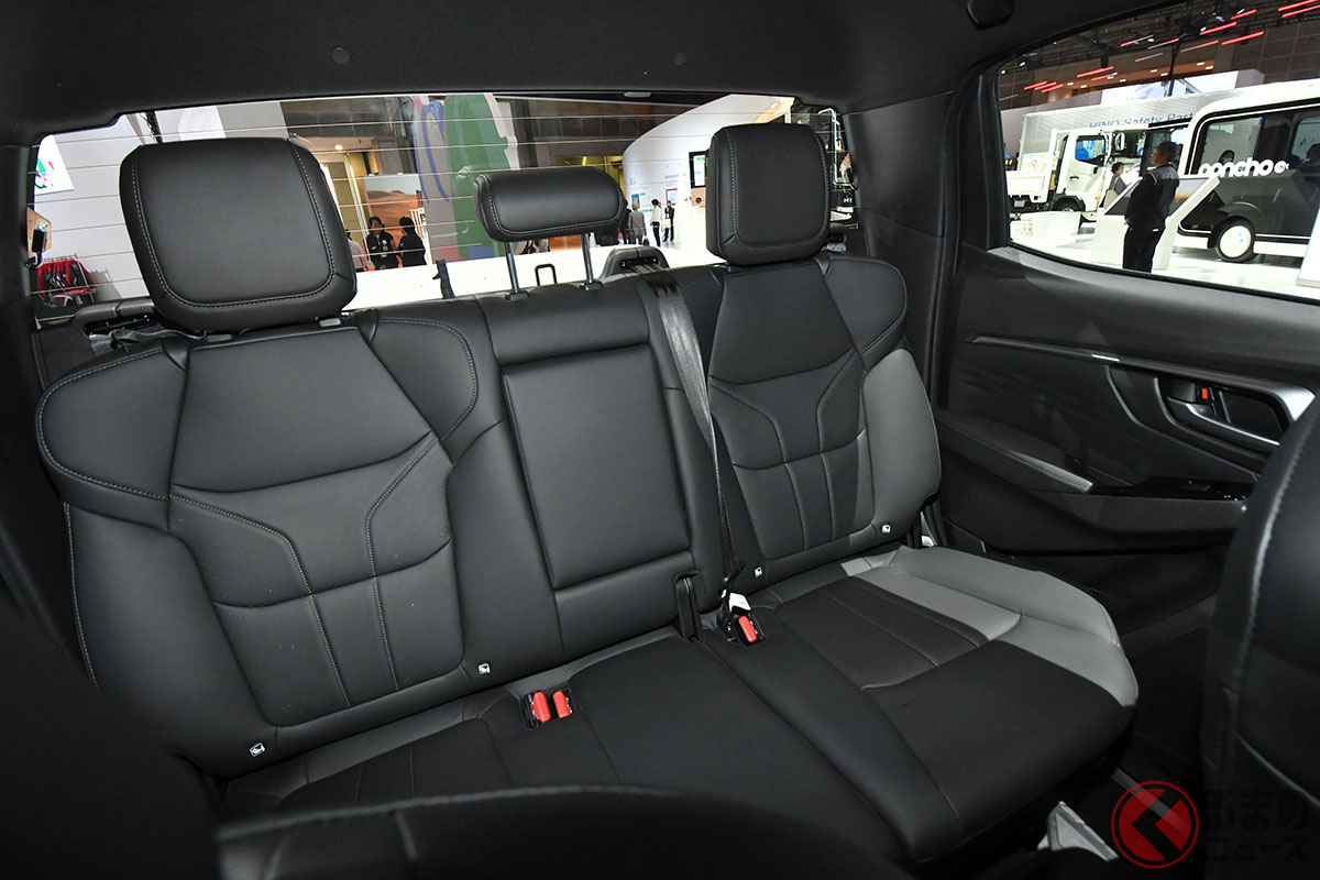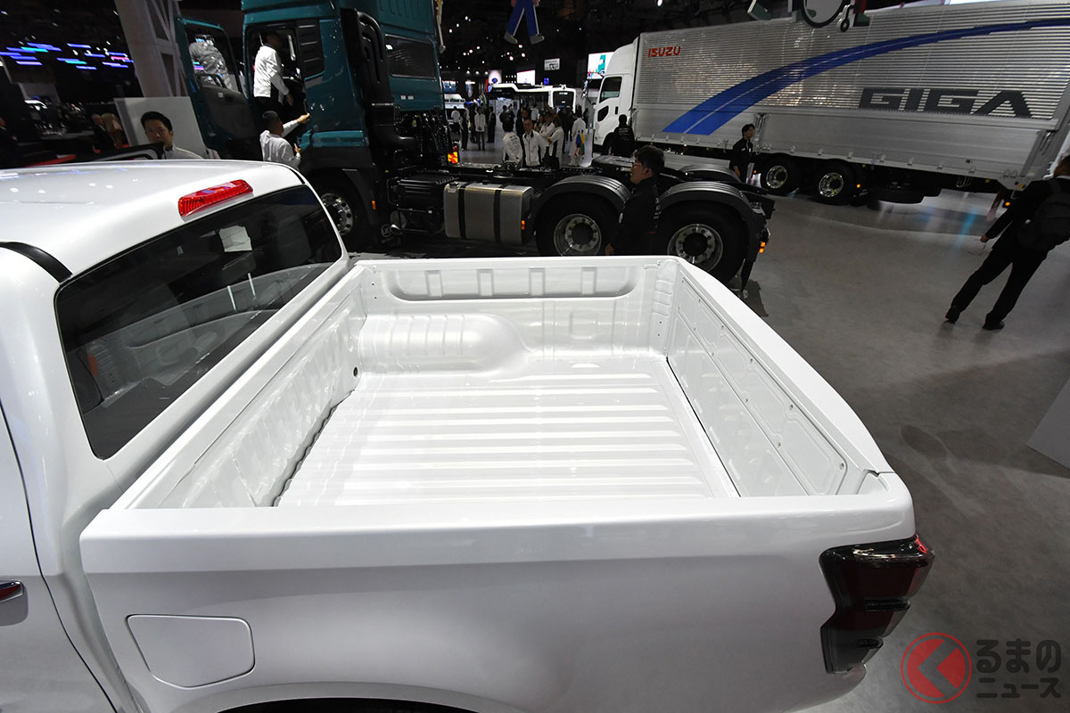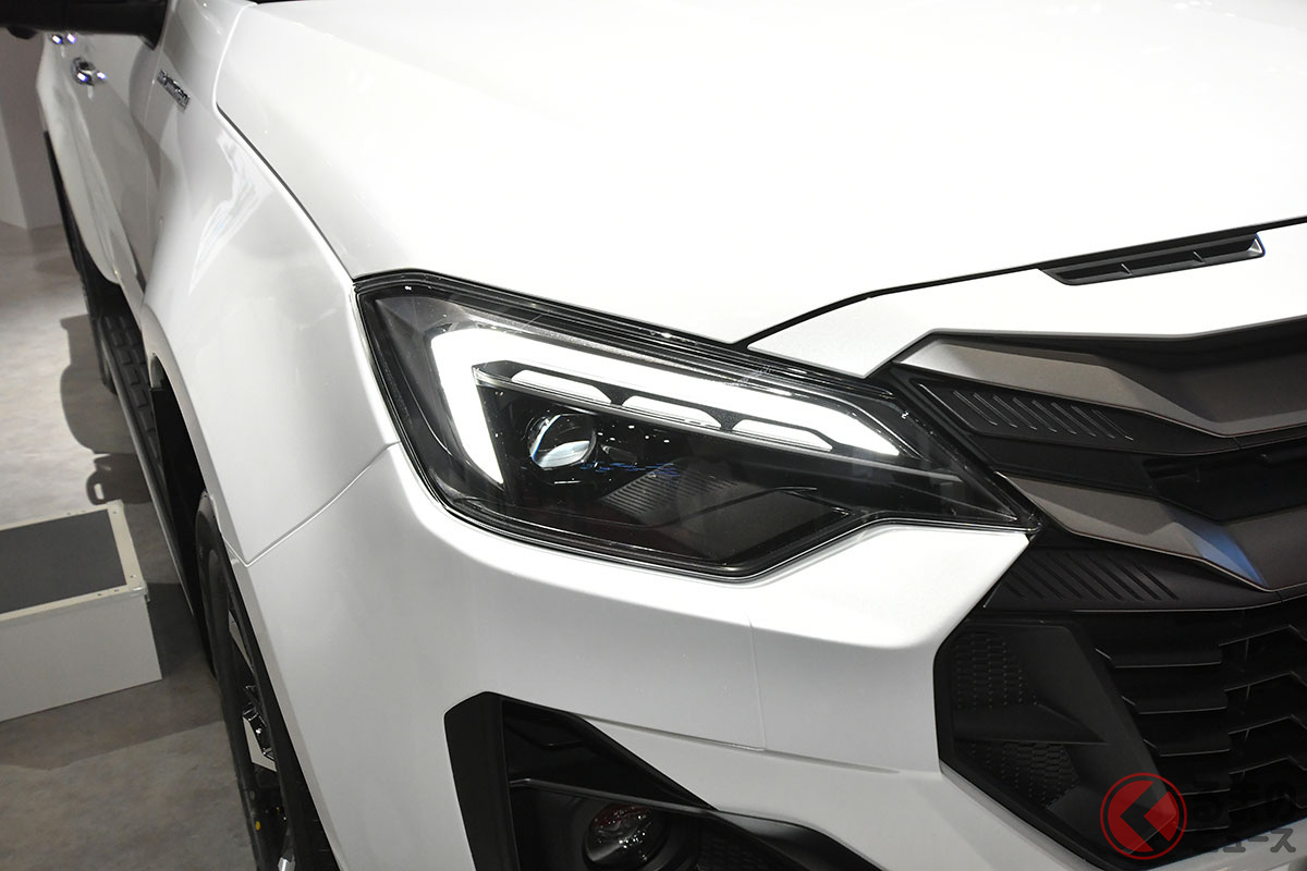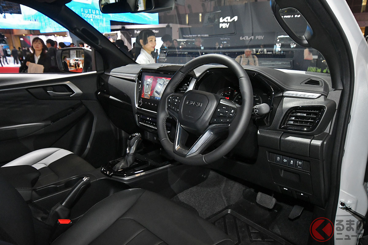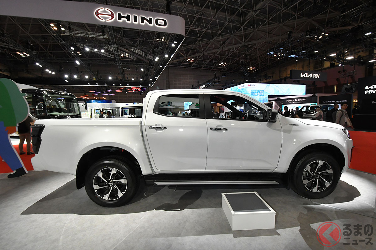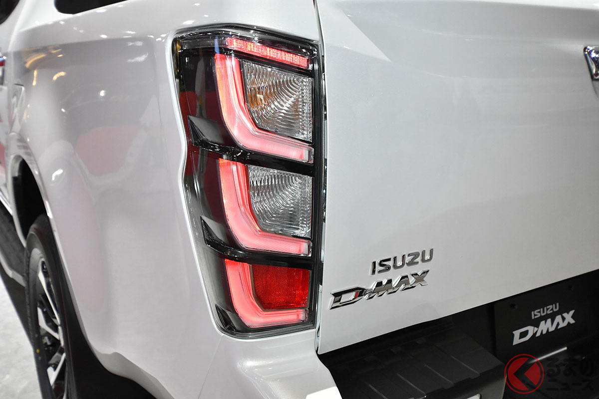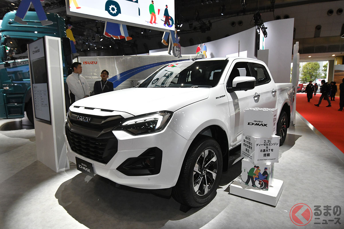 いすゞが「最新4ドア・5人乗り4WD」実車展示! 精悍V字グリル×全長5m超え「ド迫力ボディ」がカッコイイ! 6速MTもある「D-MAX」タイ製ピックアップをJMSで披露
