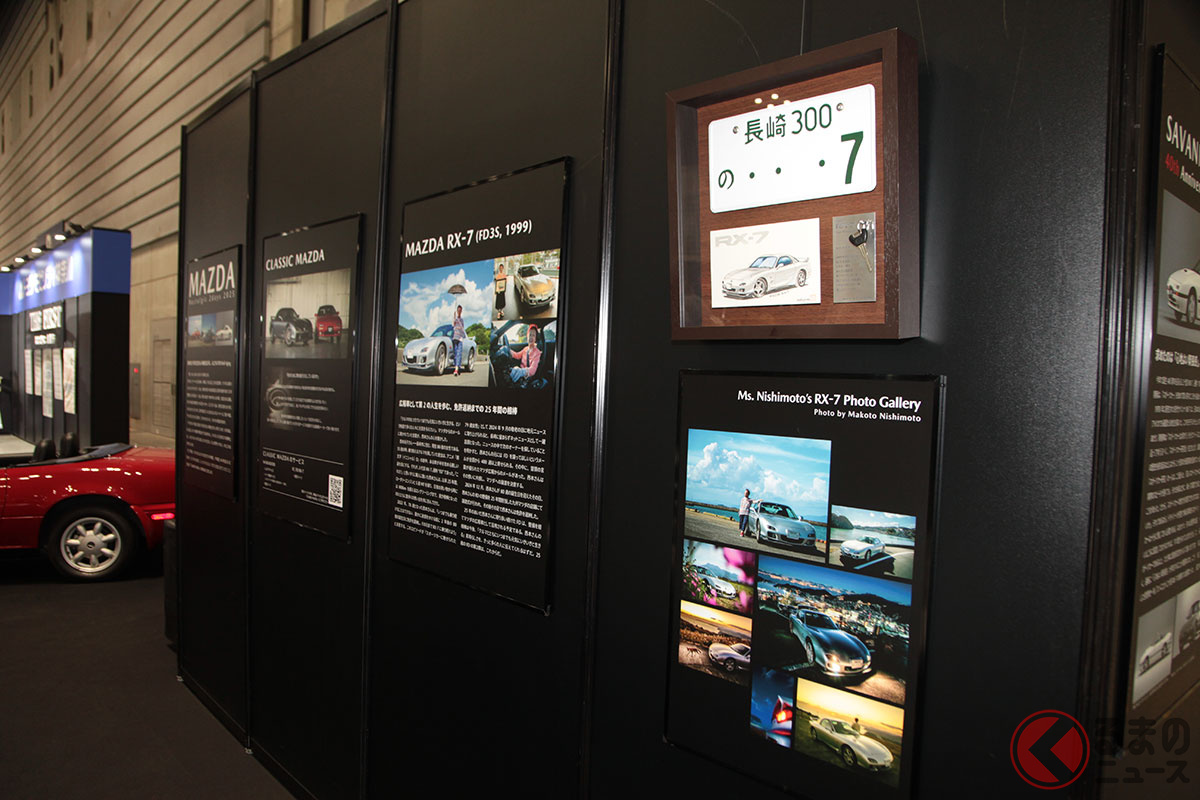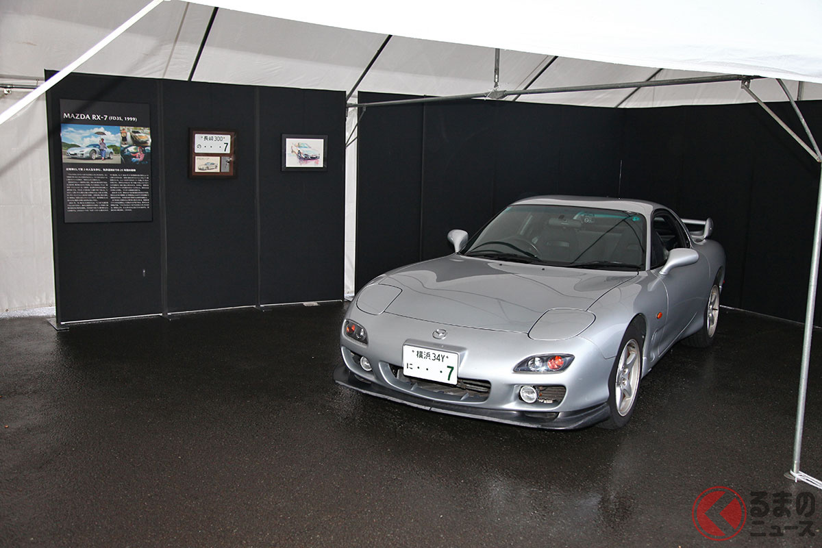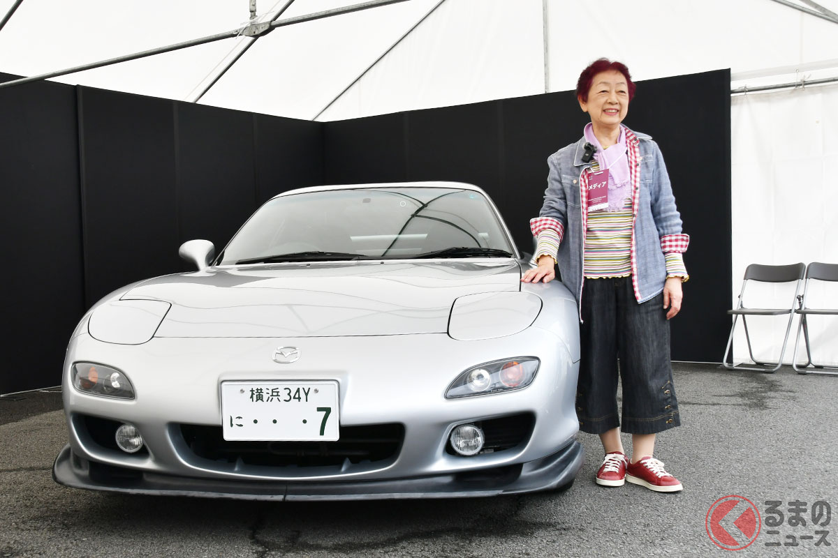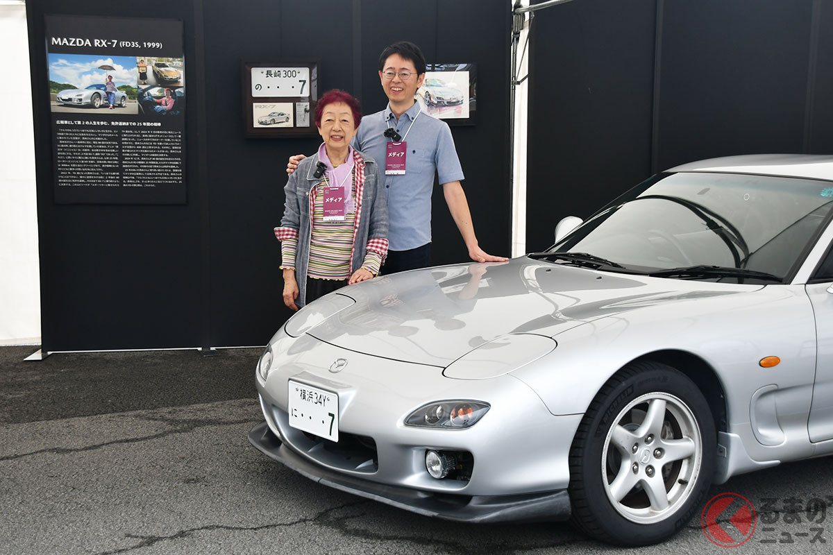 マツダ「“大切”なRX-7」を実車展示! 5速MT×流麗ボディの「2ドアスポーツカー」は「80歳女性」が25年所有! 特別な“7”ナンバーで第二の人生を歩む「FD」 JMSで展示