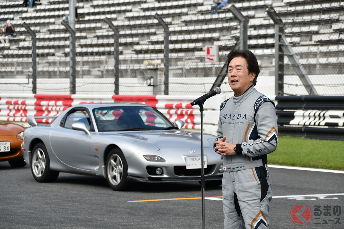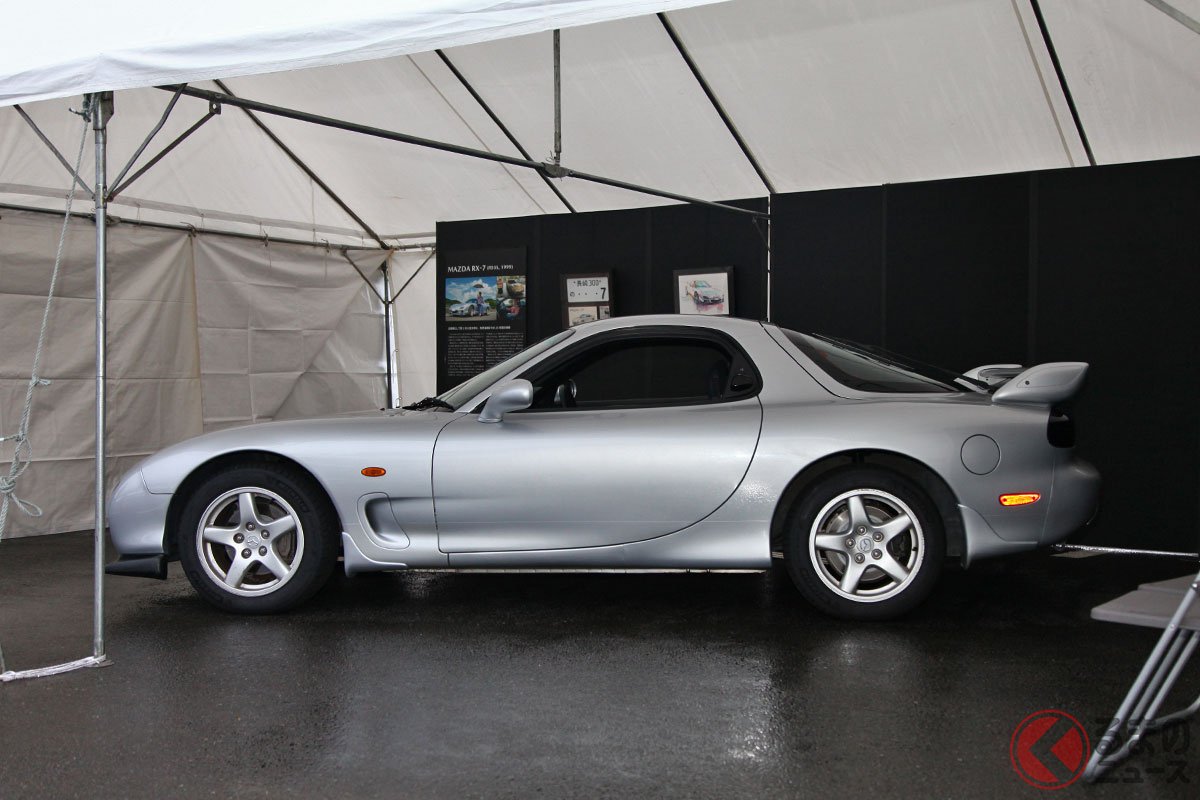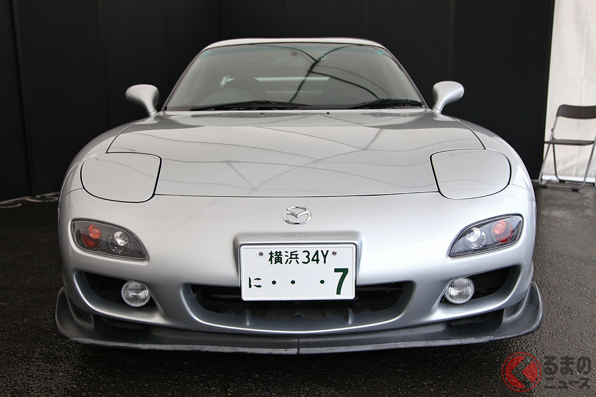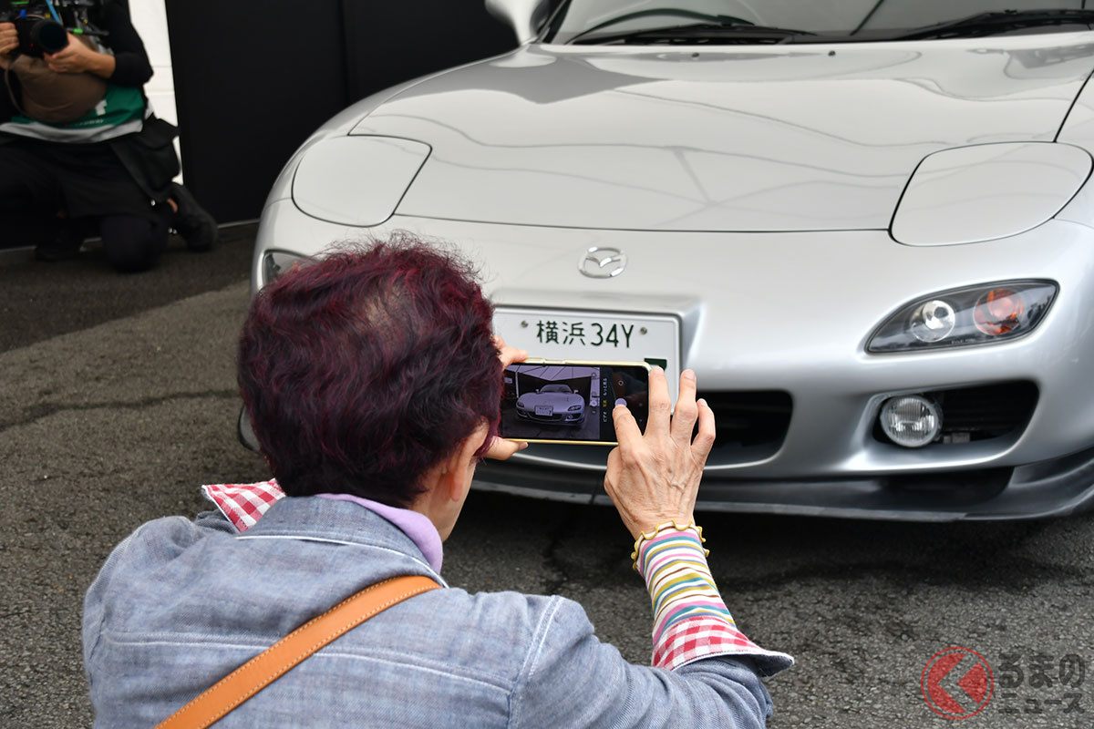 マツダ「“大切”なRX-7」を実車展示! 5速MT×流麗ボディの「2ドアスポーツカー」は「80歳女性」が25年所有! 特別な“7”ナンバーで第二の人生を歩む「FD」 JMSで展示