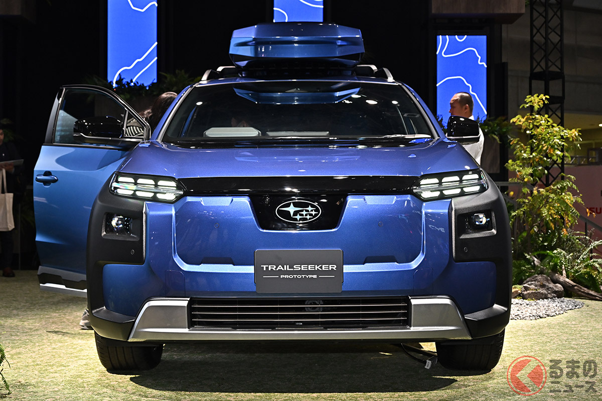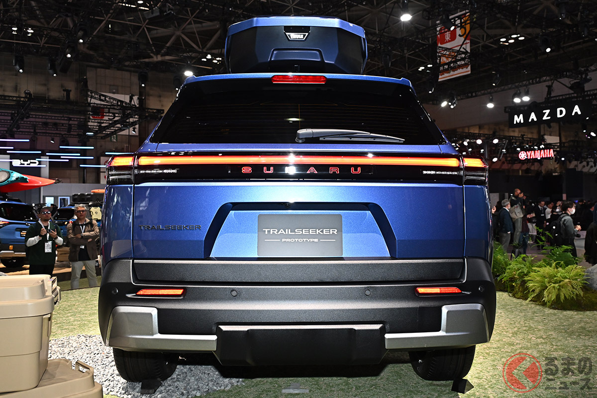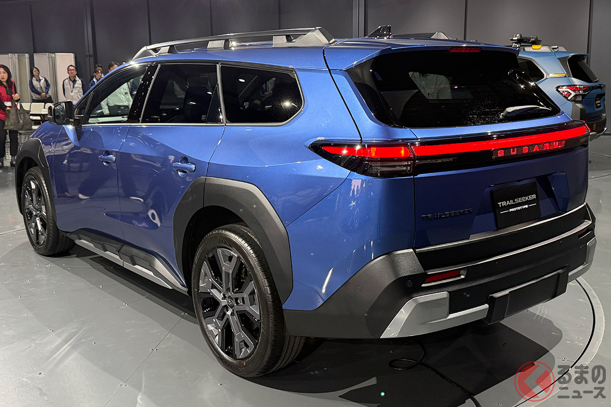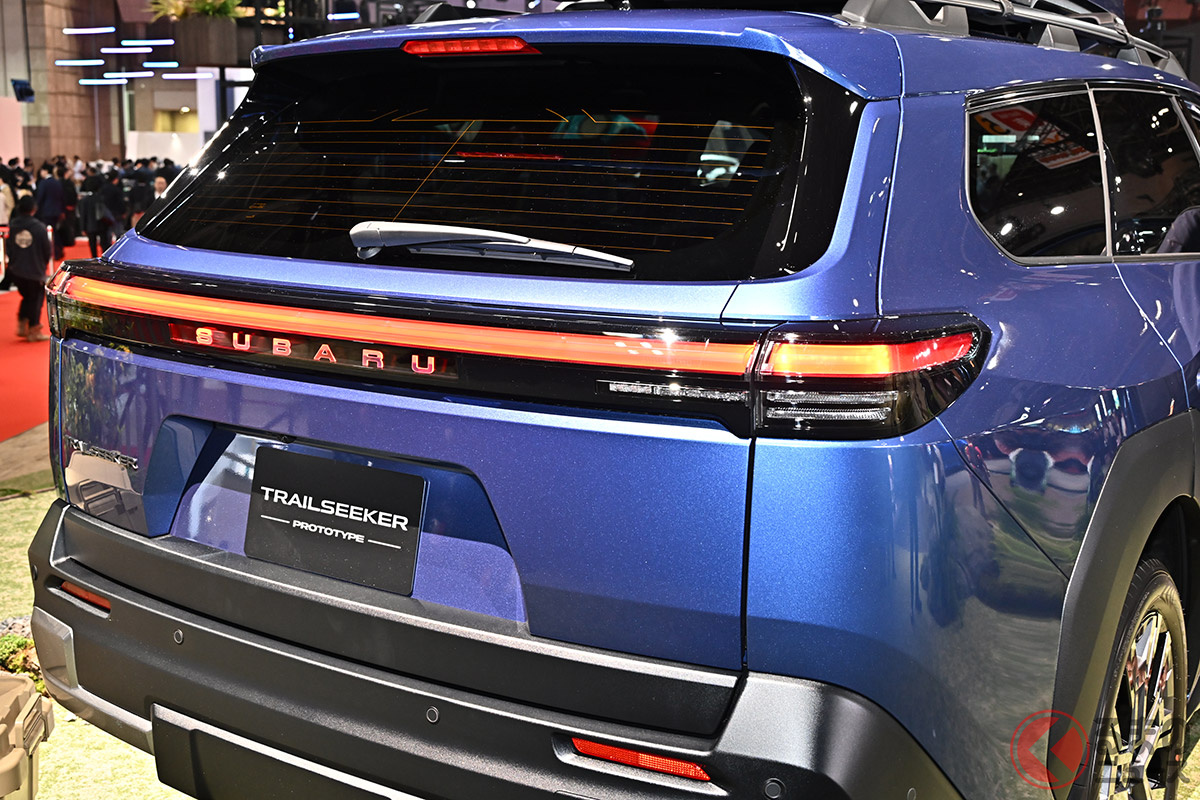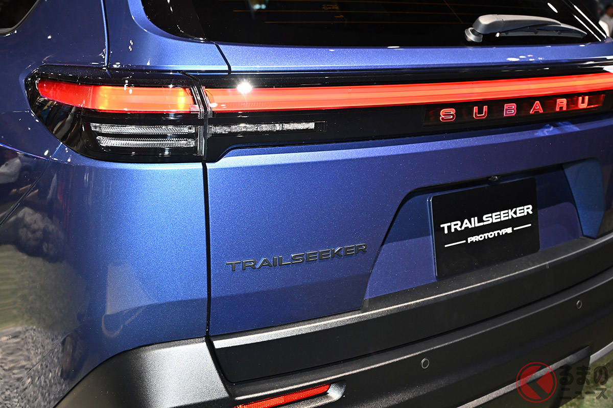 スバル「新型ワゴンSUV」26年発売へ! 光を放つ「前後エンブレム」דアウトバック並み”の広びろ荷室を採用! パワフル&加速感スゴいパワトレ搭載した新型「トレイルシーカー」とは!