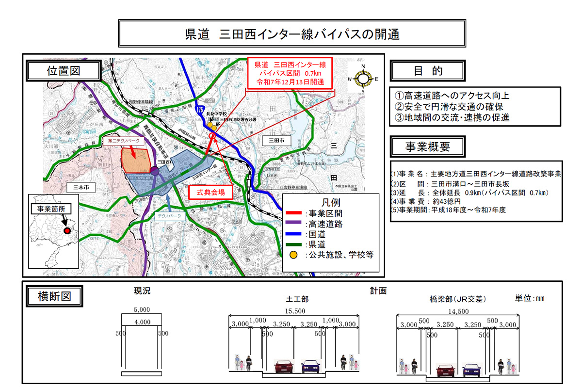 兵庫県は、主要地方道「三田西インター線」のバイパスを2025年12月13日に開通します。国道176号と舞鶴若狭道・三田西ICを結ぶ約0.7kmの区間で、長年の課題だった狭隘な現道や踏切を回避 。物流の効率化と地域交通の安全性が大きく向上します。