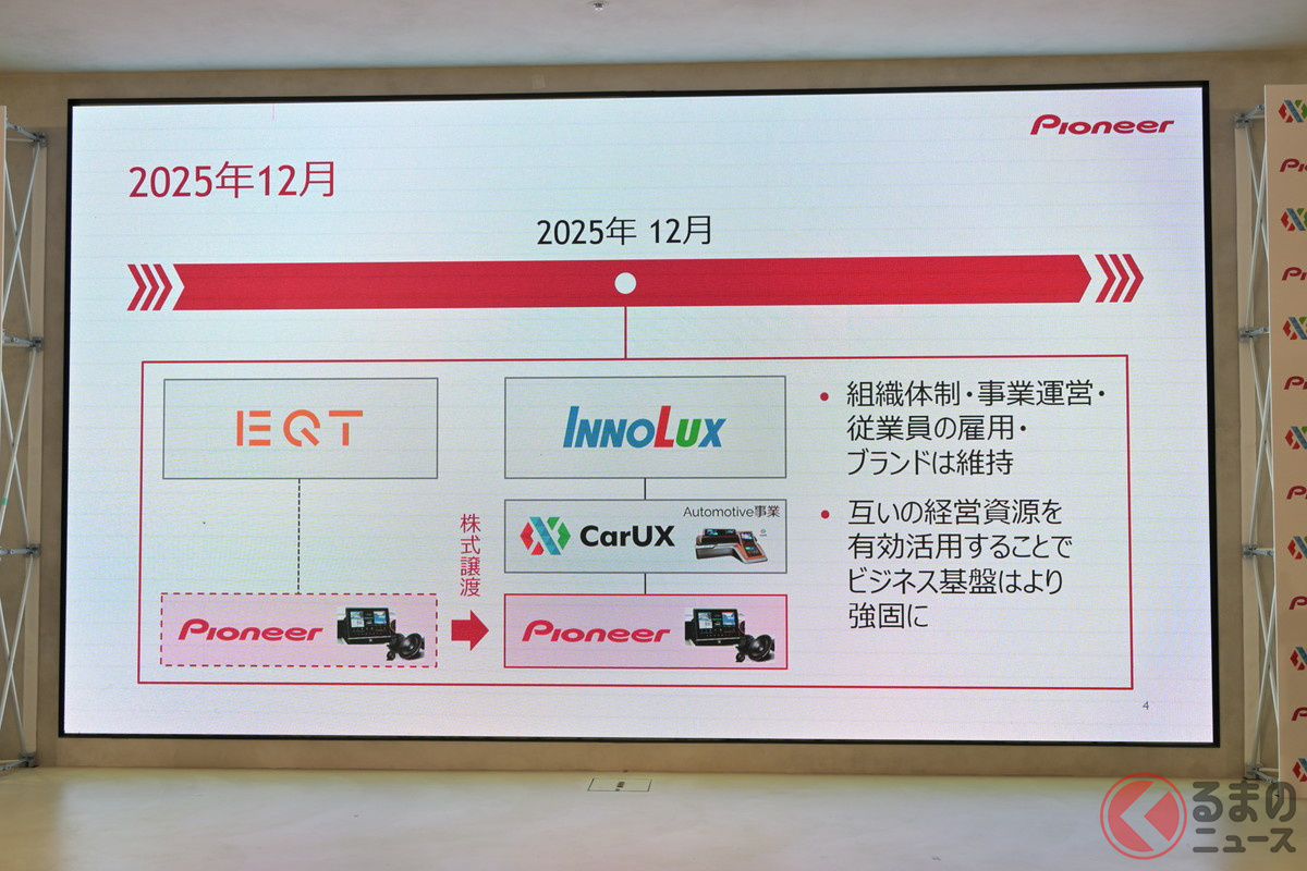 カーナビや音響システムなどで知られるパイオニアは2025年12月4日に都内で記者会見を開き、1日に台湾のCarUXへの株主移行が完了したことを発表しました。会見には、パイオニアの矢原史朗社長執行役員と、CarUXのジム・ホン会長が登壇しました。