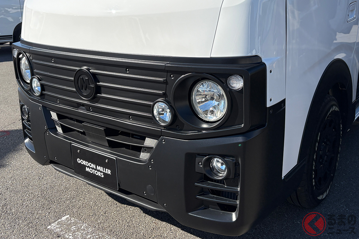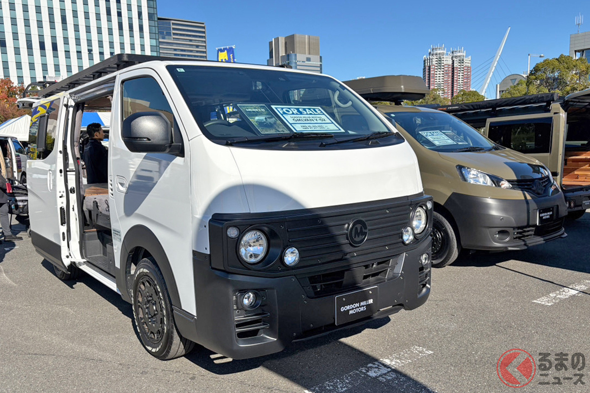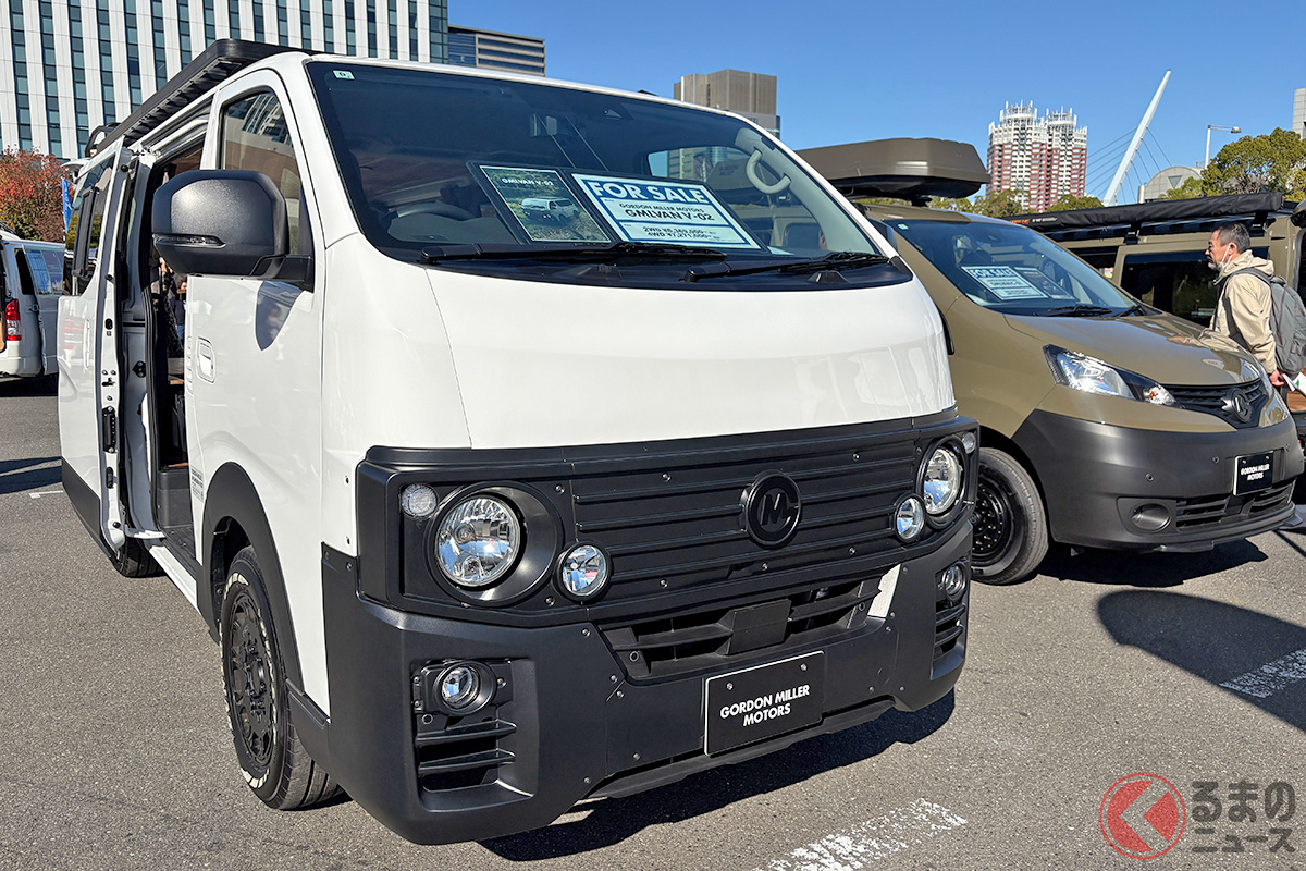 日産の「“家族3人”寝られる」バンがスゴい! 丸目ライトの「旧車顔」×全長4.7m級で「ちょうどイイサイズ」! ブラックマスク&「ウッド内装」もカッコいいゴードンミラーの“車中泊”キャラバン「GMLVAN V-02」に注目