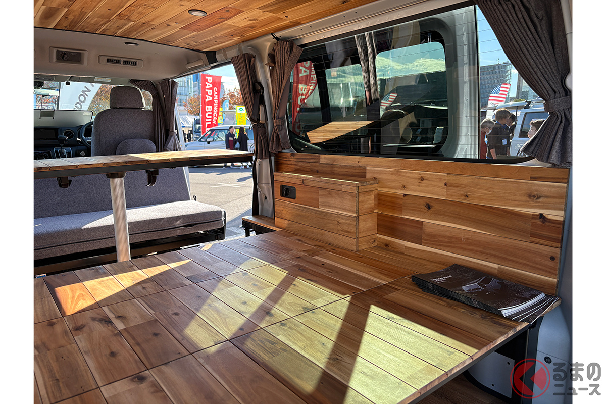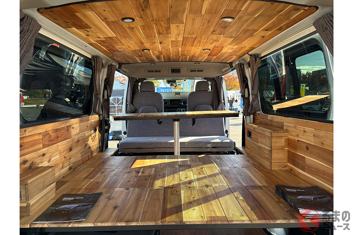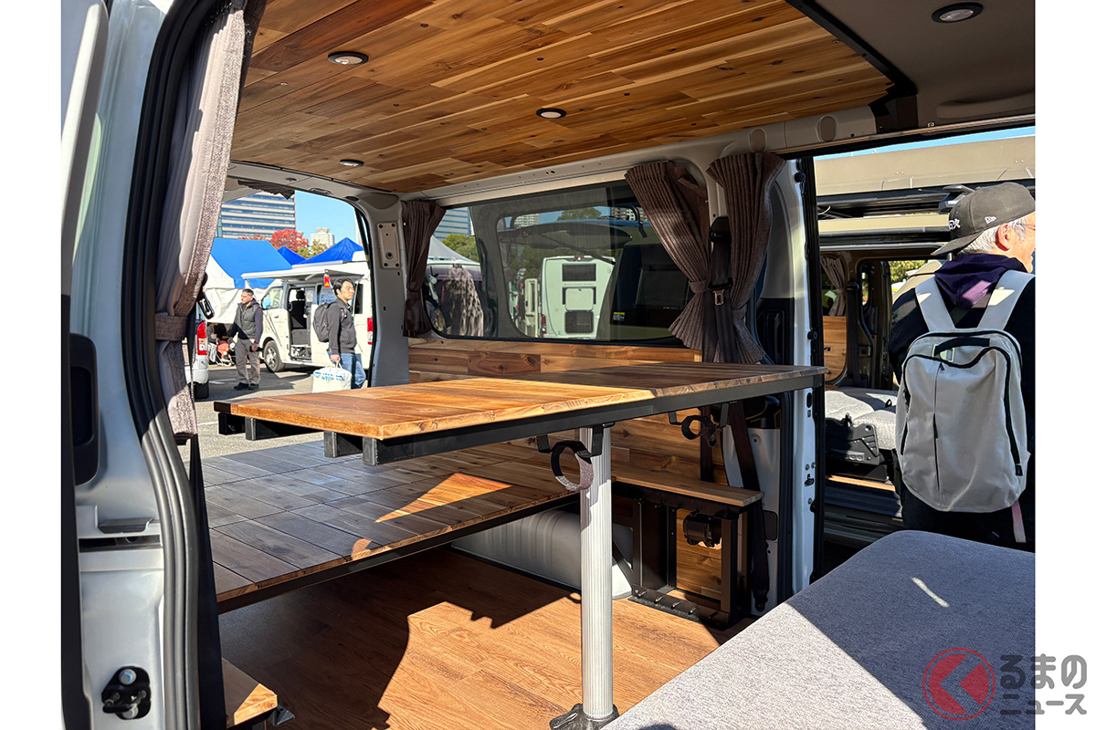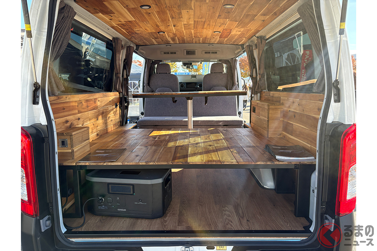 日産の「“家族3人”寝られる」バンがスゴい! 丸目ライトの「旧車顔」×全長4.7m級で「ちょうどイイサイズ」! ブラックマスク&「ウッド内装」もカッコいいゴードンミラーの“車中泊”キャラバン「GMLVAN V-02」に注目