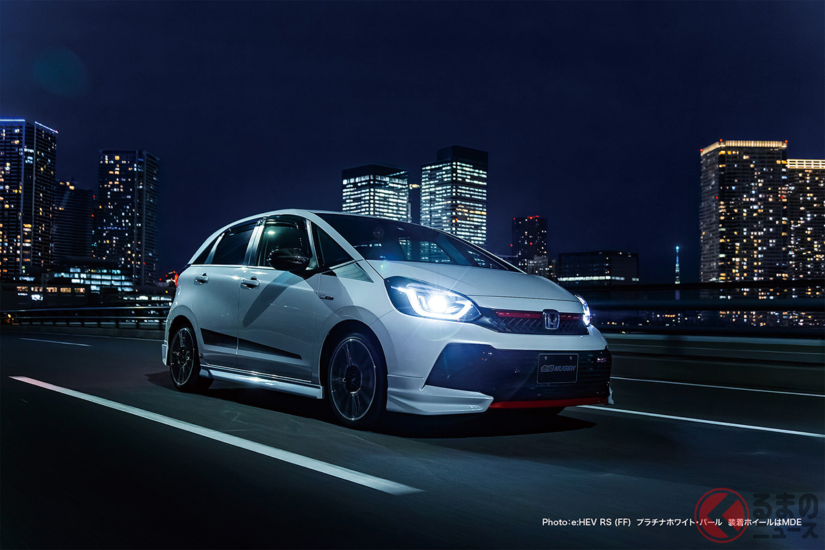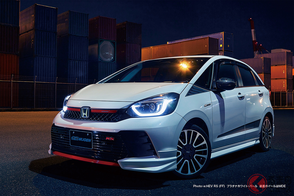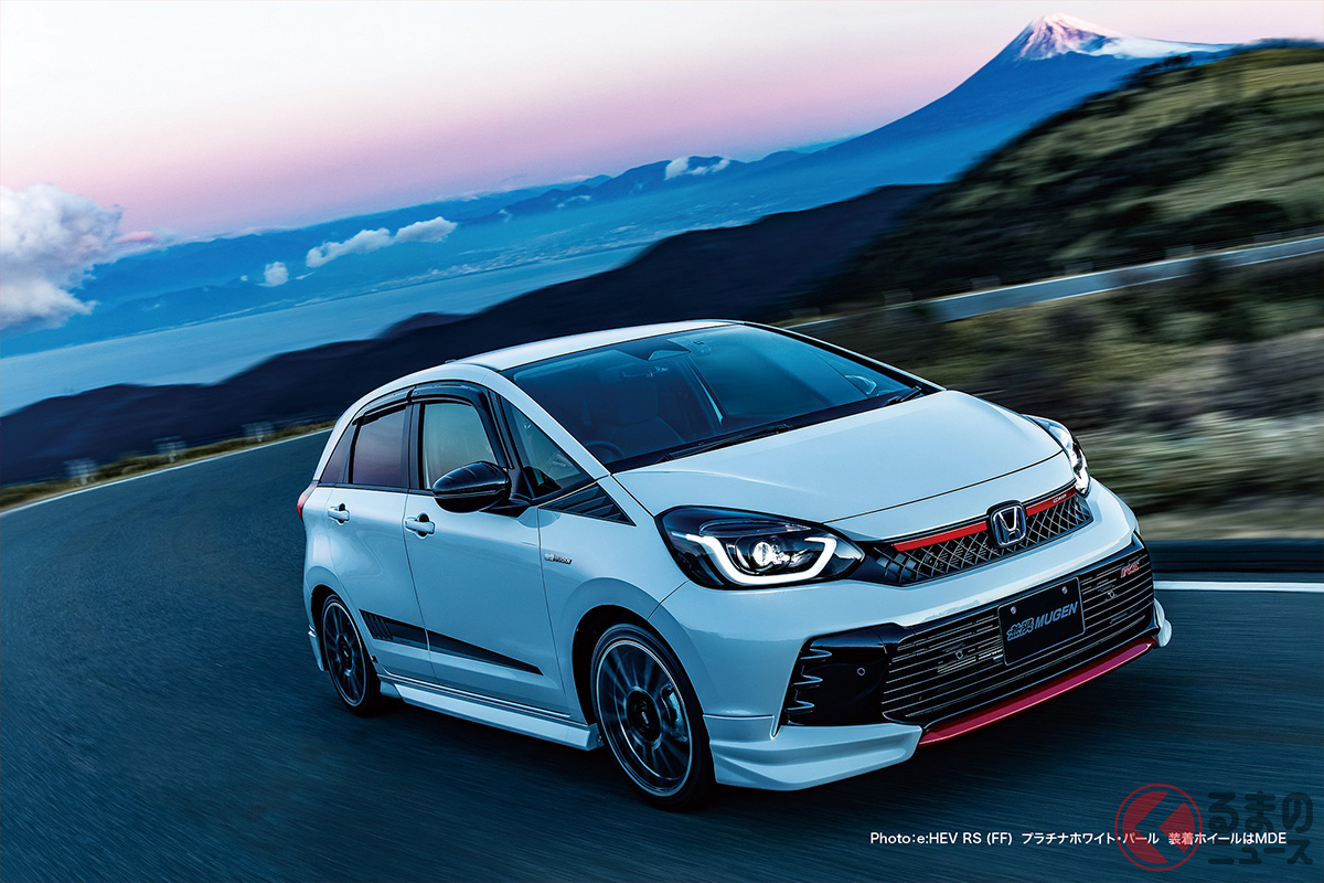 ホンダ「全長4m級コンパクトカー」“超スポーティ仕様”に注目! ワイド感強めな「エアロ」で超カッコいい! スゴい「バイザー」もある「“無限”フィット」カスタマイズアイテムとは