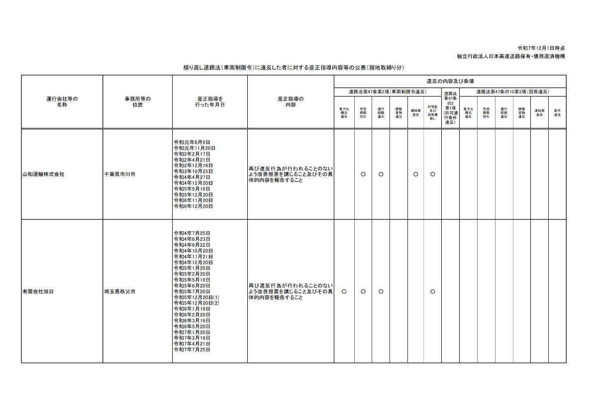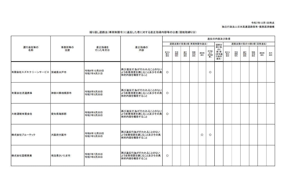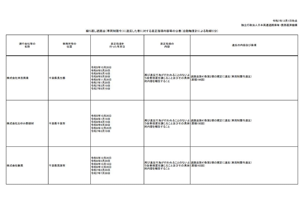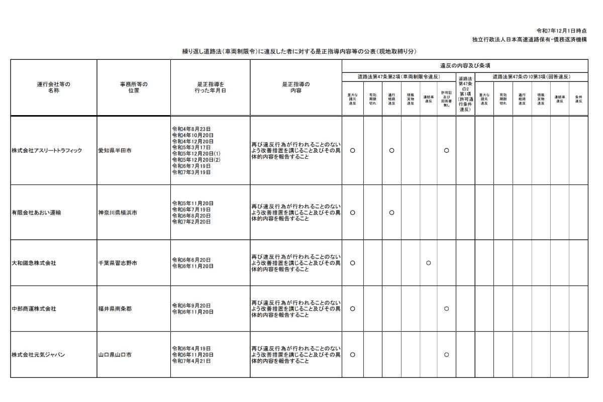 NEXCO西日本および日本高速道路保有・債務返済機構は、高速道路における車両制限令違反者に対する是正指導の内容を公表しました。